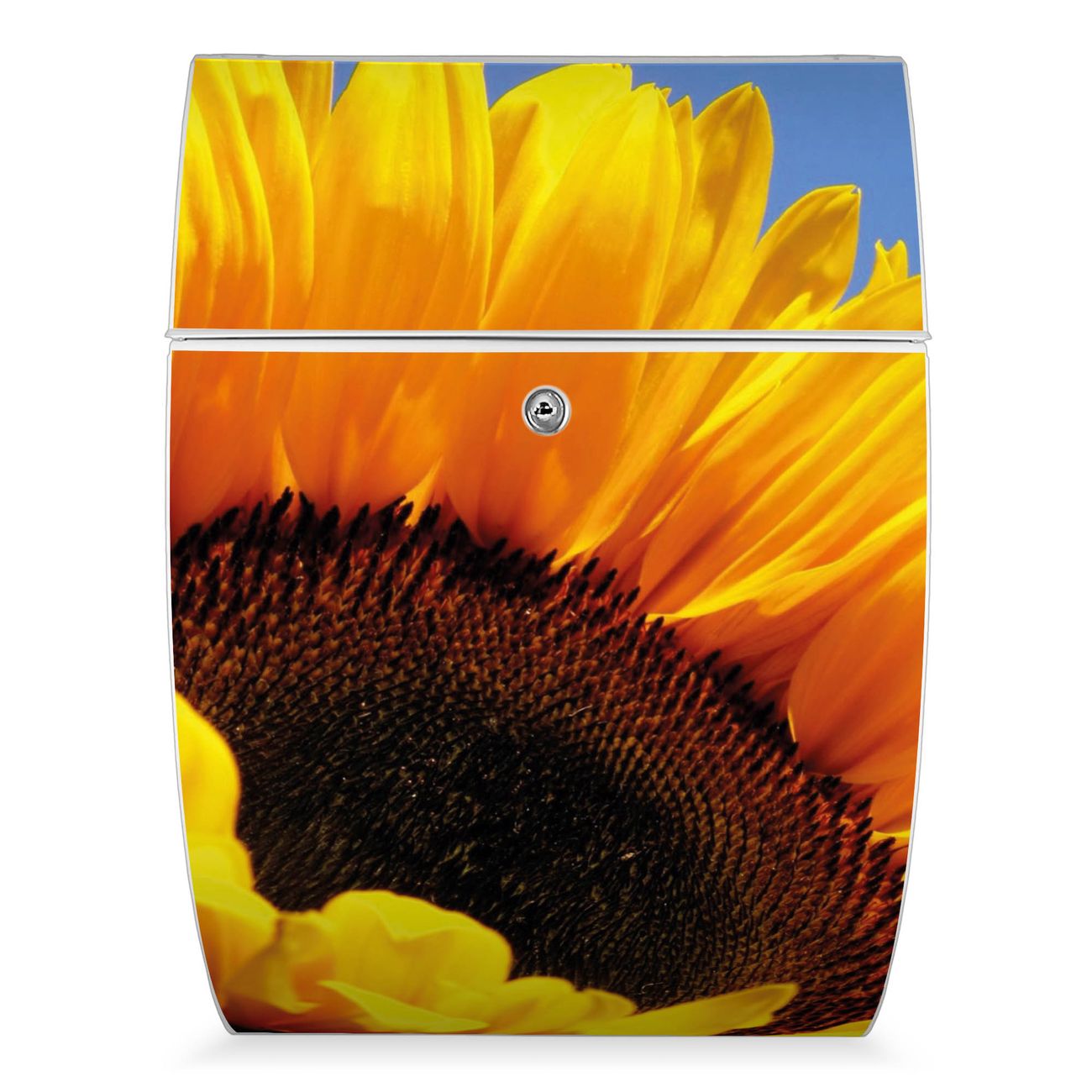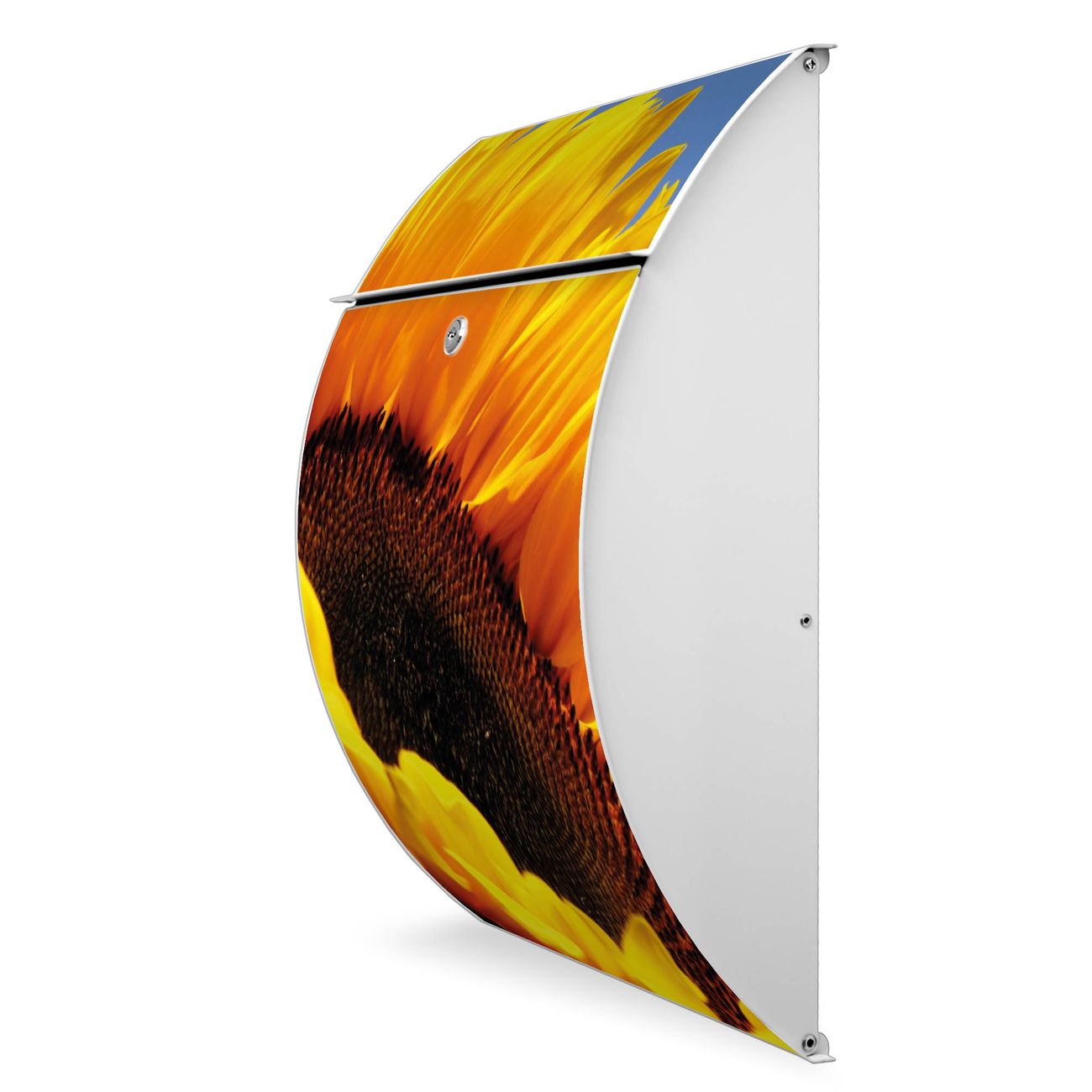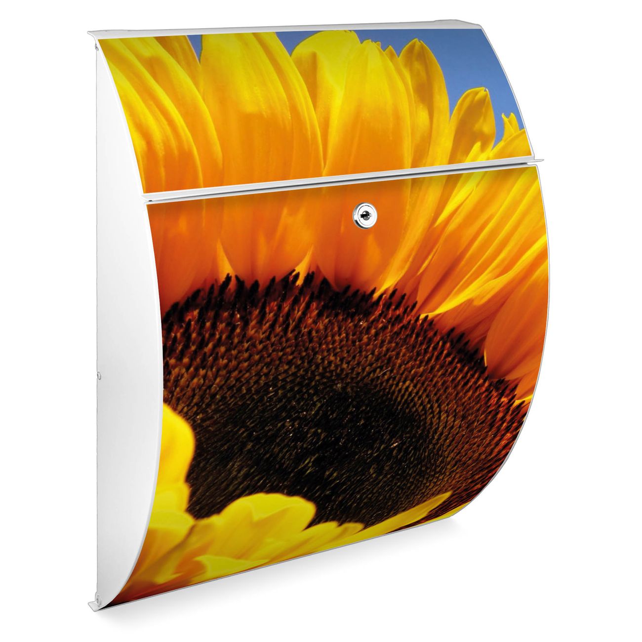 Der weiße Burg Wächter Design Briefkasten mit Motiv Sonnenblume bietet Ihnen mit seinem Fassungsvermögen genügend Platz auch für große A4 Sendungen. Auf Wunsch können Sie bei uns auch den passenden Ständer kaufen und so aus dem Wandbriefkasten einen Standbriefkasten machen.