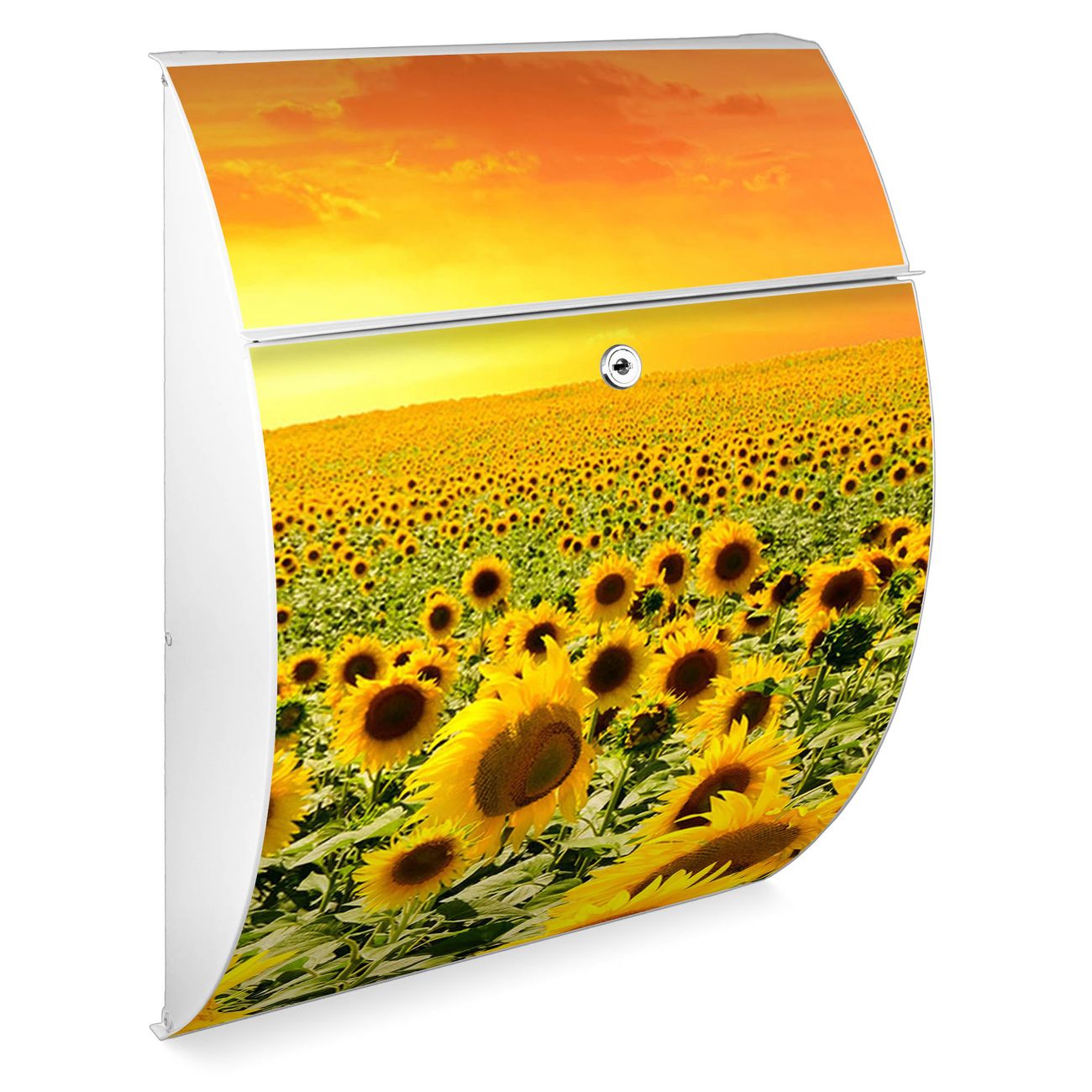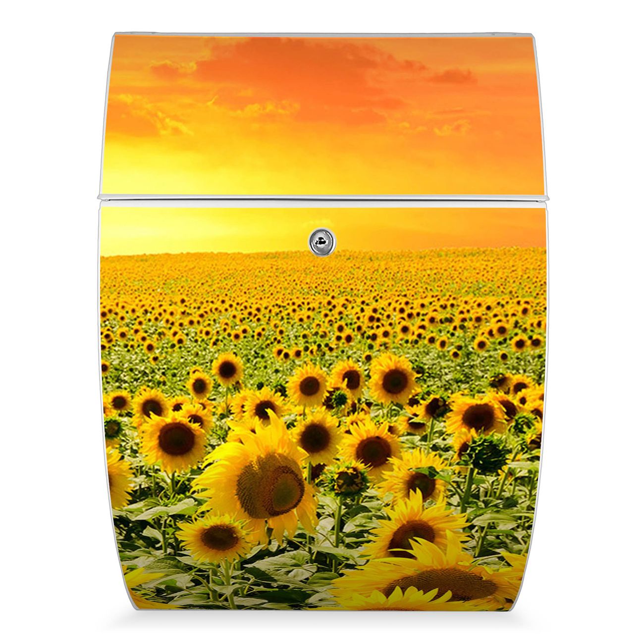 Der weiße Burg Wächter Design Briefkasten mit Motiv Sonnenblumenmeer bietet Ihnen mit seinem Fassungsvermögen genügend Platz auch für große A4 Sendungen. Auf Wunsch können Sie bei uns auch den passenden Ständer kaufen und so aus dem Wandbriefkasten einen Standbriefkasten machen.