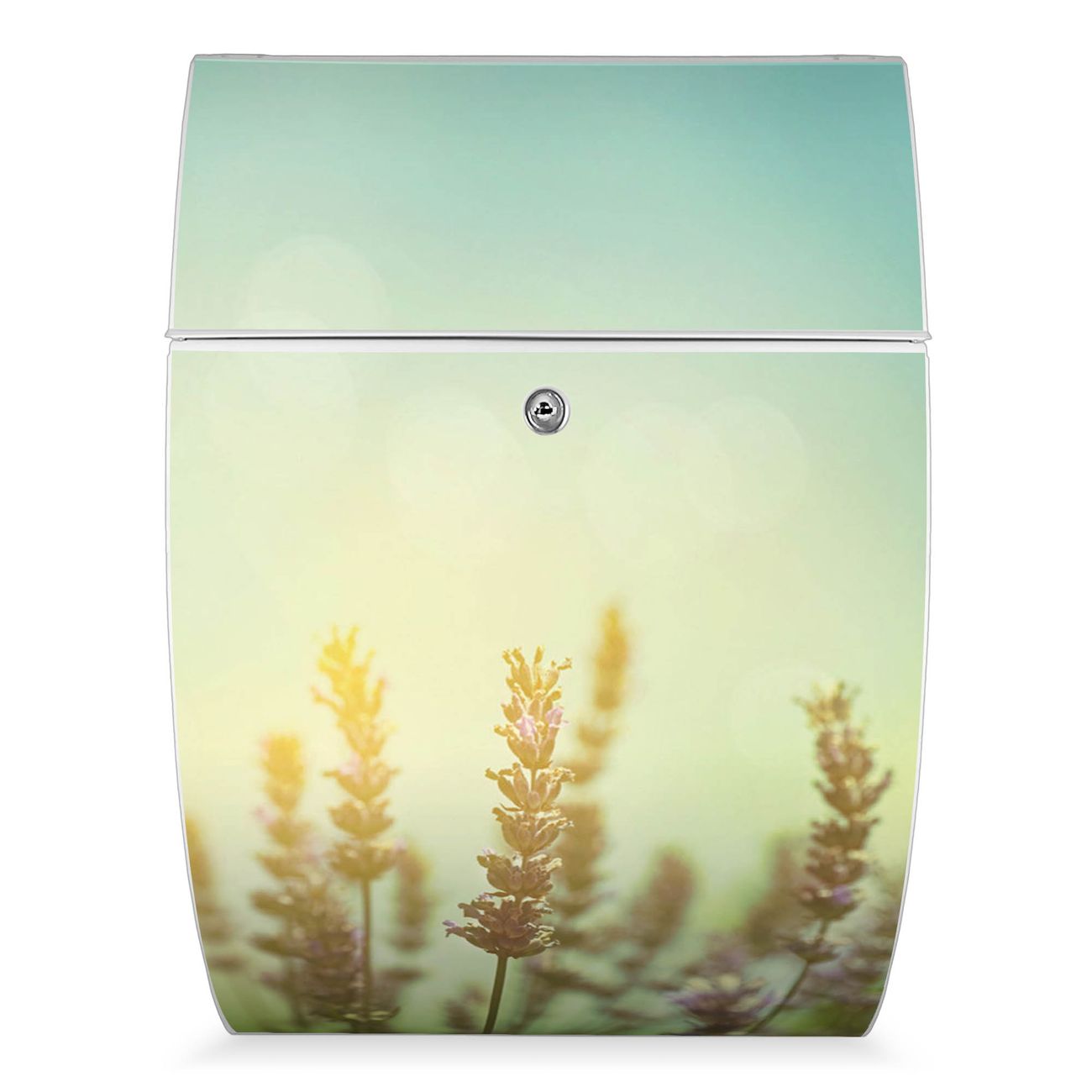 Der weiße Burg Wächter Design Briefkasten mit Motiv Sonnenlavendel bietet Ihnen mit seinem Fassungsvermögen genügend Platz auch für große A4 Sendungen. Auf Wunsch können Sie bei uns auch den passenden Ständer kaufen und so aus dem Wandbriefkasten einen Standbriefkasten machen.