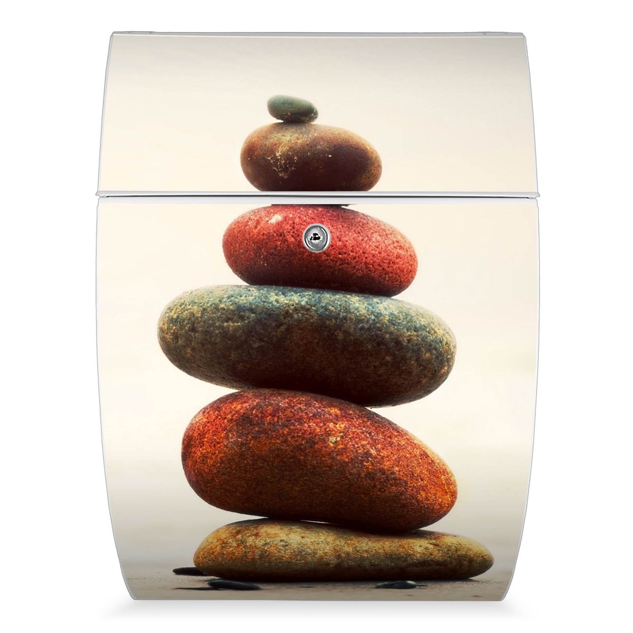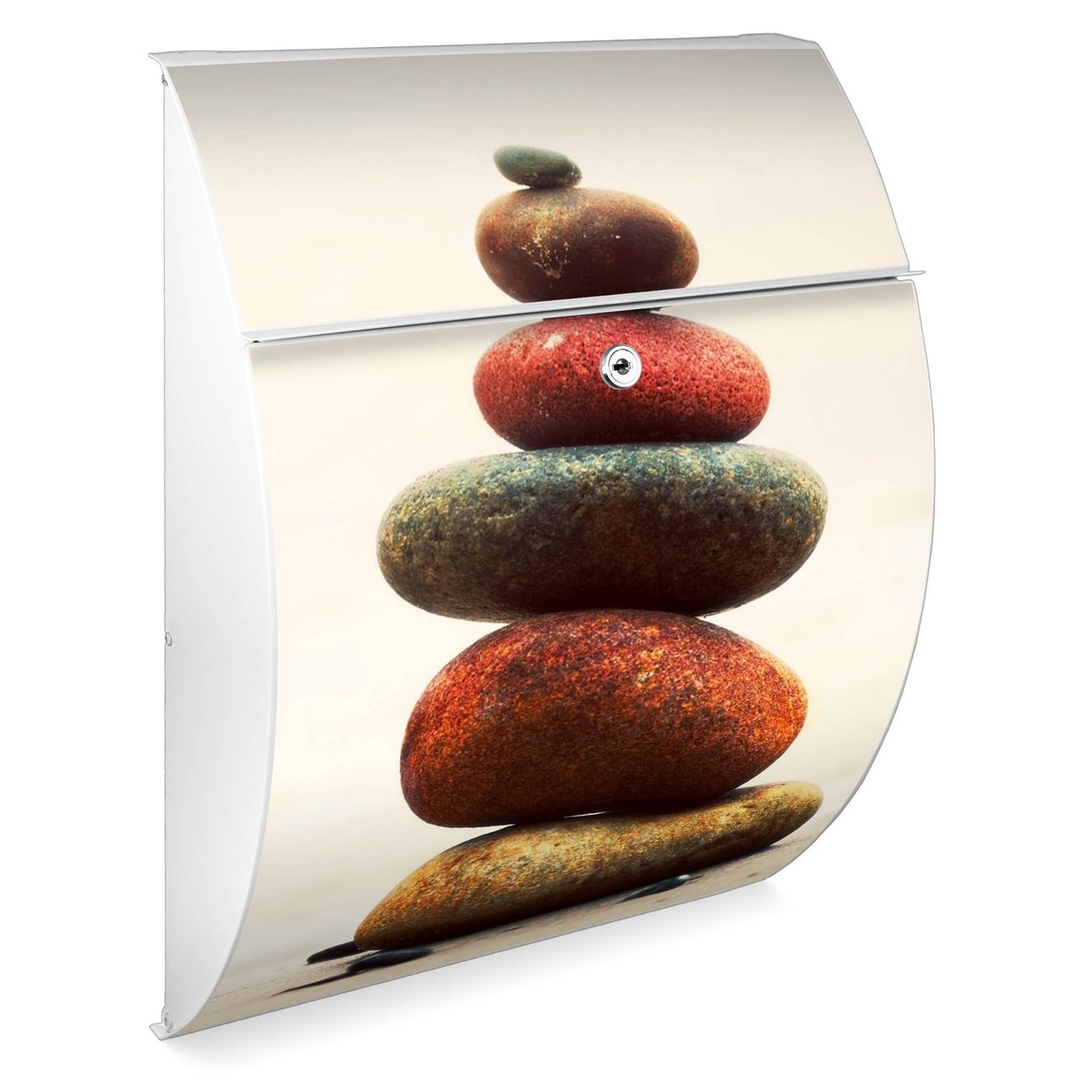FUNKTION: DESIGN: Das Modell Riviera mit Motiv Steinmännchen hat ein sehr ansprechendes und zeitloses Design. Heben Sie Sich von der tristen grauen Masse ab, ohne auf Funktionalität zu verzichten. Der integrierte Öffnungsstopp ermöglicht eine einfache Handhabung beim Entnehmen der Post. DETAILS: Der Postkasten besteht aus vollflächig verzinktem Stahl welcher in weiß lackiert wurde. Das Motiv besteht aus einer wetter- und UV-festen Folie, die mit einem Schutzlaminat überzogen ist, durch die Ihren Briefkasten zusätzlich vor Kratzern geschützt ist. Sie erhalten 2 Schlüssel sowie das passende Montagematerial. NUTZEN: Sie können den Briefkasten sowohl als Wandbriefkasten montieren oder einen passenden Ständer kaufen und als Standbriefkasten einbetonieren. Die Größe bietet genügend Platz für Sendungen aller Art, der Einwurf fasst auch größere A4 Sendungen. BANJADO: Ihr Briefkasten wird in Sachsen in einer kleinen Manufaktur von Hand veredelt. Die Motivfolie ist lösungsmittelfrei und schutzlaminiert, dies sorgt für einen langen Halt. Wir legen großen Wert auf die Verbindung von Funktionalität und Design. Sie erhalten Handarbeit aus Sachsen.