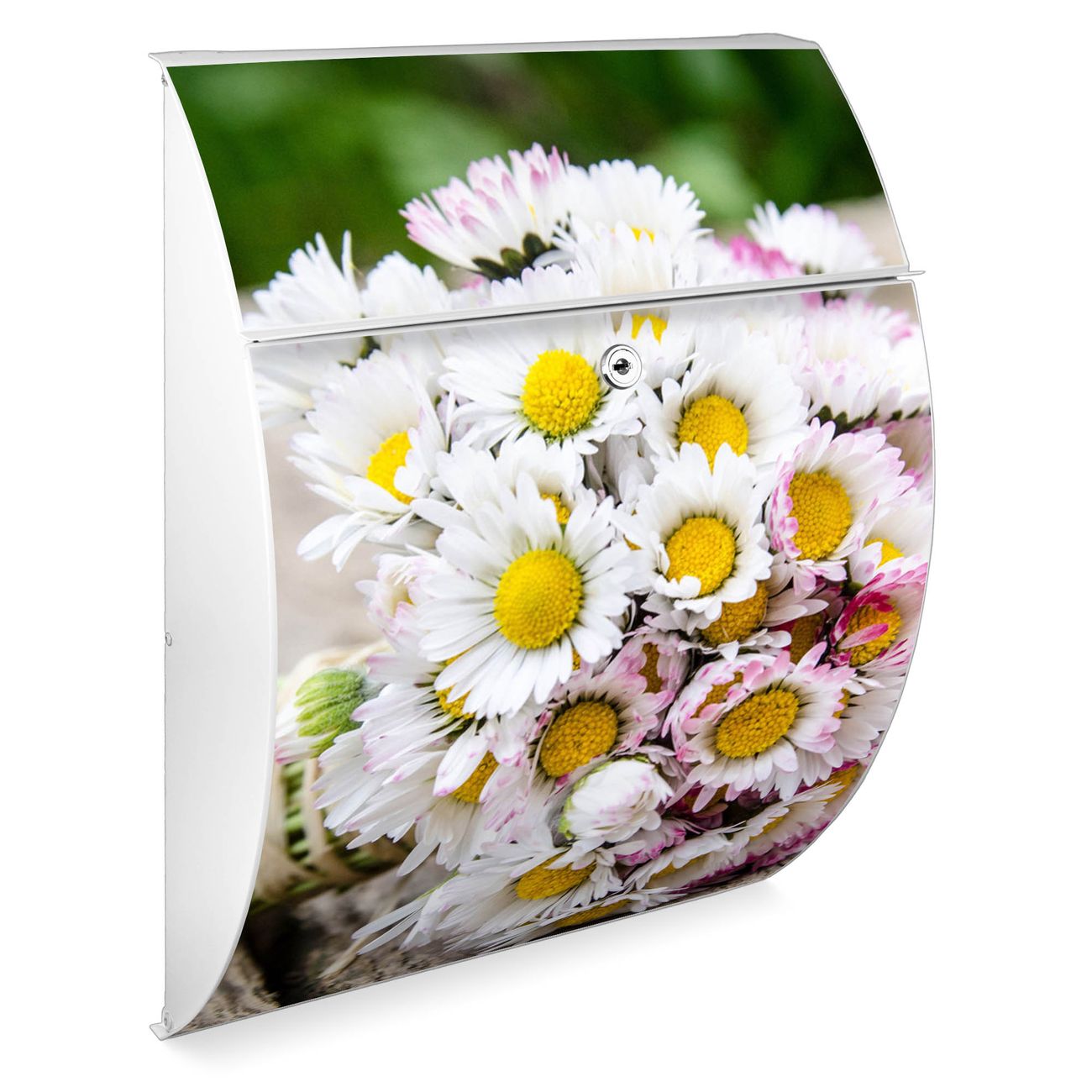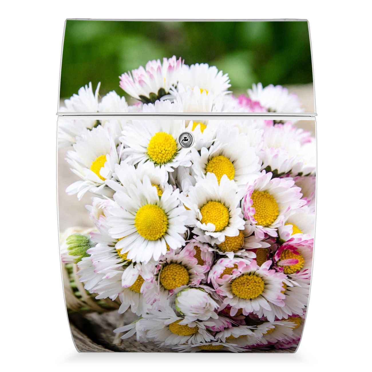 Der weiße Burg Wächter Design Briefkasten mit Motiv Strauß Gänseblümchen bietet Ihnen mit seinem Fassungsvermögen genügend Platz auch für große A4 Sendungen. Auf Wunsch können Sie bei uns auch den passenden Ständer kaufen und so aus dem Wandbriefkasten einen Standbriefkasten machen.