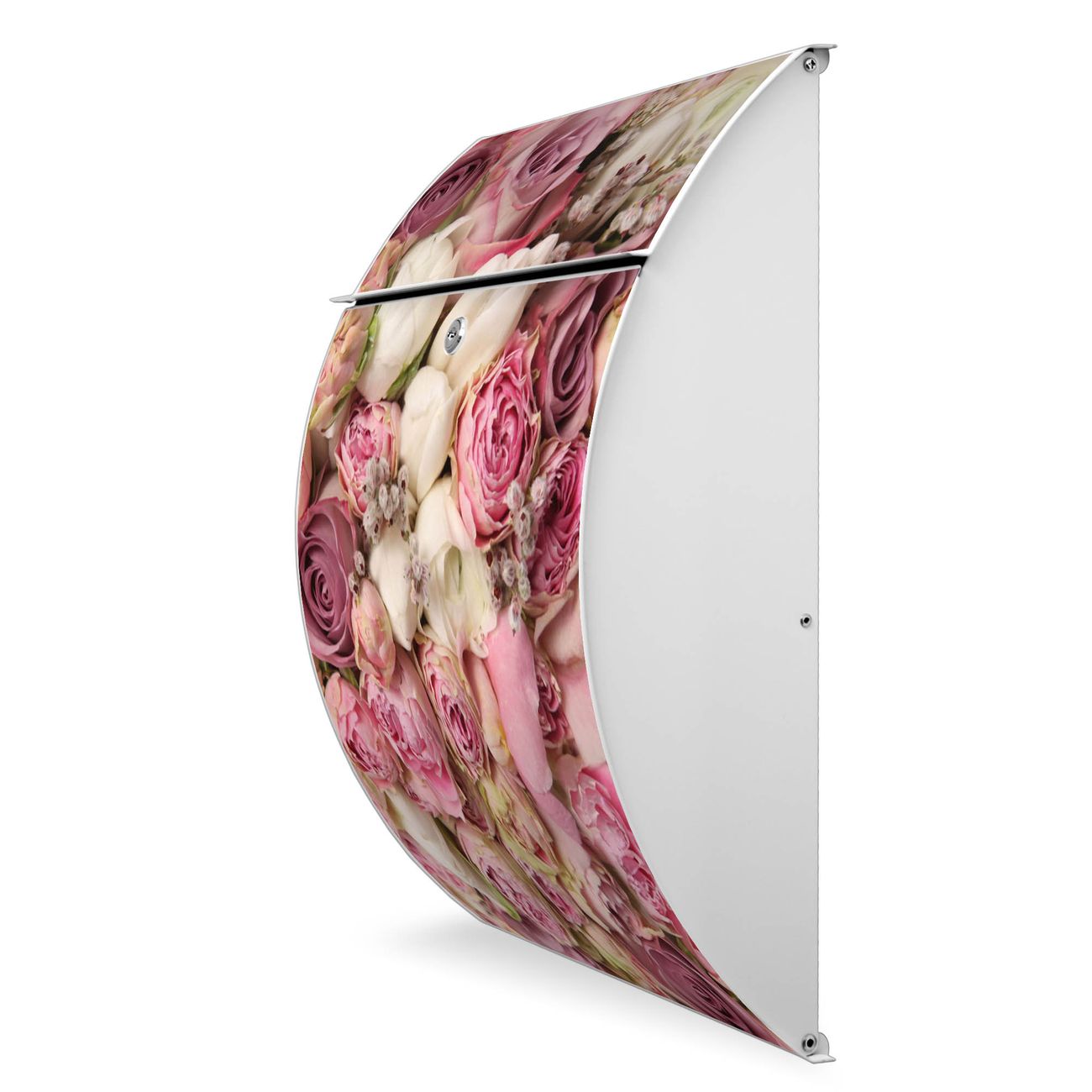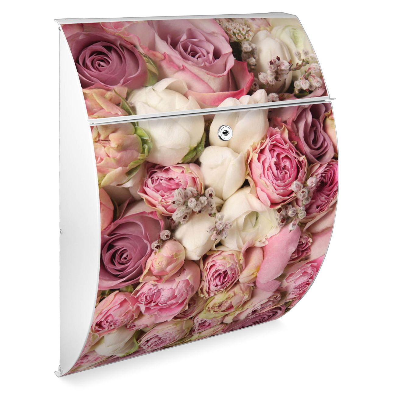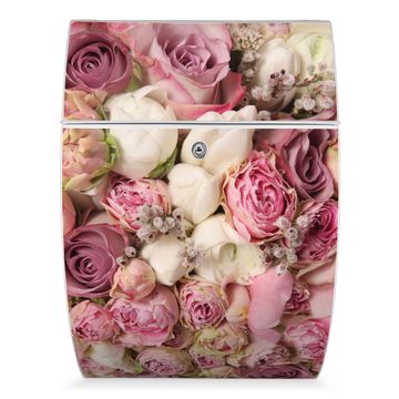 Der weiße Burg Wächter Design Briefkasten mit Motiv Strauss Rosen bietet Ihnen mit seinem Fassungsvermögen genügend Platz auch für große A4 Sendungen. Auf Wunsch können Sie bei uns auch den passenden Ständer kaufen und so aus dem Wandbriefkasten einen Standbriefkasten machen.