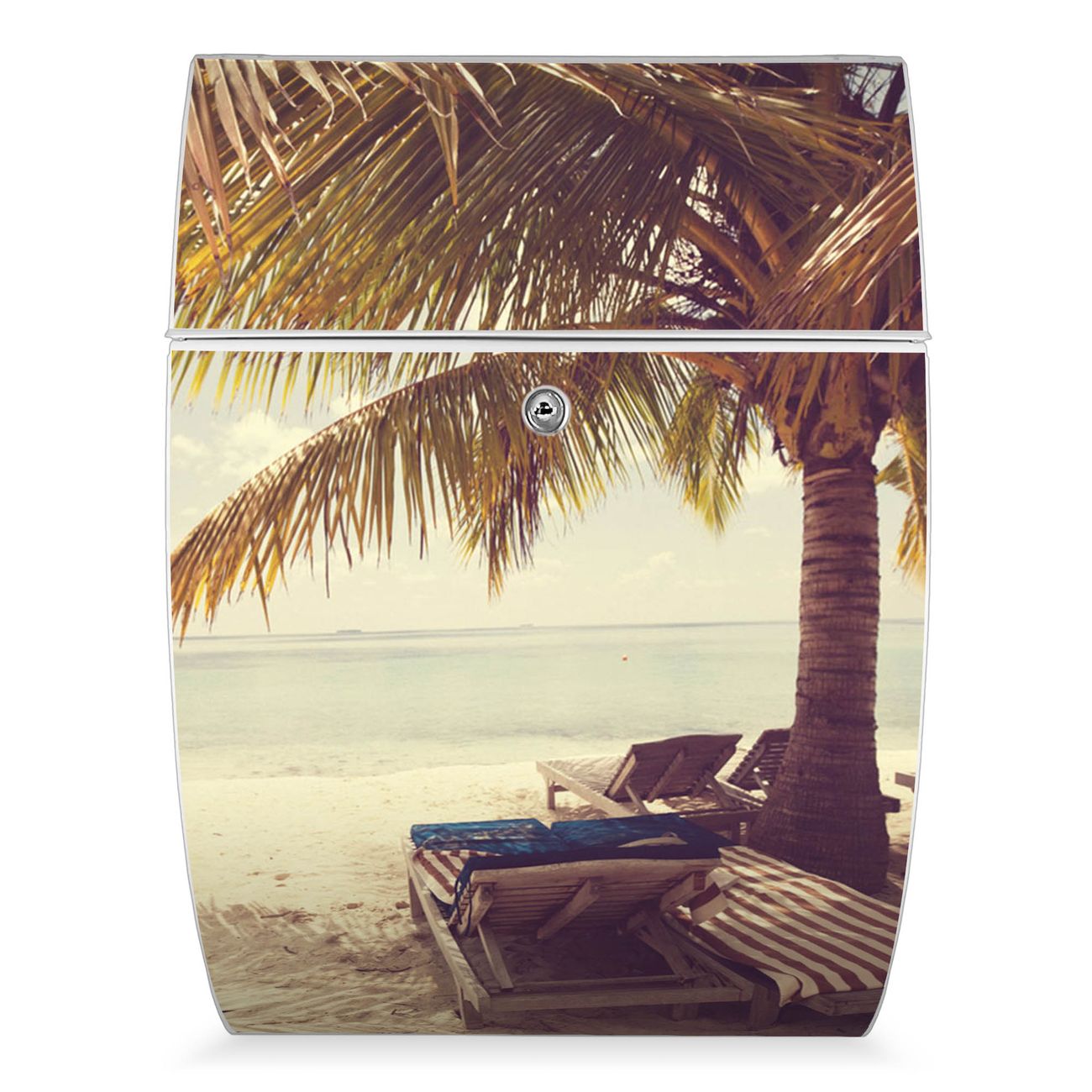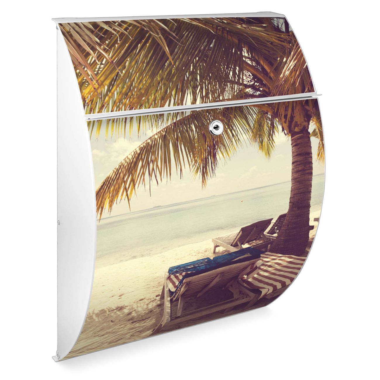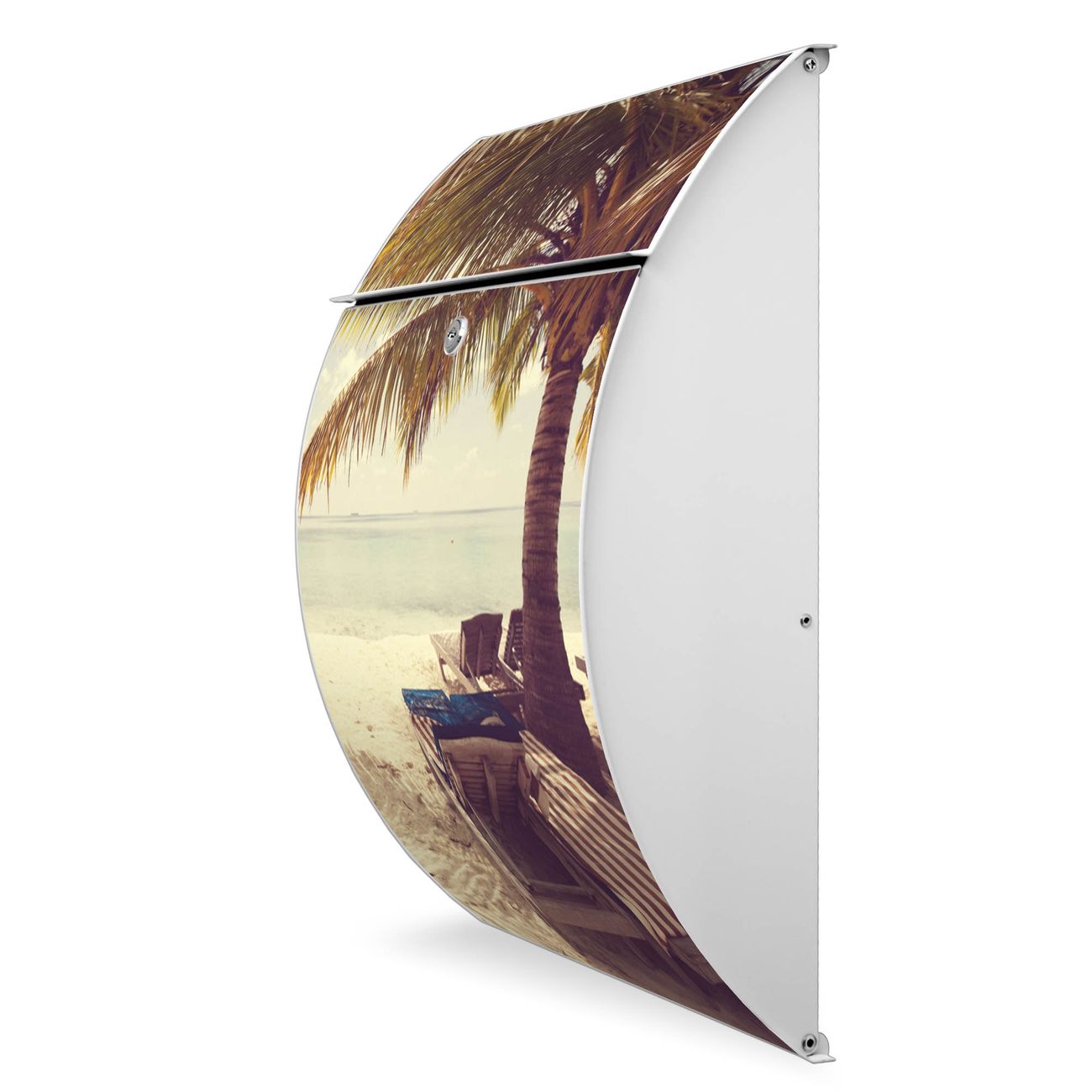Der weiße Burg Wächter Design Briefkasten mit Motiv Südseestrand bietet Ihnen mit seinem Fassungsvermögen genügend Platz auch für große A4 Sendungen. Auf Wunsch können Sie bei uns auch den passenden Ständer kaufen und so aus dem Wandbriefkasten einen Standbriefkasten machen.