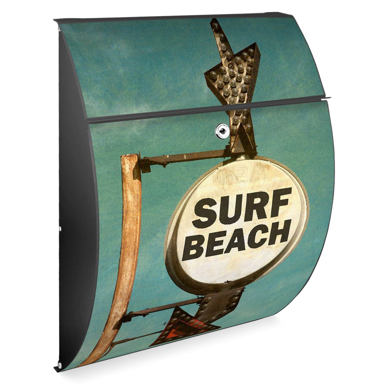FUNKTION: DESIGN: Das Modell Riviera mit Motiv Surf Beach hat ein sehr ansprechendes und zeitloses Design. Heben Sie Sich von der tristen grauen Masse ab, ohne auf Funktionalität zu verzichten. Der integrierte Öffnungsstopp ermöglicht eine einfache Handhabung beim Entnehmen der Post. DETAILS: Der Postkasten besteht aus vollflächig verzinktem Stahl welcher in Anthrazit lackiert wurde. Das Motiv besteht aus einer wetter- und UV-festen Folie, die mit einem Schutzlaminat überzogen ist, durch die Ihren Briefkasten zusätzlich vor Kratzern geschützt ist. Sie erhalten 2 Schlüssel sowie das passende Montagematerial. NUTZEN: Sie können den Briefkasten sowohl als Wandbriefkasten montieren oder einen passenden Ständer kaufen und als Standbriefkasten einbetonieren. Die Größe bietet genügend Platz für Sendungen aller Art, der Einwurf fasst auch größere A4 Sendungen. BANJADO: Ihr Briefkasten wird in Sachsen in einer kleinen Manufaktur von Hand veredelt. Die Motivfolie ist lösungsmittelfrei und schutzlaminiert, dies sorgt für einen langen Halt. Wir legen großen Wert auf die Verbindung von Funktionalität und Design. Sie erhalten Handarbeit aus Sachsen.