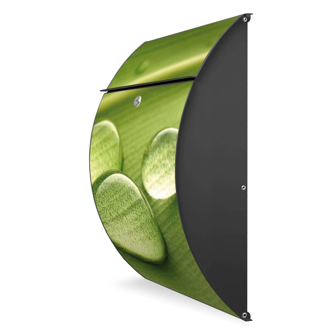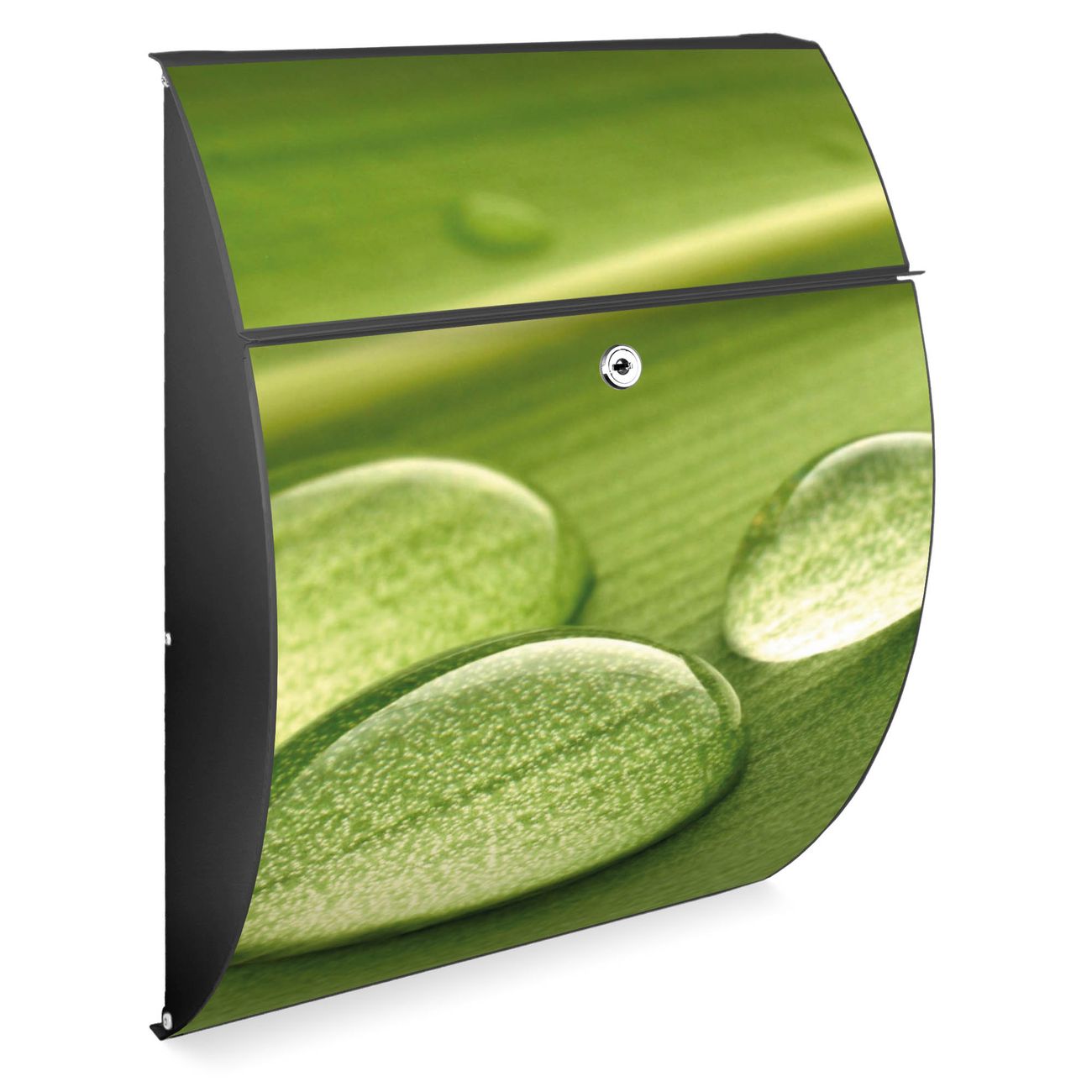 FUNKTION: DESIGN: Das Modell Riviera mit Motiv Tautropfen hat ein sehr ansprechendes und zeitloses Design. Heben Sie Sich von der tristen grauen Masse ab, ohne auf Funktionalität zu verzichten. Der integrierte Öffnungsstopp ermöglicht eine einfache Handhabung beim Entnehmen der Post. DETAILS: Der Postkasten besteht aus vollflächig verzinktem Stahl welcher in Anthrazit lackiert wurde. Das Motiv besteht aus einer wetter- und UV-festen Folie, die mit einem Schutzlaminat überzogen ist, durch die Ihren Briefkasten zusätzlich vor Kratzern geschützt ist. Sie erhalten 2 Schlüssel sowie das passende Montagematerial. NUTZEN: Sie können den Briefkasten sowohl als Wandbriefkasten montieren oder einen passenden Ständer kaufen und als Standbriefkasten einbetonieren. Die Größe bietet genügend Platz für Sendungen aller Art, der Einwurf fasst auch größere A4 Sendungen. BANJADO: Ihr Briefkasten wird in Sachsen in einer kleinen Manufaktur von Hand veredelt. Die Motivfolie ist lösungsmittelfrei und schutzlaminiert, dies sorgt für einen langen Halt. Wir legen großen Wert auf die Verbindung von Funktionalität und Design. Sie erhalten Handarbeit aus Sachsen.