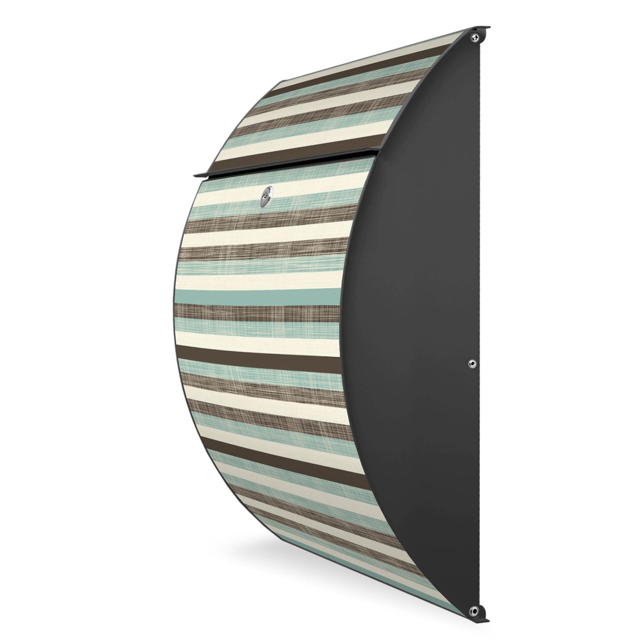 FUNKTION: DESIGN: Das Modell Riviera mit Motiv Textile Streifen hat ein sehr ansprechendes und zeitloses Design. Heben Sie Sich von der tristen grauen Masse ab, ohne auf Funktionalität zu verzichten. Der integrierte Öffnungsstopp ermöglicht eine einfache Handhabung beim Entnehmen der Post. DETAILS: Der Postkasten besteht aus vollflächig verzinktem Stahl welcher in Anthrazit lackiert wurde. Das Motiv besteht aus einer wetter- und UV-festen Folie, die mit einem Schutzlaminat überzogen ist, durch die Ihren Briefkasten zusätzlich vor Kratzern geschützt ist. Sie erhalten 2 Schlüssel sowie das passende Montagematerial. NUTZEN: Sie können den Briefkasten sowohl als Wandbriefkasten montieren oder einen passenden Ständer kaufen und als Standbriefkasten einbetonieren. Die Größe bietet genügend Platz für Sendungen aller Art, der Einwurf fasst auch größere A4 Sendungen. BANJADO: Ihr Briefkasten wird in Sachsen in einer kleinen Manufaktur von Hand veredelt. Die Motivfolie ist lösungsmittelfrei und schutzlaminiert, dies sorgt für einen langen Halt. Wir legen großen Wert auf die Verbindung von Funktionalität und Design. Sie erhalten Handarbeit aus Sachsen.