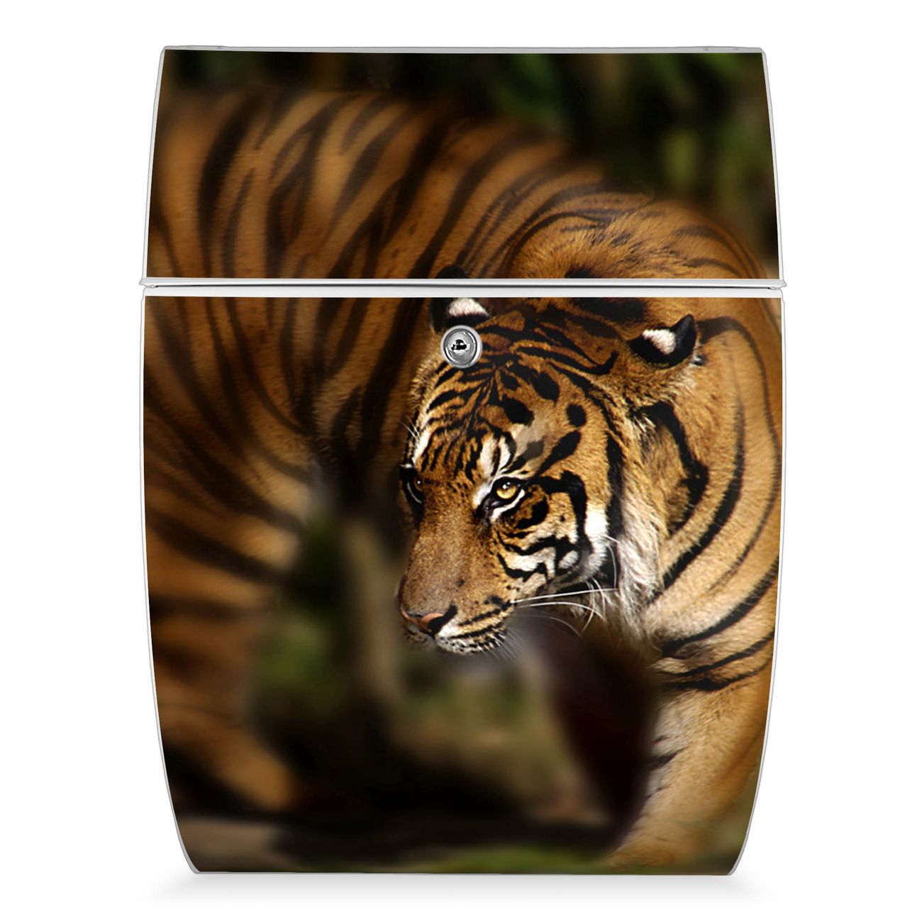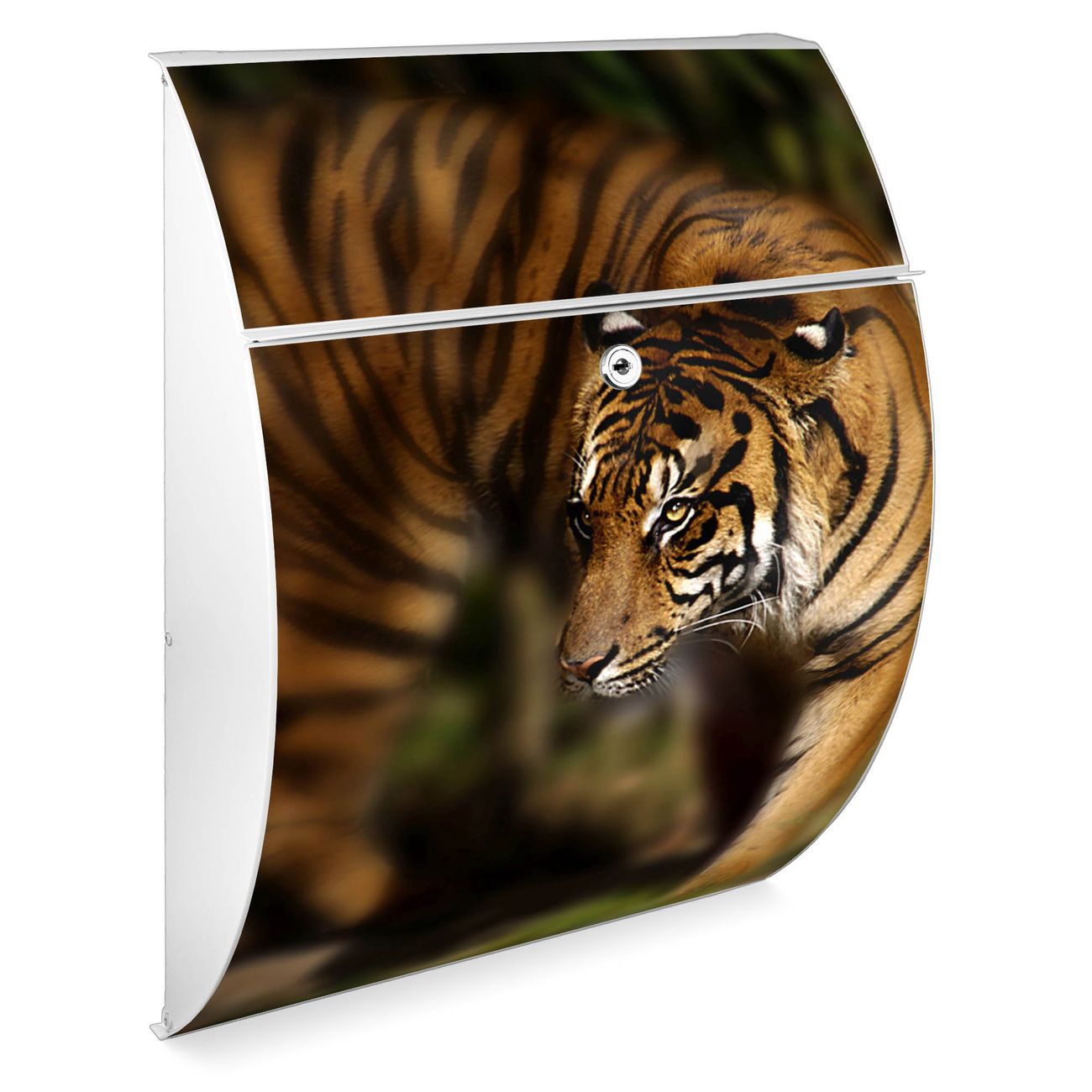 Der weiße Burg Wächter Design Briefkasten mit Motiv Tiger bietet Ihnen mit seinem Fassungsvermögen genügend Platz auch für große A4 Sendungen. Auf Wunsch können Sie bei uns auch den passenden Ständer kaufen und so aus dem Wandbriefkasten einen Standbriefkasten machen.