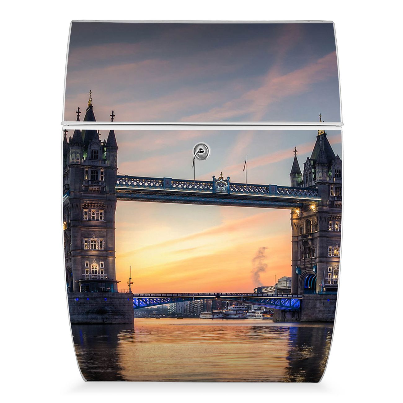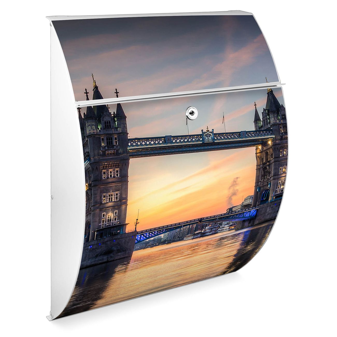 Der weiße Burg Wächter Design Briefkasten mit Motiv Tower Bridge bietet Ihnen mit seinem Fassungsvermögen genügend Platz auch für große A4 Sendungen. Auf Wunsch können Sie bei uns auch den passenden Ständer kaufen und so aus dem Wandbriefkasten einen Standbriefkasten machen.