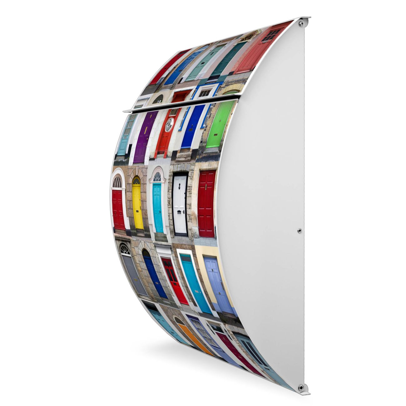 Der weiße Burg Wächter Design Briefkasten mit Motiv Türen bietet Ihnen mit seinem Fassungsvermögen genügend Platz auch für große A4 Sendungen. Auf Wunsch können Sie bei uns auch den passenden Ständer kaufen und so aus dem Wandbriefkasten einen Standbriefkasten machen.