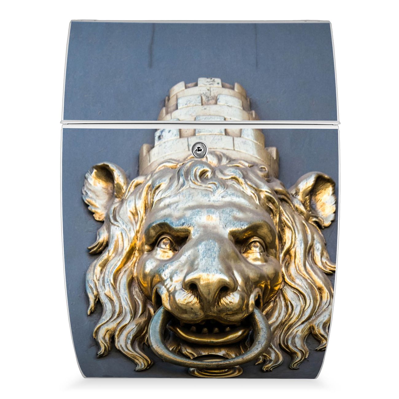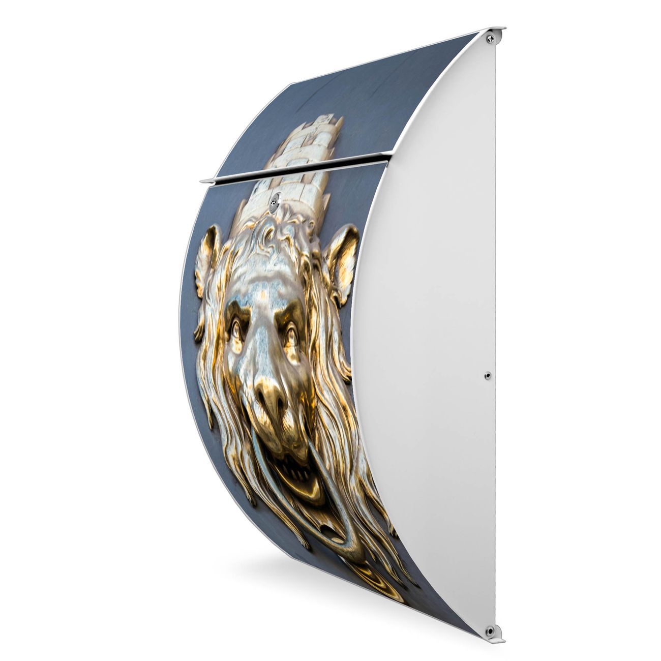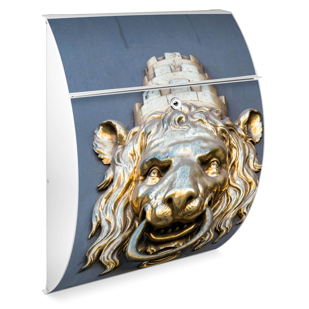 Der weiße Burg Wächter Design Briefkasten mit Motiv Türklopfer Löwe bietet Ihnen mit seinem Fassungsvermögen genügend Platz auch für große A4 Sendungen. Auf Wunsch können Sie bei uns auch den passenden Ständer kaufen und so aus dem Wandbriefkasten einen Standbriefkasten machen.