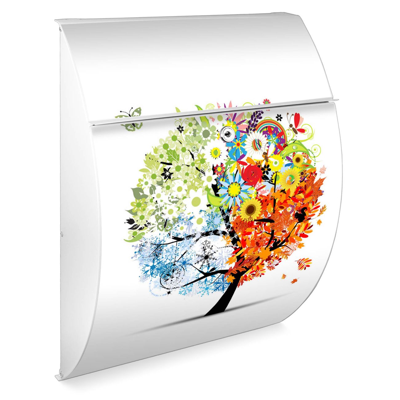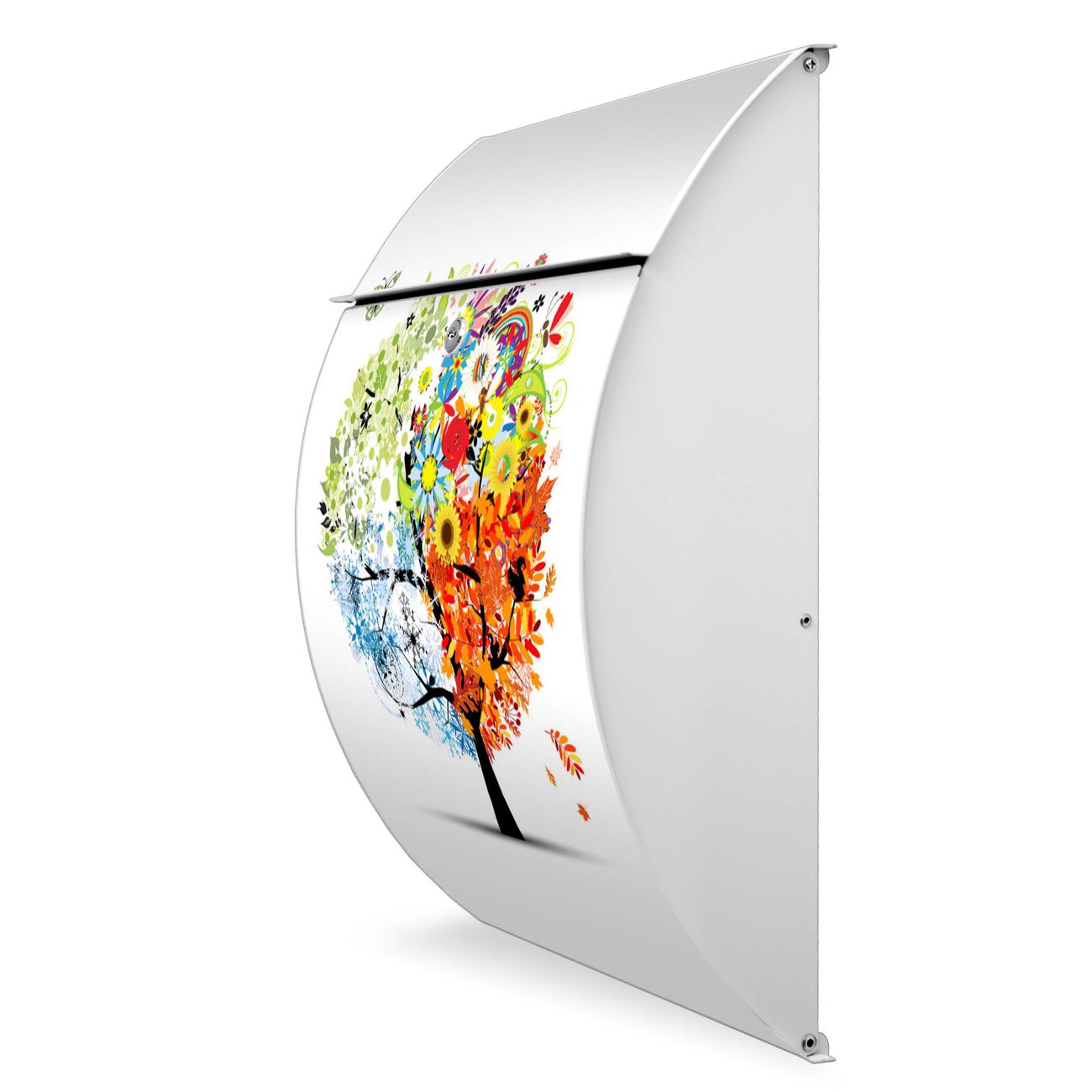 Der weiße Burg Wächter Design Briefkasten mit Motiv Vier Jahreszeiten bietet Ihnen mit seinem Fassungsvermögen genügend Platz auch für große A4 Sendungen. Auf Wunsch können Sie bei uns auch den passenden Ständer kaufen und so aus dem Wandbriefkasten einen Standbriefkasten machen.