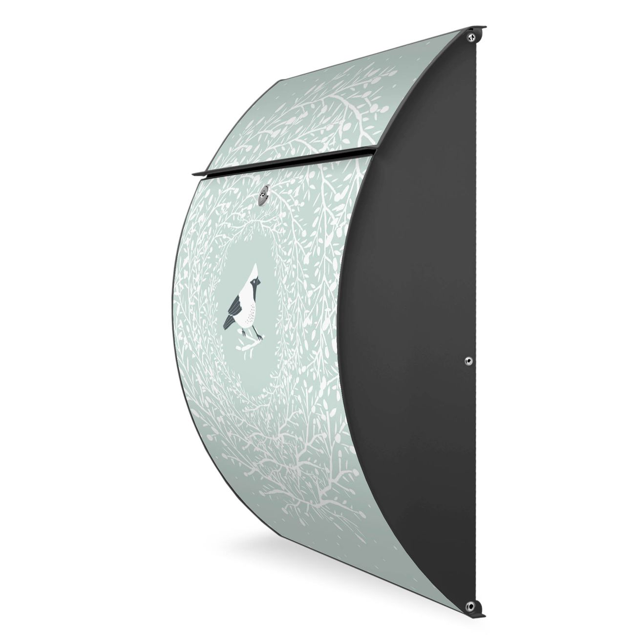 FUNKTION: DESIGN: Das Modell Riviera mit Motiv Vogel im Kranz hat ein sehr ansprechendes und zeitloses Design. Heben Sie Sich von der tristen grauen Masse ab, ohne auf Funktionalität zu verzichten. Der integrierte Öffnungsstopp ermöglicht eine einfache Handhabung beim Entnehmen der Post. DETAILS: Der Postkasten besteht aus vollflächig verzinktem Stahl welcher in Anthrazit lackiert wurde. Das Motiv besteht aus einer wetter- und UV-festen Folie, die mit einem Schutzlaminat überzogen ist, durch die Ihren Briefkasten zusätzlich vor Kratzern geschützt ist. Sie erhalten 2 Schlüssel sowie das passende Montagematerial. NUTZEN: Sie können den Briefkasten sowohl als Wandbriefkasten montieren oder einen passenden Ständer kaufen und als Standbriefkasten einbetonieren. Die Größe bietet genügend Platz für Sendungen aller Art, der Einwurf fasst auch größere A4 Sendungen. BANJADO: Ihr Briefkasten wird in Sachsen in einer kleinen Manufaktur von Hand veredelt. Die Motivfolie ist lösungsmittelfrei und schutzlaminiert, dies sorgt für einen langen Halt. Wir legen großen Wert auf die Verbindung von Funktionalität und Design. Sie erhalten Handarbeit aus Sachsen.