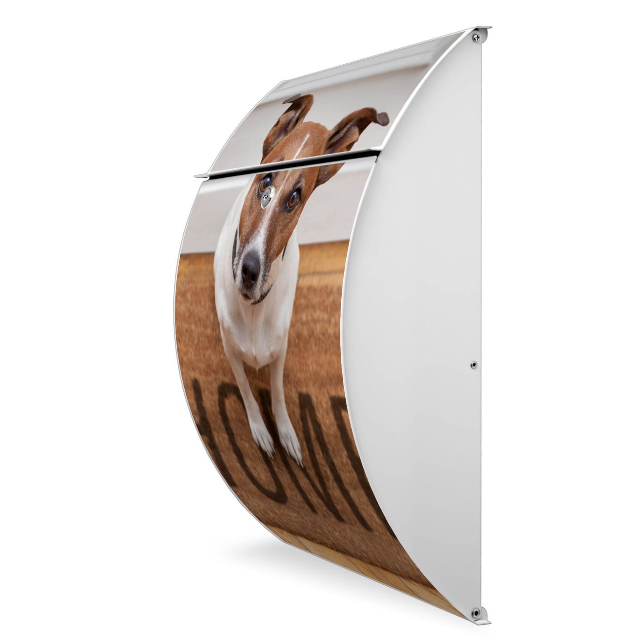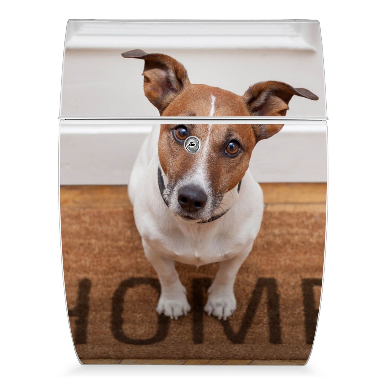 FUNKTION: DESIGN: Das Modell Riviera mit Motiv Wachhund Jack Russel hat ein sehr ansprechendes und zeitloses Design. Heben Sie Sich von der tristen grauen Masse ab, ohne auf Funktionalität zu verzichten. Der integrierte Öffnungsstopp ermöglicht eine einfache Handhabung beim Entnehmen der Post. DETAILS: Der Postkasten besteht aus vollflächig verzinktem Stahl welcher in weiß lackiert wurde. Das Motiv besteht aus einer wetter- und UV-festen Folie, die mit einem Schutzlaminat überzogen ist, durch die Ihren Briefkasten zusätzlich vor Kratzern geschützt ist. Sie erhalten 2 Schlüssel sowie das passende Montagematerial. NUTZEN: Sie können den Briefkasten sowohl als Wandbriefkasten montieren oder einen passenden Ständer kaufen und als Standbriefkasten einbetonieren. Die Größe bietet genügend Platz für Sendungen aller Art, der Einwurf fasst auch größere A4 Sendungen. BANJADO: Ihr Briefkasten wird in Sachsen in einer kleinen Manufaktur von Hand veredelt. Die Motivfolie ist lösungsmittelfrei und schutzlaminiert, dies sorgt für einen langen Halt. Wir legen großen Wert auf die Verbindung von Funktionalität und Design. Sie erhalten Handarbeit aus Sachsen.