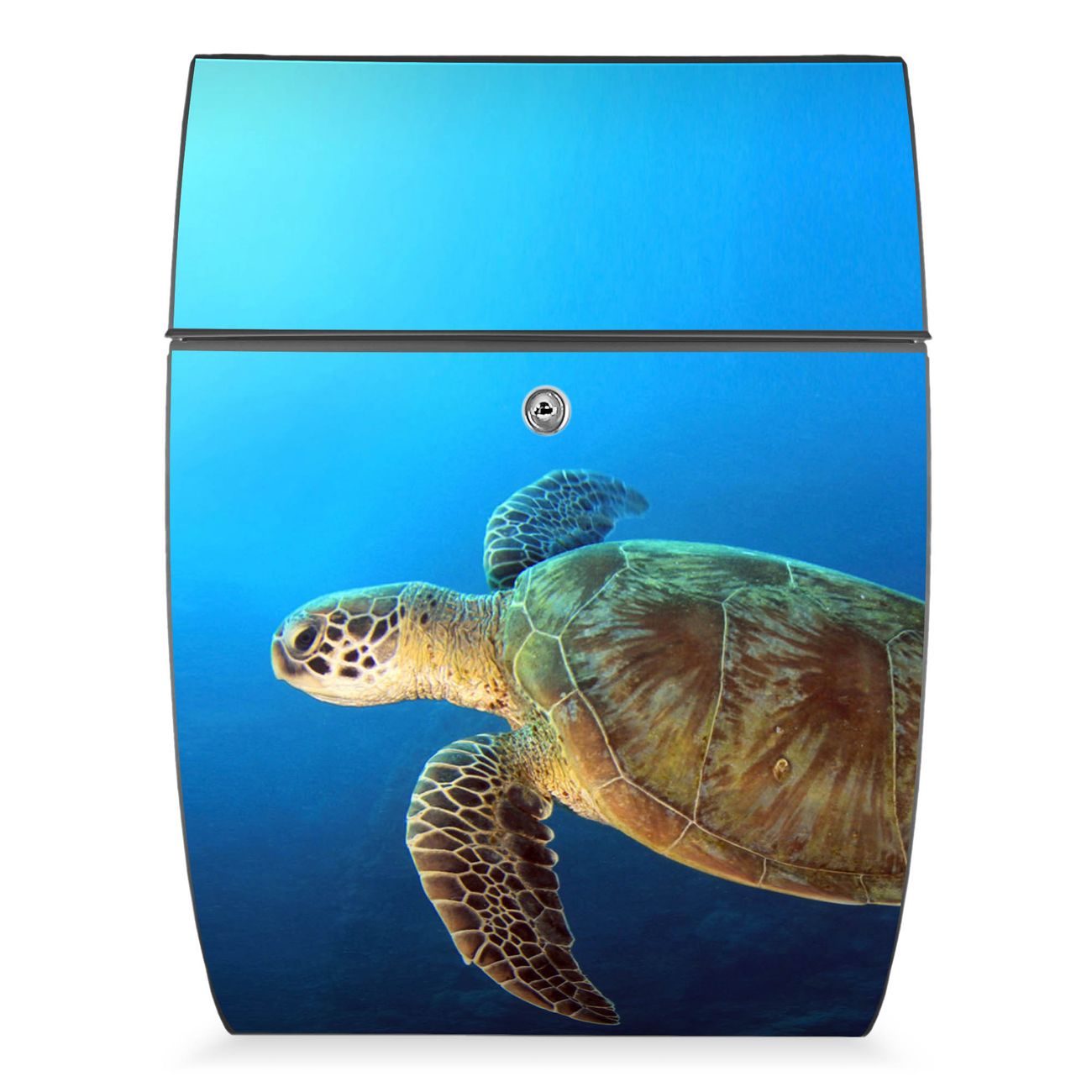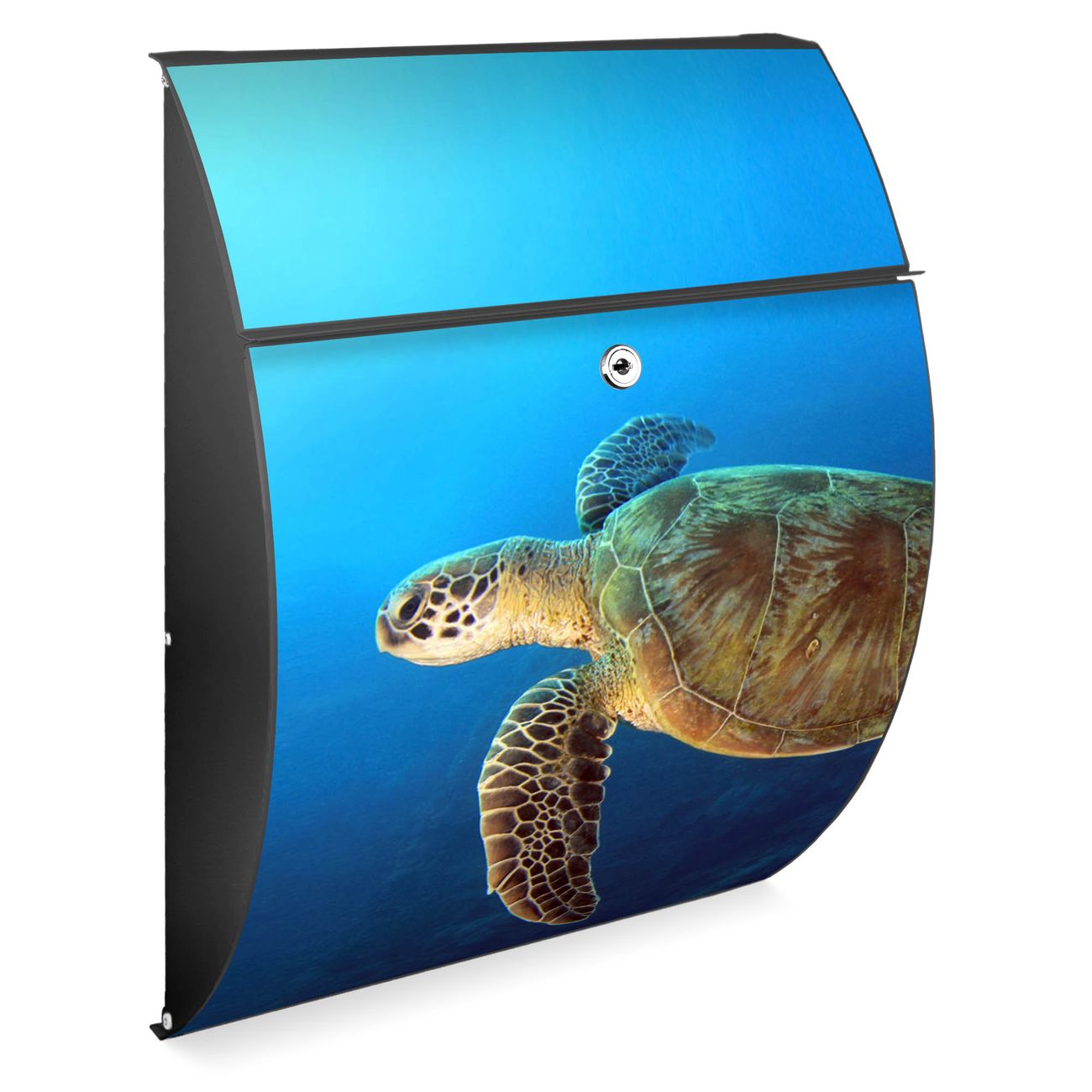 FUNKTION: DESIGN: Das Modell Riviera mit Motiv Wasserschildkröte hat ein sehr ansprechendes und zeitloses Design. Heben Sie Sich von der tristen grauen Masse ab, ohne auf Funktionalität zu verzichten. Der integrierte Öffnungsstopp ermöglicht eine einfache Handhabung beim Entnehmen der Post. DETAILS: Der Postkasten besteht aus vollflächig verzinktem Stahl welcher in Anthrazit lackiert wurde. Das Motiv besteht aus einer wetter- und UV-festen Folie, die mit einem Schutzlaminat überzogen ist, durch die Ihren Briefkasten zusätzlich vor Kratzern geschützt ist. Sie erhalten 2 Schlüssel sowie das passende Montagematerial. NUTZEN: Sie können den Briefkasten sowohl als Wandbriefkasten montieren oder einen passenden Ständer kaufen und als Standbriefkasten einbetonieren. Die Größe bietet genügend Platz für Sendungen aller Art, der Einwurf fasst auch größere A4 Sendungen. BANJADO: Ihr Briefkasten wird in Sachsen in einer kleinen Manufaktur von Hand veredelt. Die Motivfolie ist lösungsmittelfrei und schutzlaminiert, dies sorgt für einen langen Halt. Wir legen großen Wert auf die Verbindung von Funktionalität und Design. Sie erhalten Handarbeit aus Sachsen.