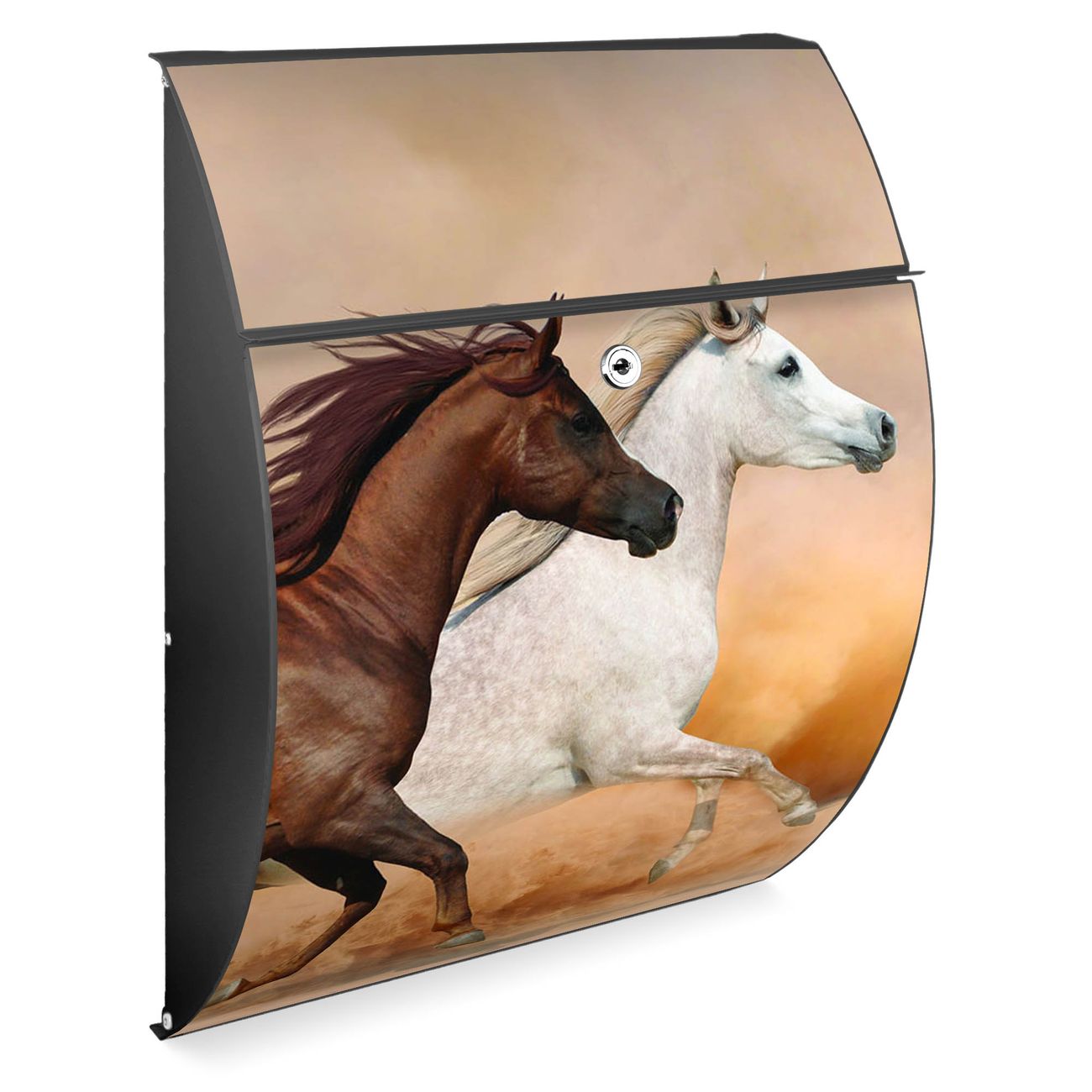 FUNKTION: DESIGN: Das Modell Riviera mit Motiv Wilde Pferde hat ein sehr ansprechendes und zeitloses Design. Heben Sie Sich von der tristen grauen Masse ab, ohne auf Funktionalität zu verzichten. Der integrierte Öffnungsstopp ermöglicht eine einfache Handhabung beim Entnehmen der Post. DETAILS: Der Postkasten besteht aus vollflächig verzinktem Stahl welcher in Anthrazit lackiert wurde. Das Motiv besteht aus einer wetter- und UV-festen Folie, die mit einem Schutzlaminat überzogen ist, durch die Ihren Briefkasten zusätzlich vor Kratzern geschützt ist. Sie erhalten 2 Schlüssel sowie das passende Montagematerial. NUTZEN: Sie können den Briefkasten sowohl als Wandbriefkasten montieren oder einen passenden Ständer kaufen und als Standbriefkasten einbetonieren. Die Größe bietet genügend Platz für Sendungen aller Art, der Einwurf fasst auch größere A4 Sendungen. BANJADO: Ihr Briefkasten wird in Sachsen in einer kleinen Manufaktur von Hand veredelt. Die Motivfolie ist lösungsmittelfrei und schutzlaminiert, dies sorgt für einen langen Halt. Wir legen großen Wert auf die Verbindung von Funktionalität und Design. Sie erhalten Handarbeit aus Sachsen.