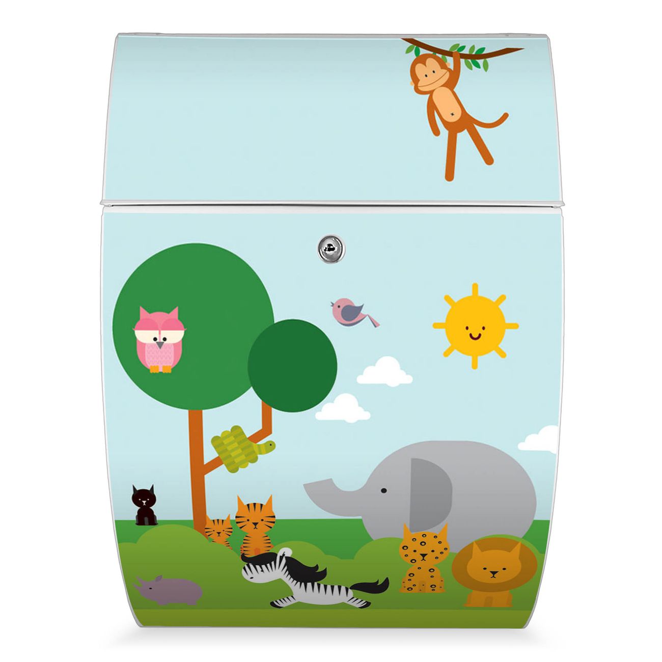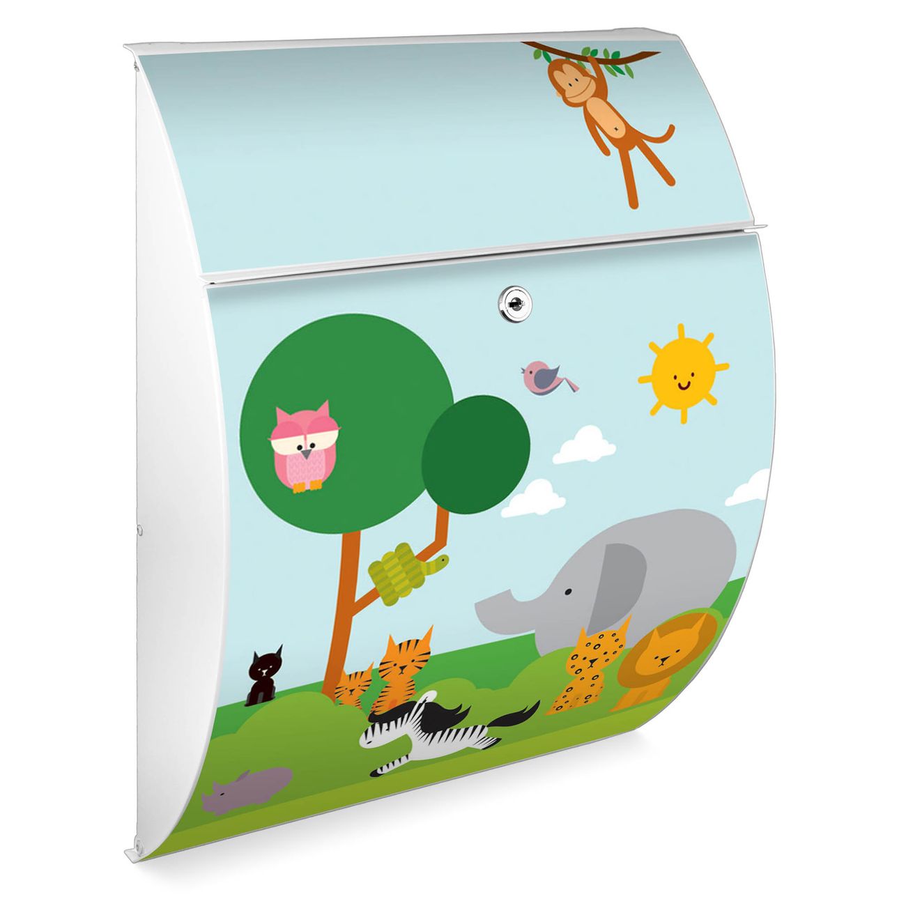 Der weiße Burg Wächter Design Briefkasten mit Motiv Wilde Tiere bietet Ihnen mit seinem Fassungsvermögen genügend Platz auch für große A4 Sendungen. Auf Wunsch können Sie bei uns auch den passenden Ständer kaufen und so aus dem Wandbriefkasten einen Standbriefkasten machen.