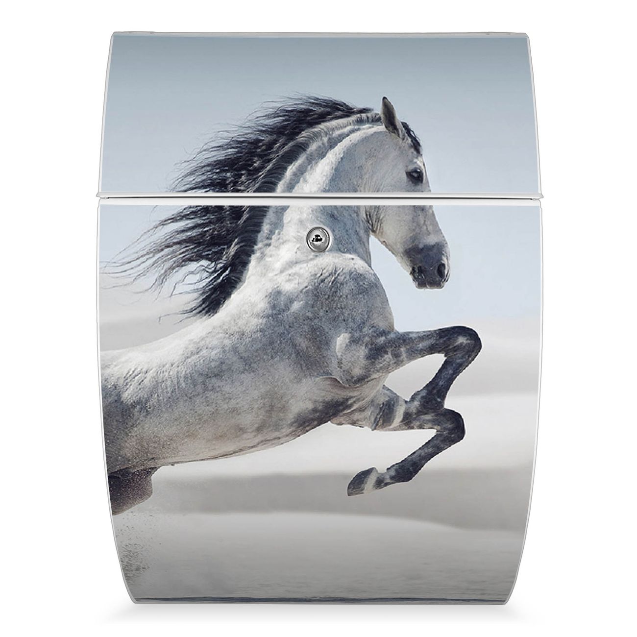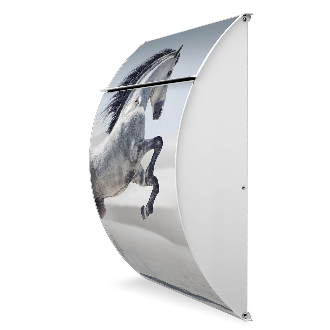 Der weiße Burg Wächter Design Briefkasten mit Motiv Wildes Pferd bietet Ihnen mit seinem Fassungsvermögen genügend Platz auch für große A4 Sendungen. Auf Wunsch können Sie bei uns auch den passenden Ständer kaufen und so aus dem Wandbriefkasten einen Standbriefkasten machen.