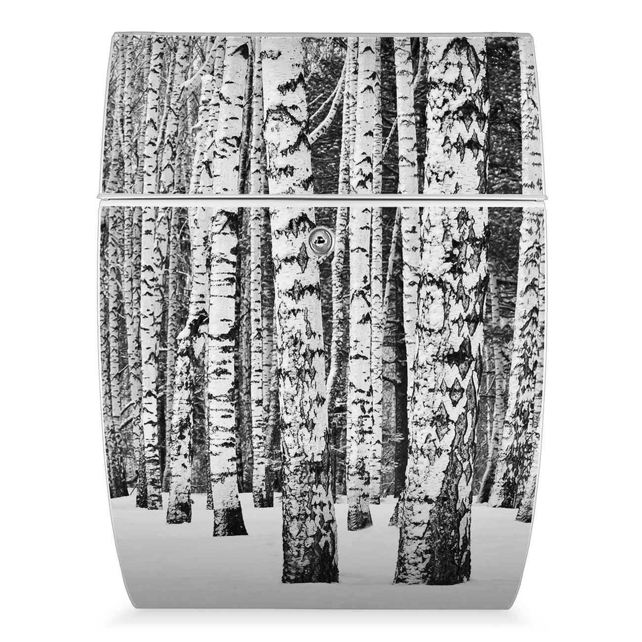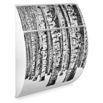 Der weiße Burg Wächter Design Briefkasten mit Motiv Winterlicher Birkenwald bietet Ihnen mit seinem Fassungsvermögen genügend Platz auch für große A4 Sendungen. Auf Wunsch können Sie bei uns auch den passenden Ständer kaufen und so aus dem Wandbriefkasten einen Standbriefkasten machen.