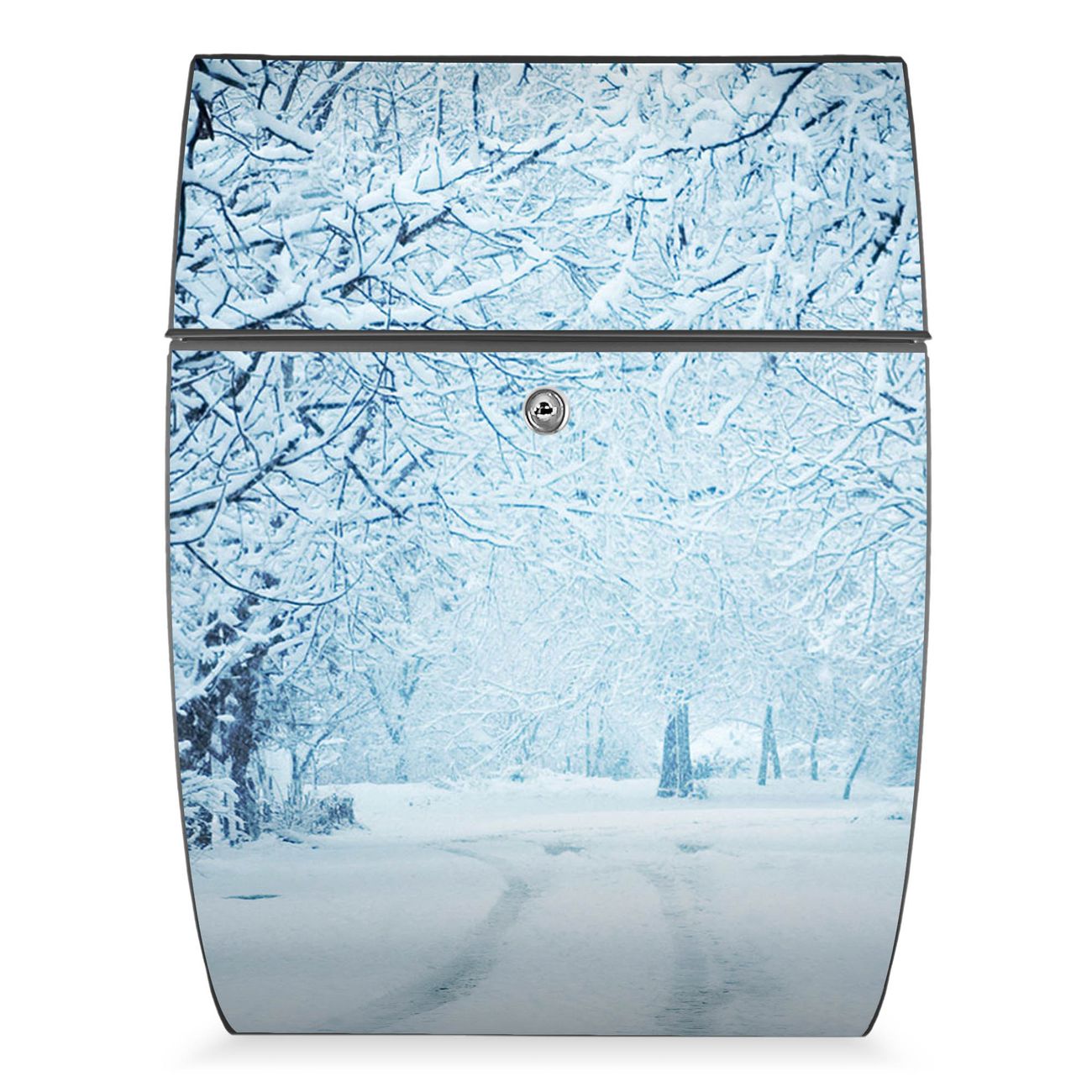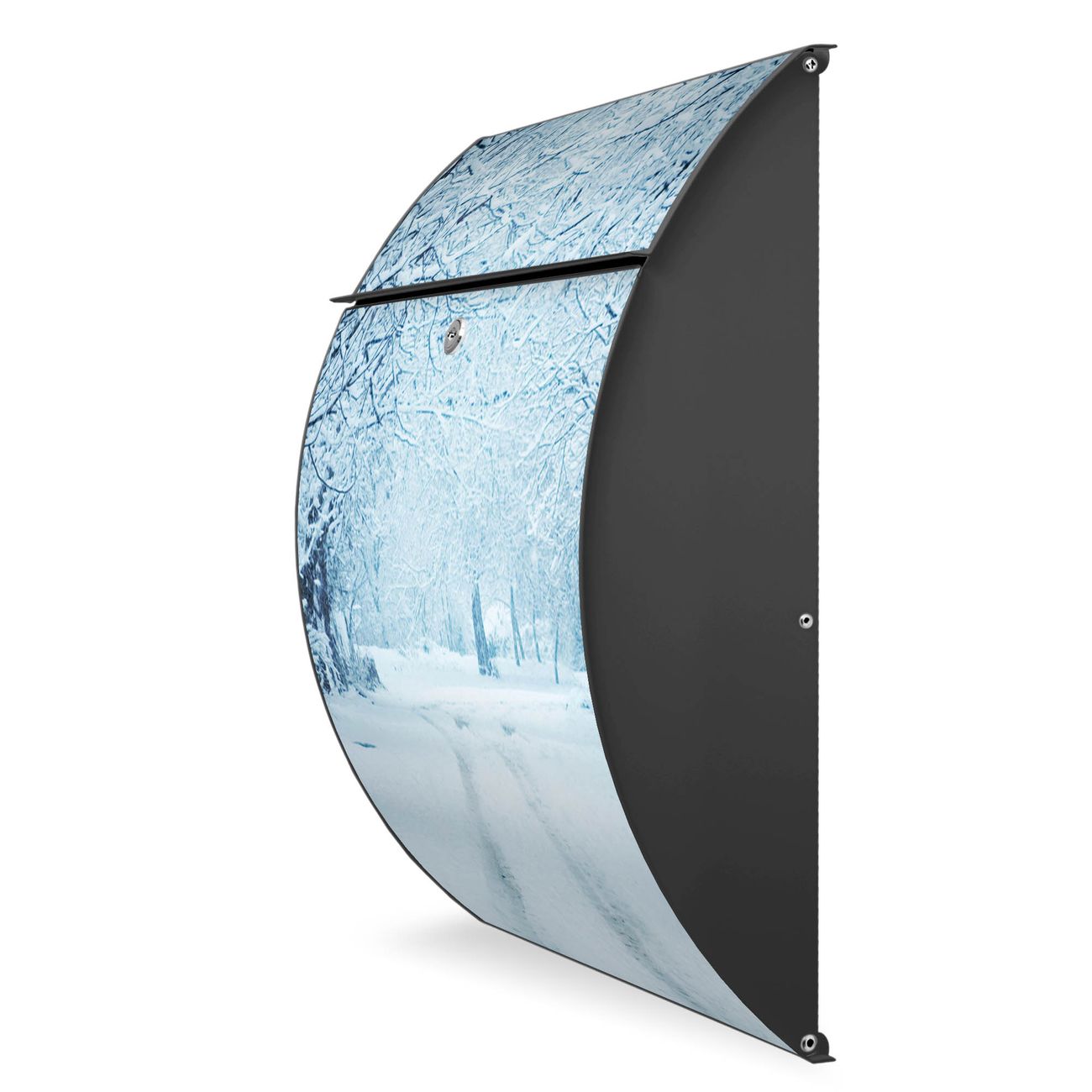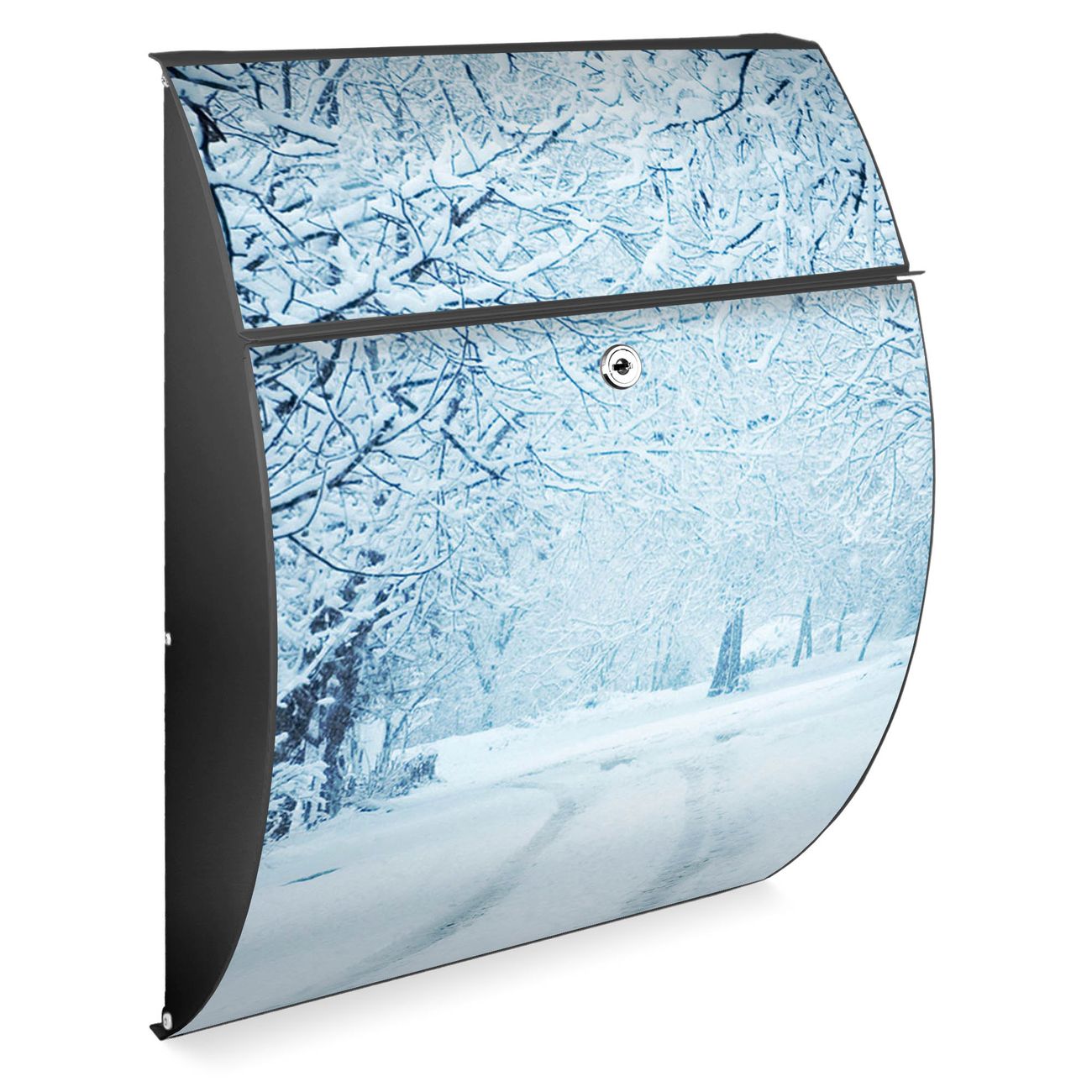 FUNKTION: DESIGN: Das Modell Riviera mit Motiv Winterspaziergang hat ein sehr ansprechendes und zeitloses Design. Heben Sie Sich von der tristen grauen Masse ab, ohne auf Funktionalität zu verzichten. Der integrierte Öffnungsstopp ermöglicht eine einfache Handhabung beim Entnehmen der Post. DETAILS: Der Postkasten besteht aus vollflächig verzinktem Stahl welcher in Anthrazit lackiert wurde. Das Motiv besteht aus einer wetter- und UV-festen Folie, die mit einem Schutzlaminat überzogen ist, durch die Ihren Briefkasten zusätzlich vor Kratzern geschützt ist. Sie erhalten 2 Schlüssel sowie das passende Montagematerial. NUTZEN: Sie können den Briefkasten sowohl als Wandbriefkasten montieren oder einen passenden Ständer kaufen und als Standbriefkasten einbetonieren. Die Größe bietet genügend Platz für Sendungen aller Art, der Einwurf fasst auch größere A4 Sendungen. BANJADO: Ihr Briefkasten wird in Sachsen in einer kleinen Manufaktur von Hand veredelt. Die Motivfolie ist lösungsmittelfrei und schutzlaminiert, dies sorgt für einen langen Halt. Wir legen großen Wert auf die Verbindung von Funktionalität und Design. Sie erhalten Handarbeit aus Sachsen.
