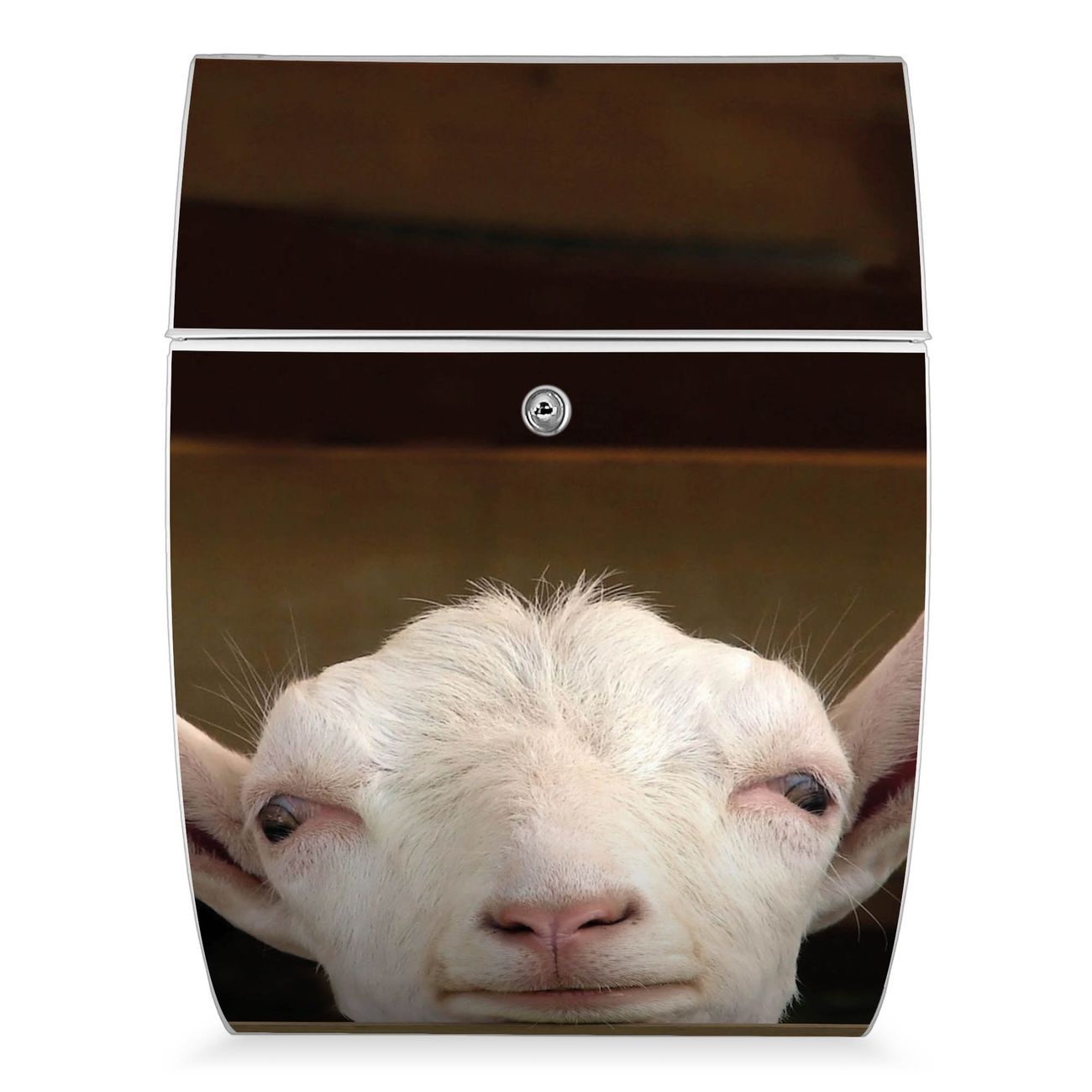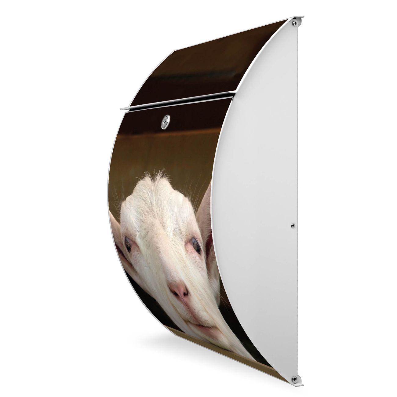 Der weiße Burg Wächter Design Briefkasten mit Motiv Ziege bietet Ihnen mit seinem Fassungsvermögen genügend Platz auch für große A4 Sendungen. Auf Wunsch können Sie bei uns auch den passenden Ständer kaufen und so aus dem Wandbriefkasten einen Standbriefkasten machen.