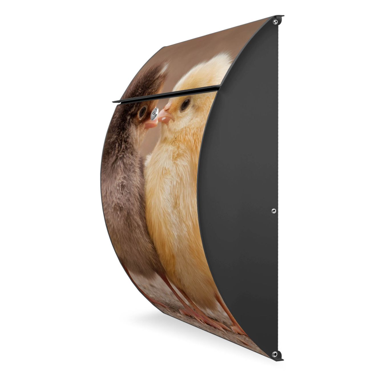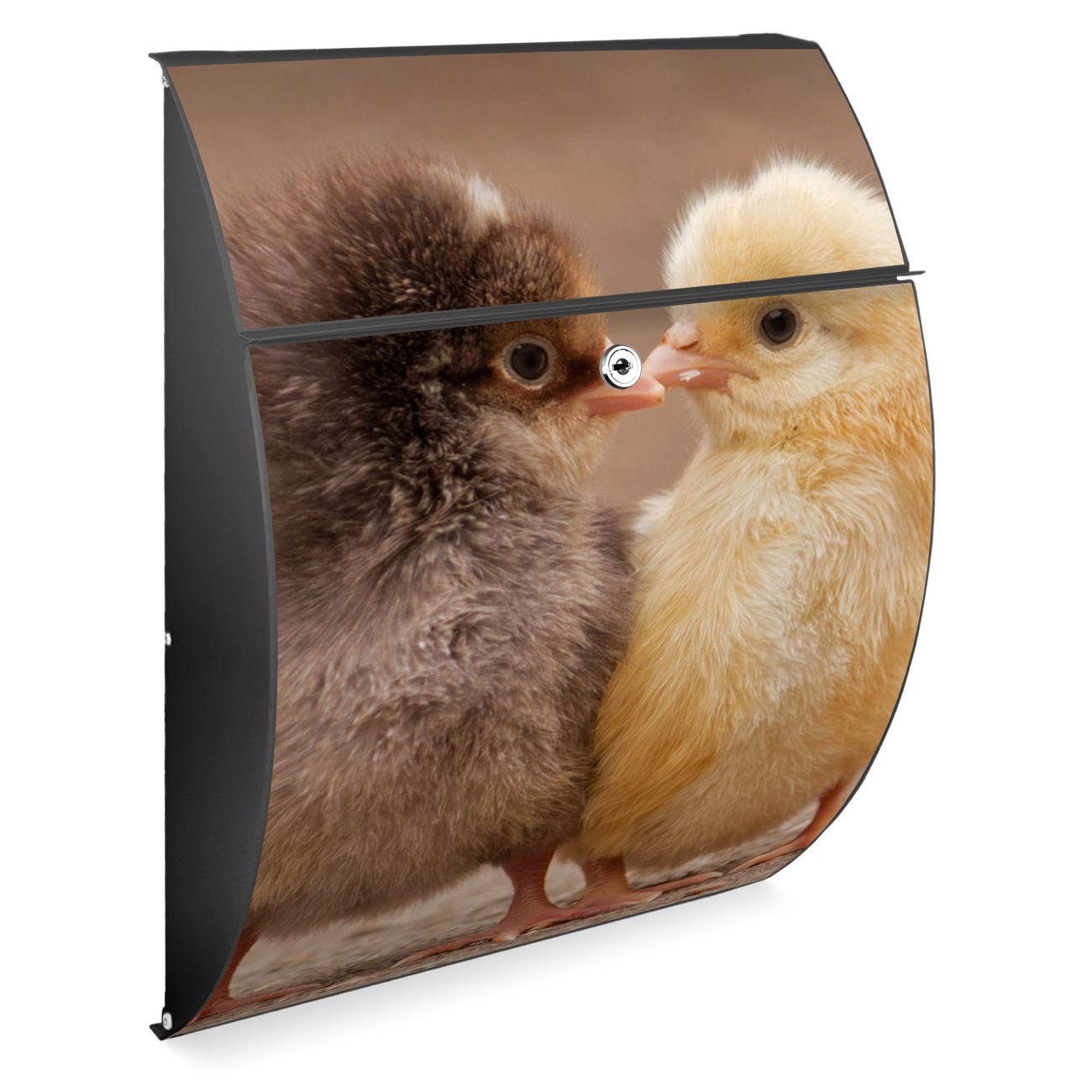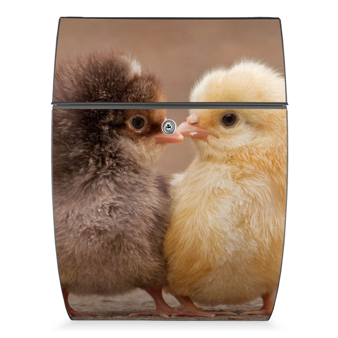 Der Burg Wächter Design Briefkasten mit Motiv Zwei Küken bietet Ihnen mit seinem Fassungsvermögen genügend Platz auch für große A4 Sendungen. Auf Wunsch können Sie bei uns den passenden Ständer kaufen und so aus dem Wandbriefkasten einen Standbriefkasten machen.