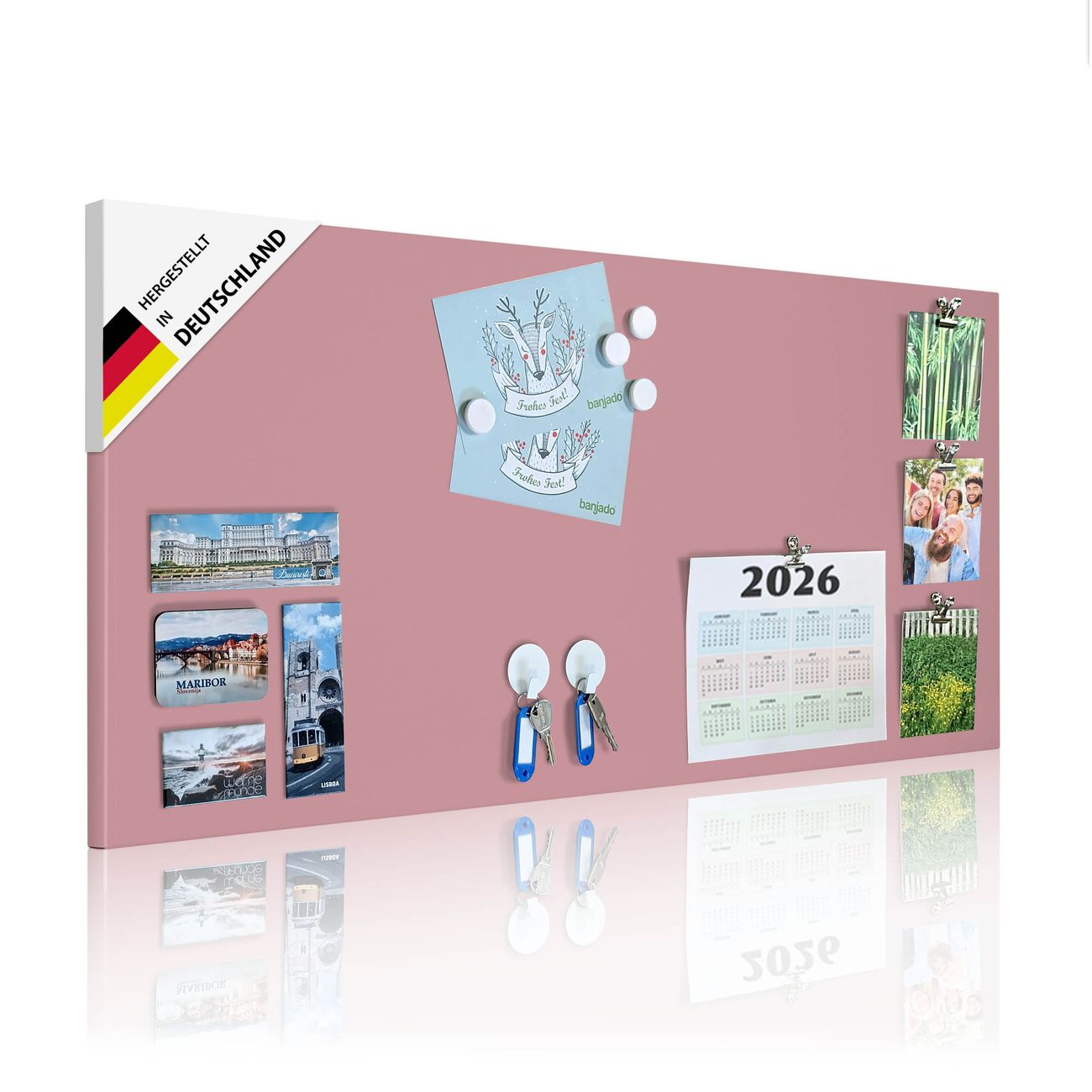 FUNKTION: Die banjado Magnettafel mit Motiv bringt Ordnung in Ihr Zettelchaos. Fotos, Termine, Notizen oder Rezepte lassen Sich hier stilvoll mit Magneten ordnen, Sie behalten alles im Blick. An der Design Magnettafel halten alle handesüblichen Magnete. DESIGN: Die magnetische Pinnwand mit dem Motiv ist ein eleganter Begleiter im Alltag. Mit dieser Memotafel aus Metall haben Sie auch ohne Notizen und Magnete ein schönes Dekoelement. Das Format bietet Ihnen ausreichend Platz um alle wichtigen Informationen im Blick zu behalten. DETAILS: Die Magnettafel besteht aus Rosafarben, weiß oder schwarzlackiertem Stahl. Sie hat eine Größe von 37 x 78 x 2cm. Es befinden sich auf der Rückseite vorgefertigte Aufhängungen die eine schnelle und unkomplizierte Anbringung ermöglichen. Das Motiv ist mit einem seidenmatten Laminat versehen und schützt so zusätzlich vor Kratzern. NUTZEN: Sie können dieses Memoboard groß als Wandbild nutzen, es halten alle handelsüblichen Magneten daran. Die Pinnwand ist mit einem feuchten Lappen oder Schwamm abwischbar. Sie finden bei uns eine große Auswahl an passenden Magneten. BANJADO: Wir sind ein kleines Team aus dem Herzen von Sachsen. Wir fertigen alle Artikel von Hand für Sie an, Sie erhalten keine preiswerte Importware. Auf Wunsch können Sie auch Ihr eigenes Foto auf die Magnettafel aufbringen, schreiben Sie uns an. Herzlichst, Ihr banjado-Team