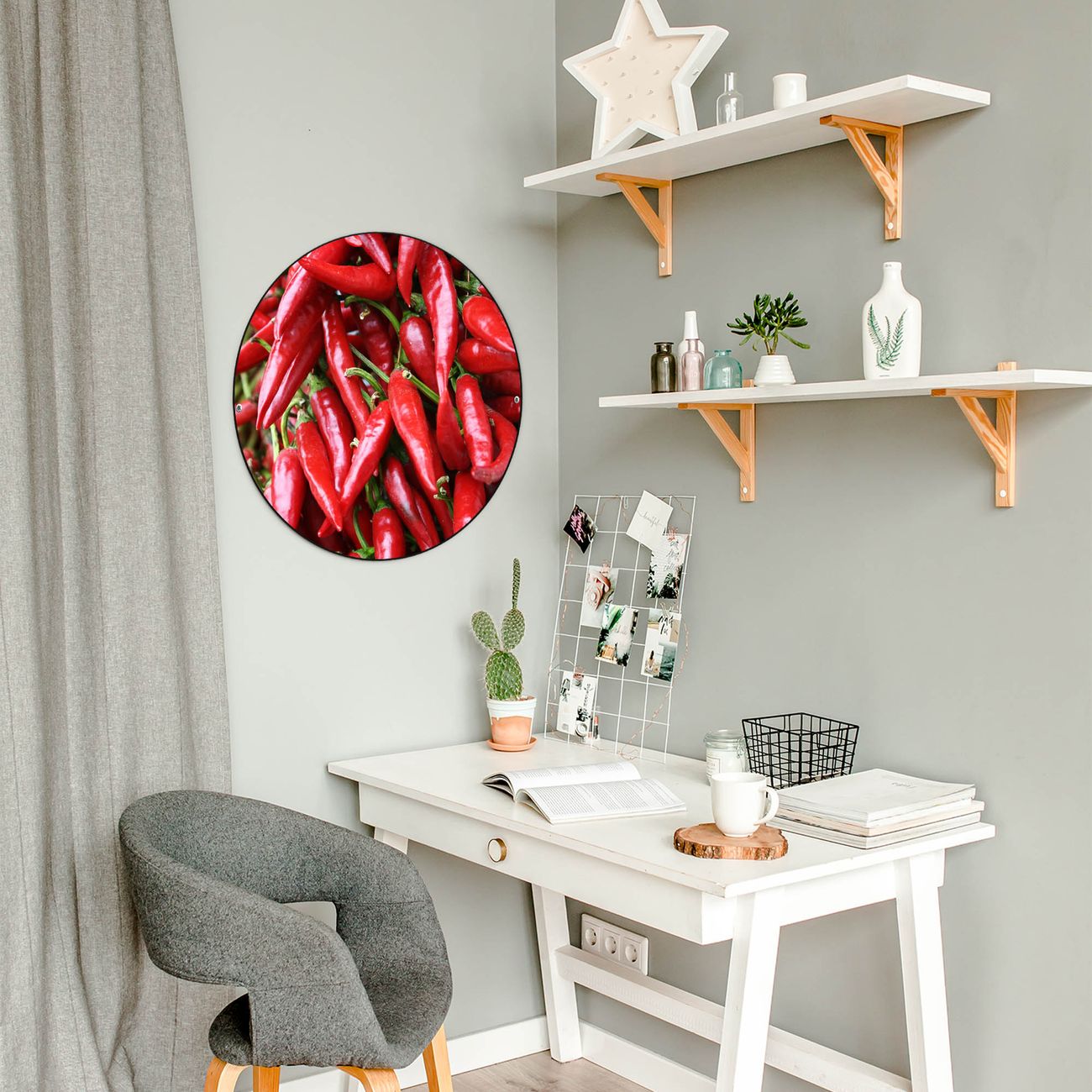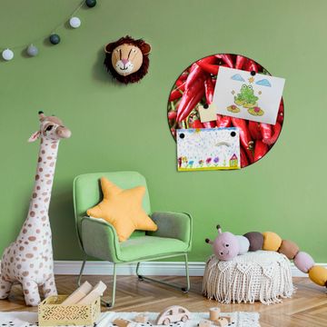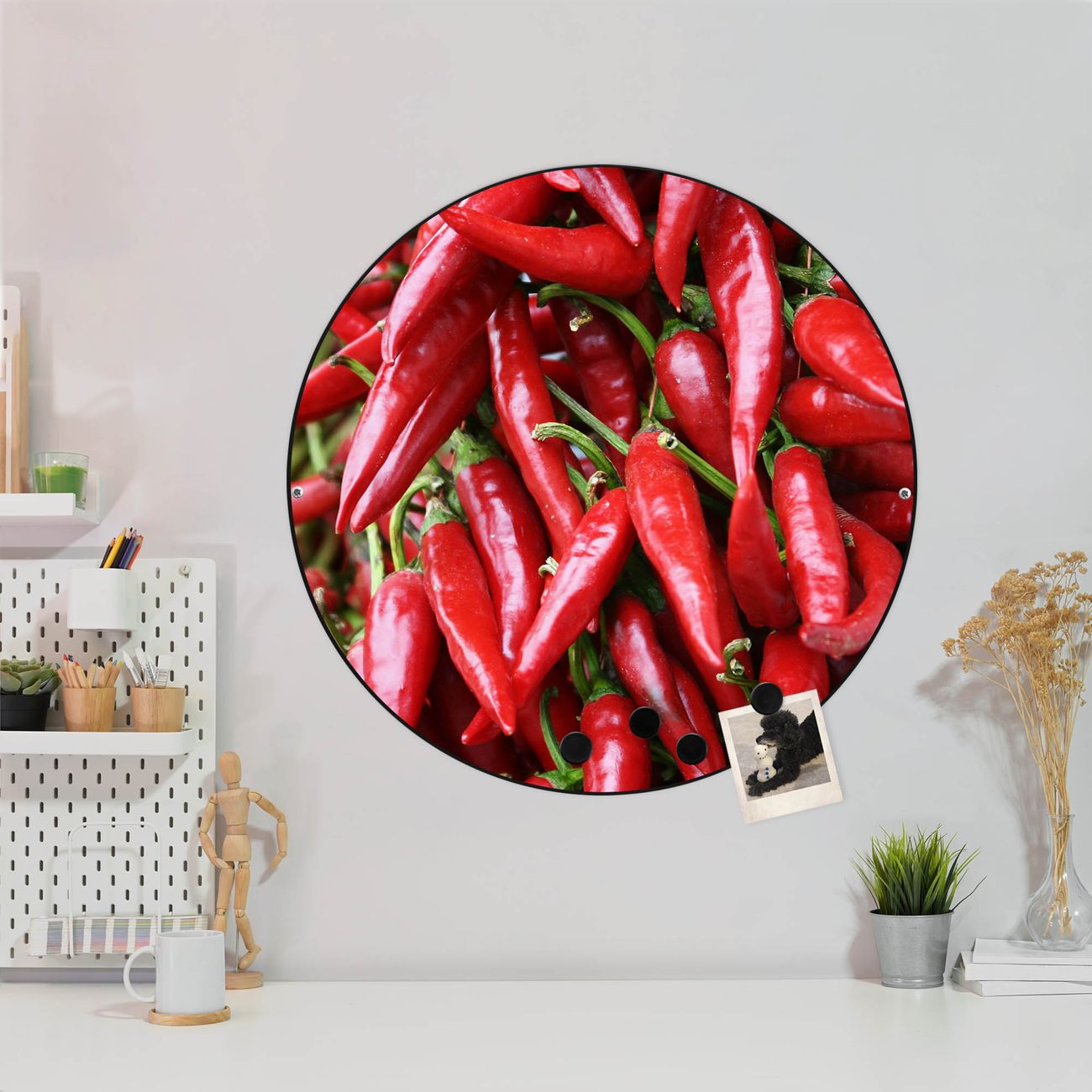 FUNKTION / DESIGN Die banjado Magnettafel mit dem Motiv Motiv Chilli bringt Ordnung in Ihr Zettelchaos. Fotos, Termine, Notizen oder Rezepte lassen Sich hier stilvoll mit Magneten ordnen, Sie behalten alles im Blick. Die Design Magnetwand ist beschreibbar und wieder abwischbar. Mit dieser Pinnwand haben Sie auch ohne Notizen und Magneten ein schönes Dekoelement. Das Format bietet Ihnen ausreichend Platz um alle wichtigen Informationen im Blick zu behalten. DETAILS / NUTZEN Die magnetische Metall Pinnwand besteht aus schwarz lackiertem Stahl. Sie hat einen Durchmesser von 47cm. Es befinden sich an den Seiten zwei vorgefertigte Löcher die eine schnelle und unkomplizierte Anbringung ermöglichen. Das Motiv ist mit einem seidenmatten Laminat versehen und schützt so zusätzlich vor Kratzern. Es halten alle handelsüblichen Magneten daran. Wir sind ein kleines Team aus dem Herzen von Sachsen. Wir fertigen alle Artikel von Hand für Sie an, Sie erhalten keine preiswerte Importware. Auf Wunsch können Sie auch Ihr eigenes Foto auf die Magnettafel aufbringen, schreiben Sie uns an.