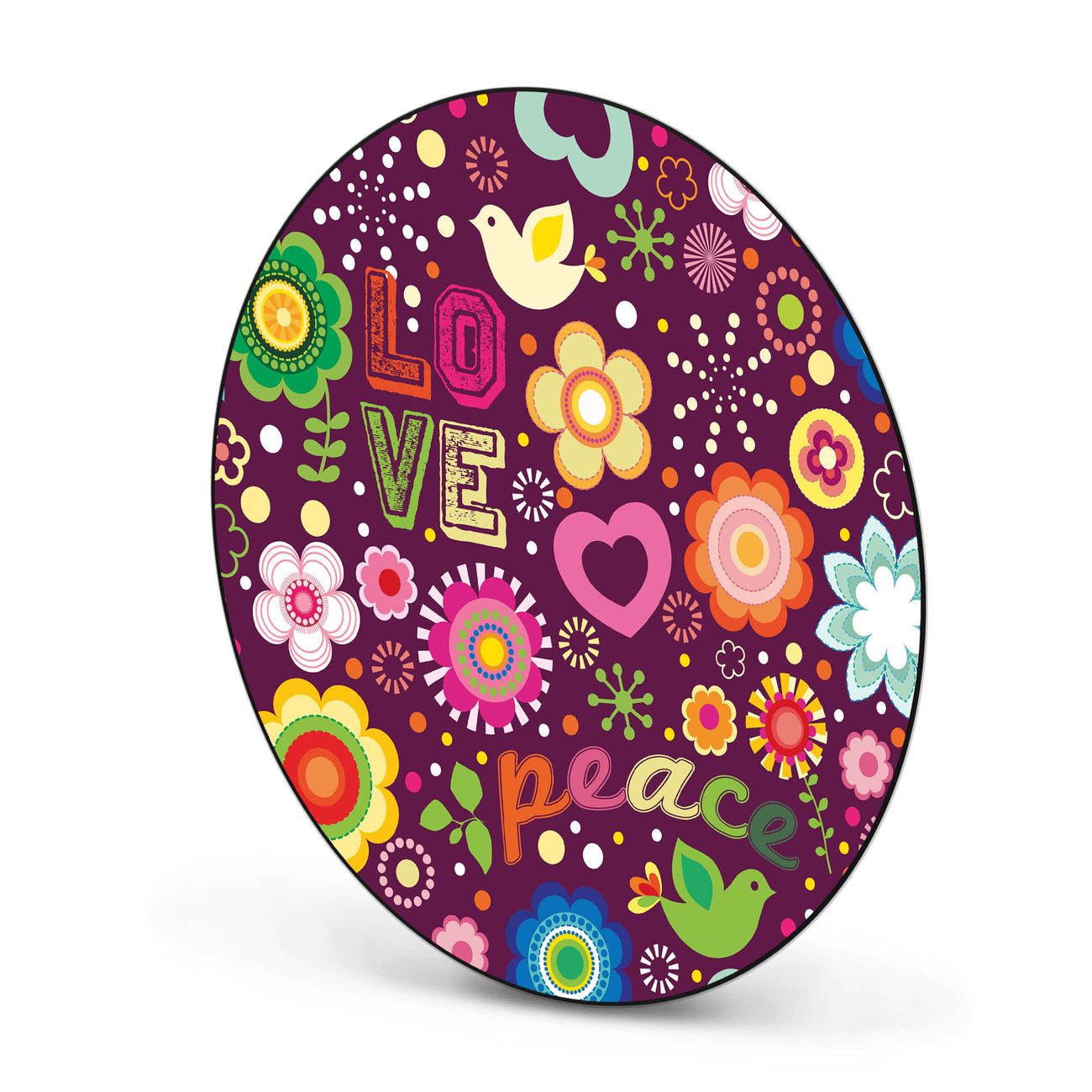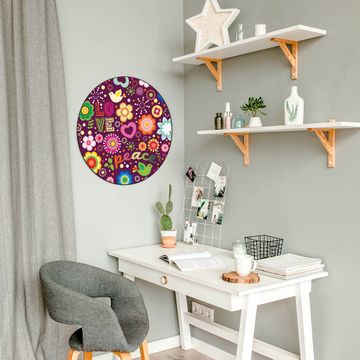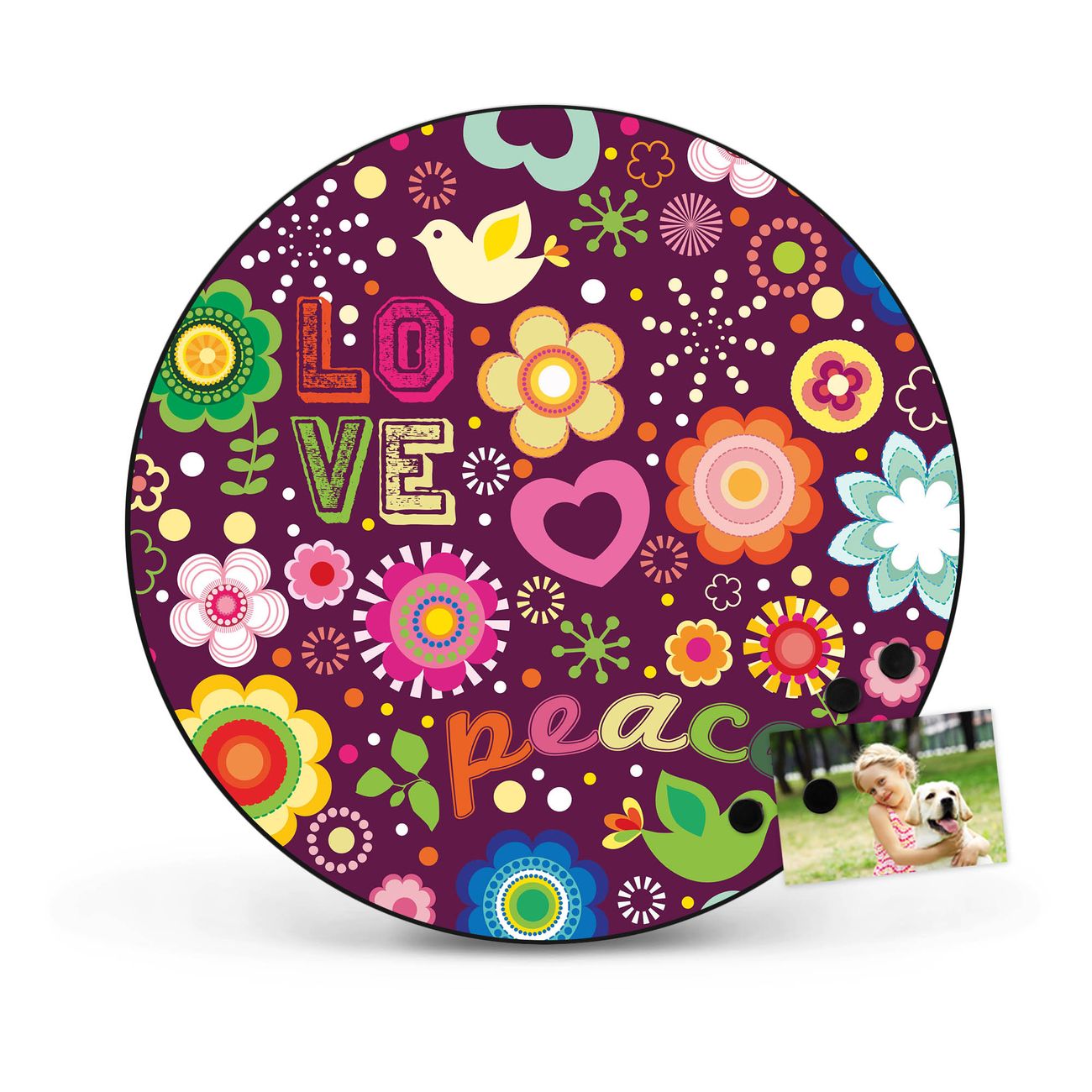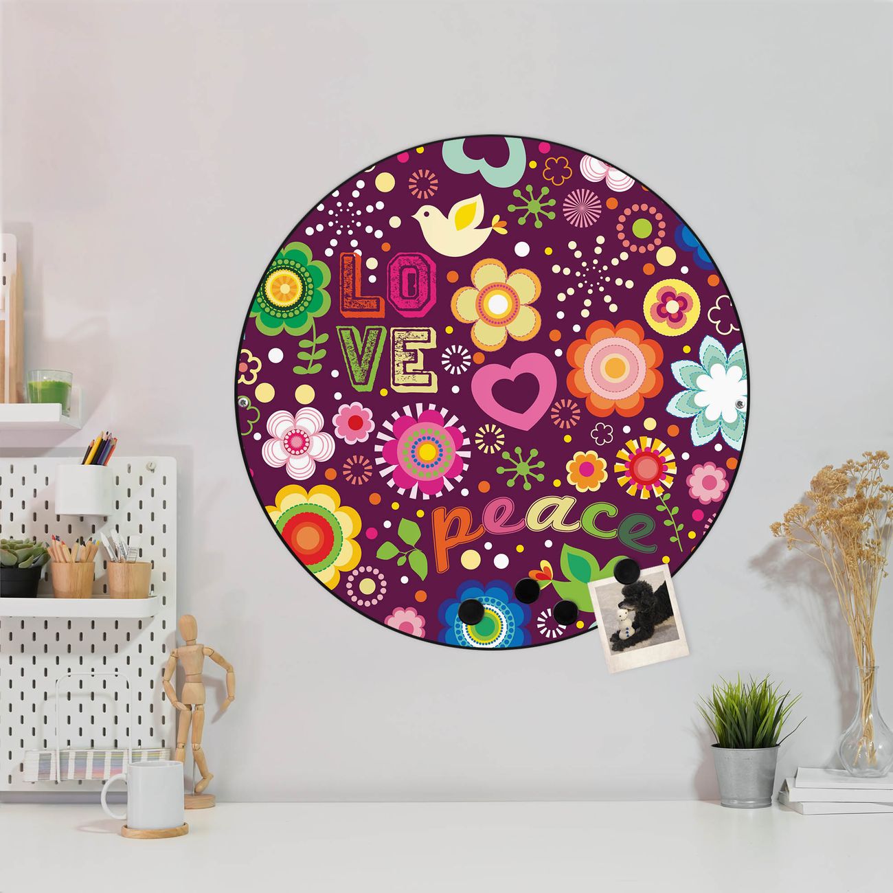 FUNKTION / DESIGN Die banjado Magnettafel mit dem Motiv Motiv Love and Peace bringt Ordnung in Ihr Zettelchaos. Fotos, Termine, Notizen oder Rezepte lassen Sich hier stilvoll mit Magneten ordnen, Sie behalten alles im Blick. Die Design Magnetwand ist beschreibbar und wieder abwischbar. Mit dieser Pinnwand haben Sie auch ohne Notizen und Magneten ein schönes Dekoelement. Das Format bietet Ihnen ausreichend Platz um alle wichtigen Informationen im Blick zu behalten. DETAILS / NUTZEN Die magnetische Metall Pinnwand besteht aus schwarz lackiertem Stahl. Sie hat einen Durchmesser von 47cm. Es befinden sich an den Seiten zwei vorgefertigte Löcher die eine schnelle und unkomplizierte Anbringung ermöglichen. Das Motiv ist mit einem seidenmatten Laminat versehen und schützt so zusätzlich vor Kratzern. Es halten alle handelsüblichen Magneten daran. Wir sind ein kleines Team aus dem Herzen von Sachsen. Wir fertigen alle Artikel von Hand für Sie an, Sie erhalten keine preiswerte Importware. Auf Wunsch können Sie auch Ihr eigenes Foto auf die Magnettafel aufbringen, schreiben Sie uns an.