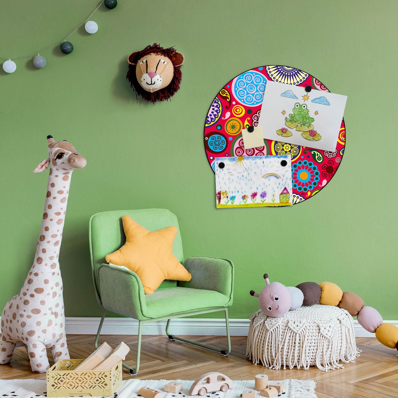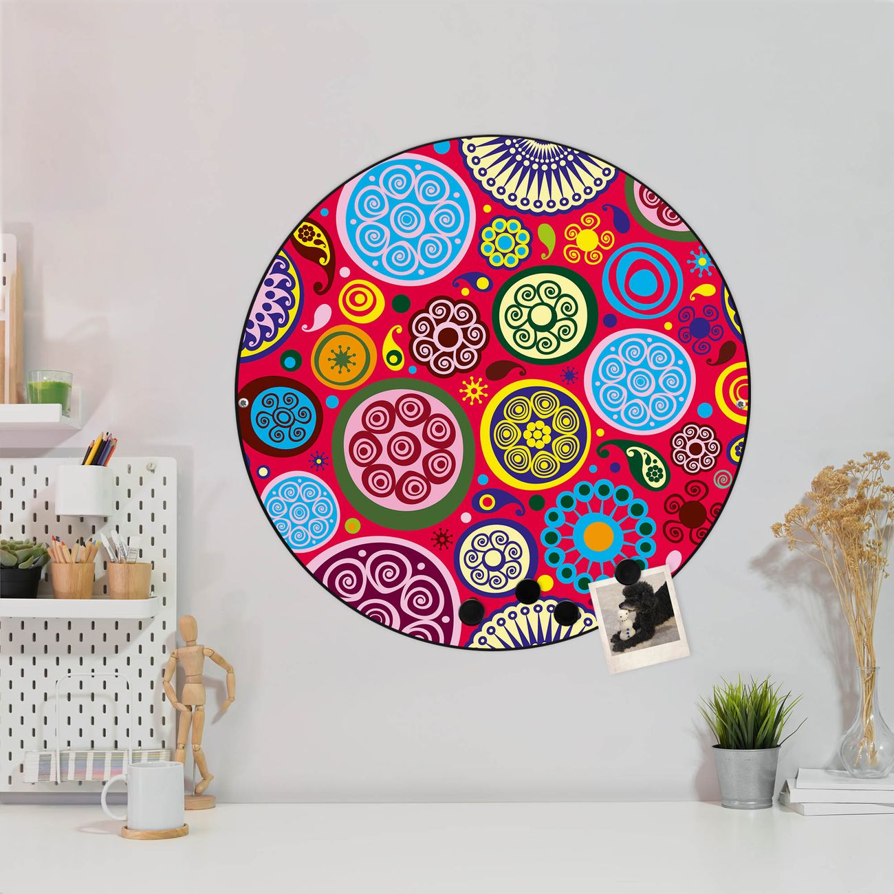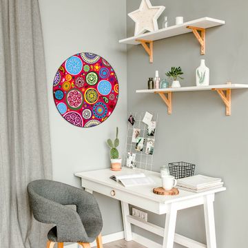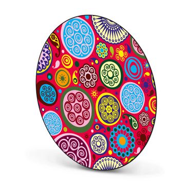 FUNKTION / DESIGN Die banjado Magnettafel mit dem Motiv Motiv Retro Kreise bringt Ordnung in Ihr Zettelchaos. Fotos, Termine, Notizen oder Rezepte lassen Sich hier stilvoll mit Magneten ordnen, Sie behalten alles im Blick. Die Design Magnetwand ist beschreibbar und wieder abwischbar. Mit dieser Pinnwand haben Sie auch ohne Notizen und Magneten ein schönes Dekoelement. Das Format bietet Ihnen ausreichend Platz um alle wichtigen Informationen im Blick zu behalten. DETAILS / NUTZEN Die magnetische Metall Pinnwand besteht aus schwarz lackiertem Stahl. Sie hat einen Durchmesser von 47cm. Es befinden sich an den Seiten zwei vorgefertigte Löcher die eine schnelle und unkomplizierte Anbringung ermöglichen. Das Motiv ist mit einem seidenmatten Laminat versehen und schützt so zusätzlich vor Kratzern. Es halten alle handelsüblichen Magneten daran. Wir sind ein kleines Team aus dem Herzen von Sachsen. Wir fertigen alle Artikel von Hand für Sie an, Sie erhalten keine preiswerte Importware. Auf Wunsch können Sie auch Ihr eigenes Foto auf die Magnettafel aufbringen, schreiben Sie uns an.