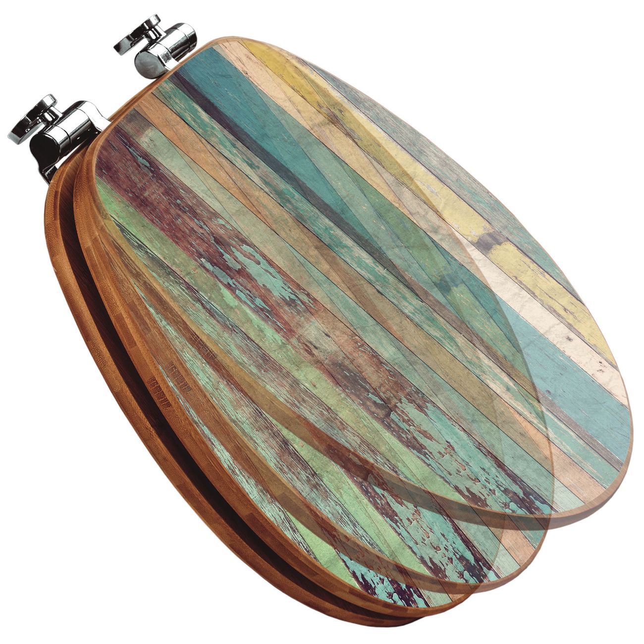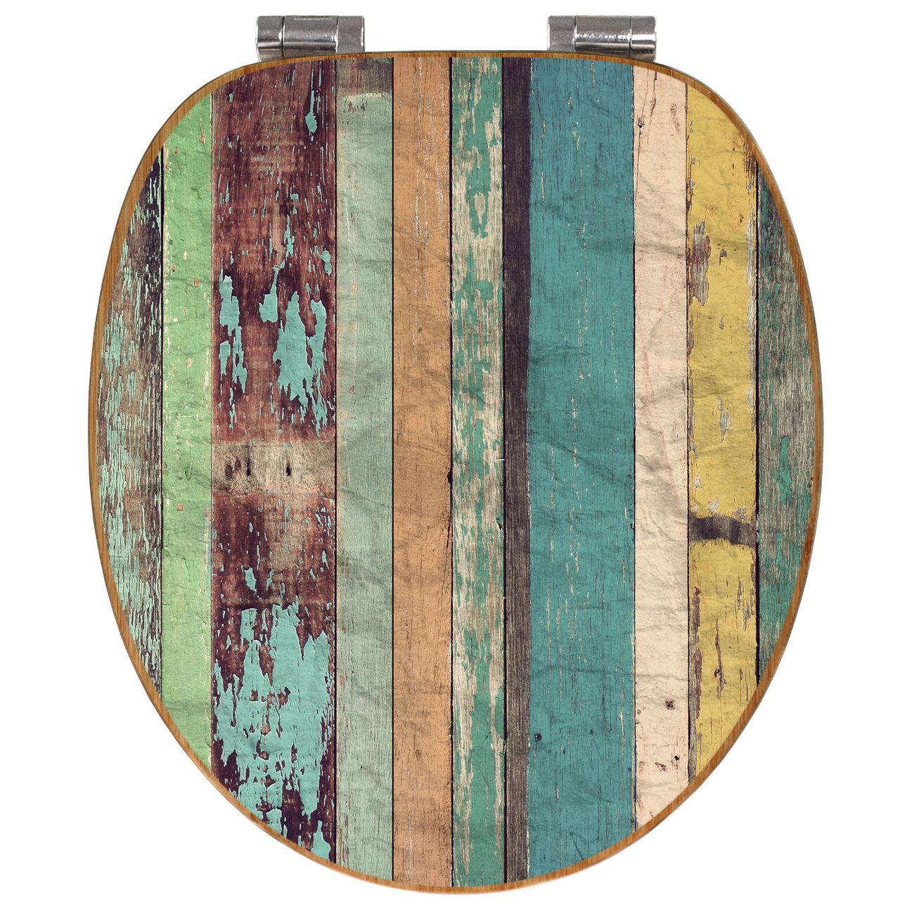 Mit dem banjado Toilettensitz in Bambus verbinden Sie Design und Funktionalität. Sie erhalten den WC-Sitz mit bewährter Holz Qualität und Universal Scharnieren. Das Motiv Motiv Bunte Bretterwand besteht aus einer schutzlaminierten Motivfolie, die durch das Schutzlaminat zusätzlich vor Kratzern schützt. Durch diesen Motivdruck wird der WC-Sitz zu einem Blickfang in Ihrem Bad.