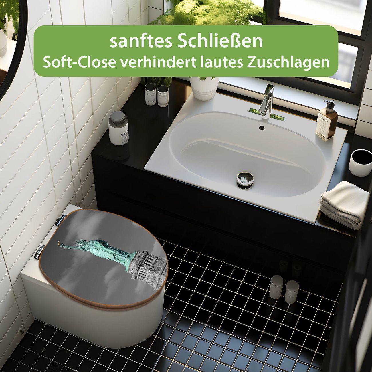Design WC-Sitz Bambus Absenkautomatik Motiv Freiheitsstatue