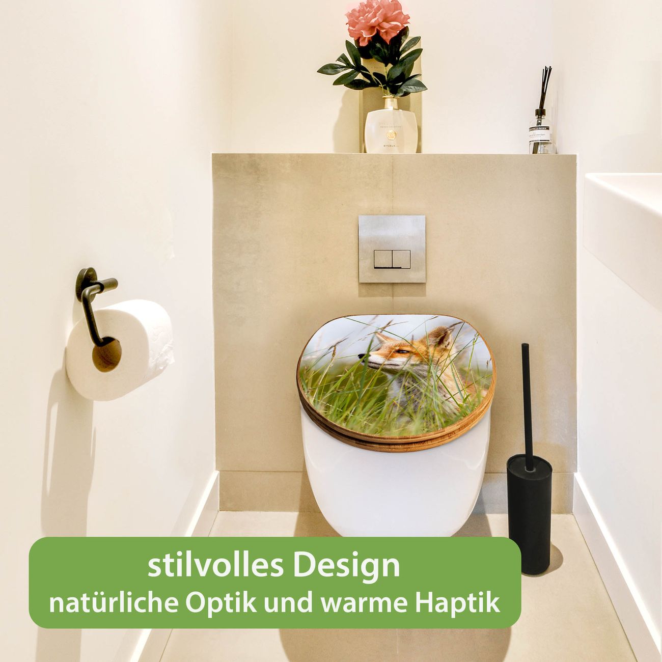 Mit dem banjado Toilettensitz in Bambus verbinden Sie Design und Funktionalität. Sie erhalten den WC-Sitz mit bewährter Holz Qualität und Universal Scharnieren. Das Motiv Motiv Fuchs besteht aus einer schutzlaminierten Motivfolie, die durch das Schutzlaminat zusätzlich vor Kratzern schützt. Durch diesen Motivdruck wird der WC-Sitz zu einem Blickfang in Ihrem Bad.