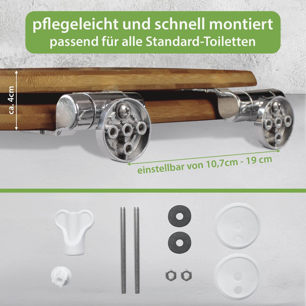 Der Klodeckel besteht aus robustem Bambus, die Scharniere sind aus bruchsicherem Metall - Materialien die Ihnen eine leichte und hygienische Reinigung ermöglichen. Die Gesamtgröße beträgt 45,8cm x 37,5cm x 5,5cm. Der WC-Sitz besitzt eine Absenkautomatik für höchsten Bedienkomfort. Der WC Sitz ist universal geeignet für alle gängigen Toilettenschüsseln. Mit Hilfe der detaillierten Aufbauanleitung ermöglichen wir eine schnelle und unkomplizierte Montage. Für ein hygienisches und leichtes Reinigen können Sie den Toilettendeckel genauso einfach wieder abnehmen. Bitte beachten Sie, das es sich dabei um ein Naturprodukt handelt und dadurch Abweichungen zu unseren Produktbildern auftreten können.