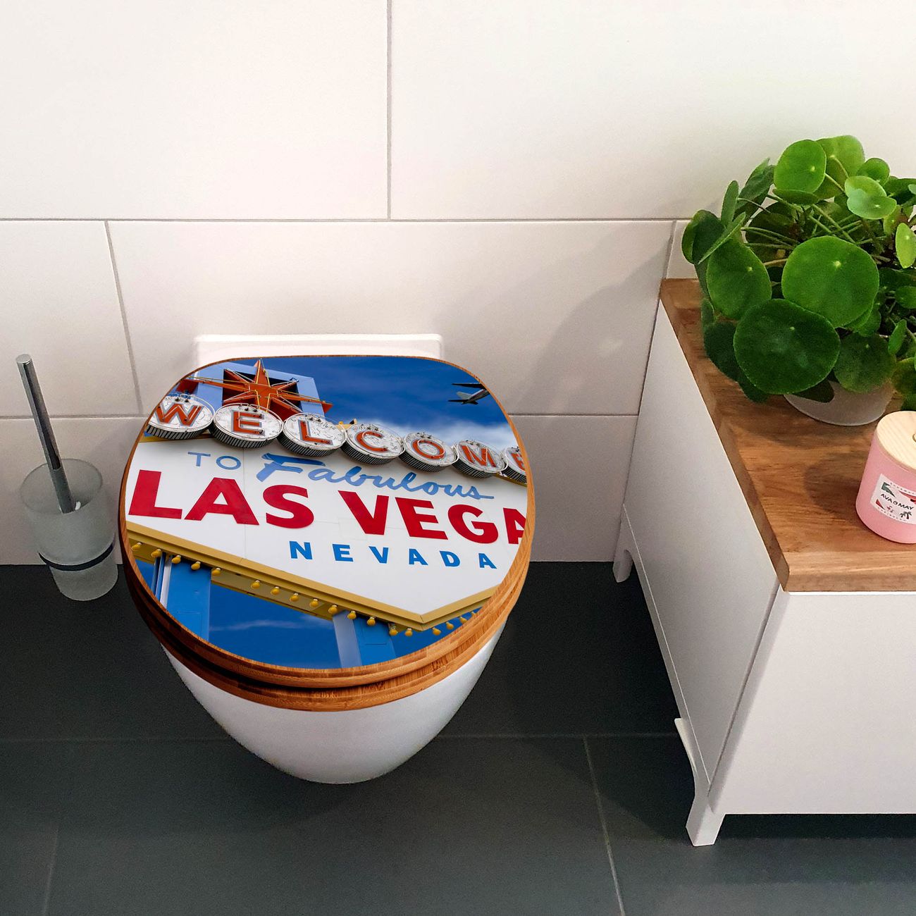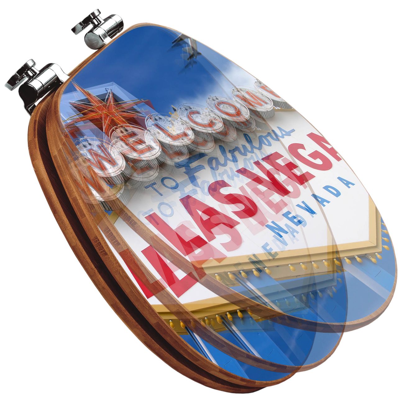 Mit dem banjado Toilettensitz in Bambus verbinden Sie Design und Funktionalität. Sie erhalten den WC-Sitz mit bewährter Holz Qualität und Universal Scharnieren. Das Motiv Motiv Las Vegas besteht aus einer schutzlaminierten Motivfolie, die durch das Schutzlaminat zusätzlich vor Kratzern schützt. Durch diesen Motivdruck wird der WC-Sitz zu einem Blickfang in Ihrem Bad.