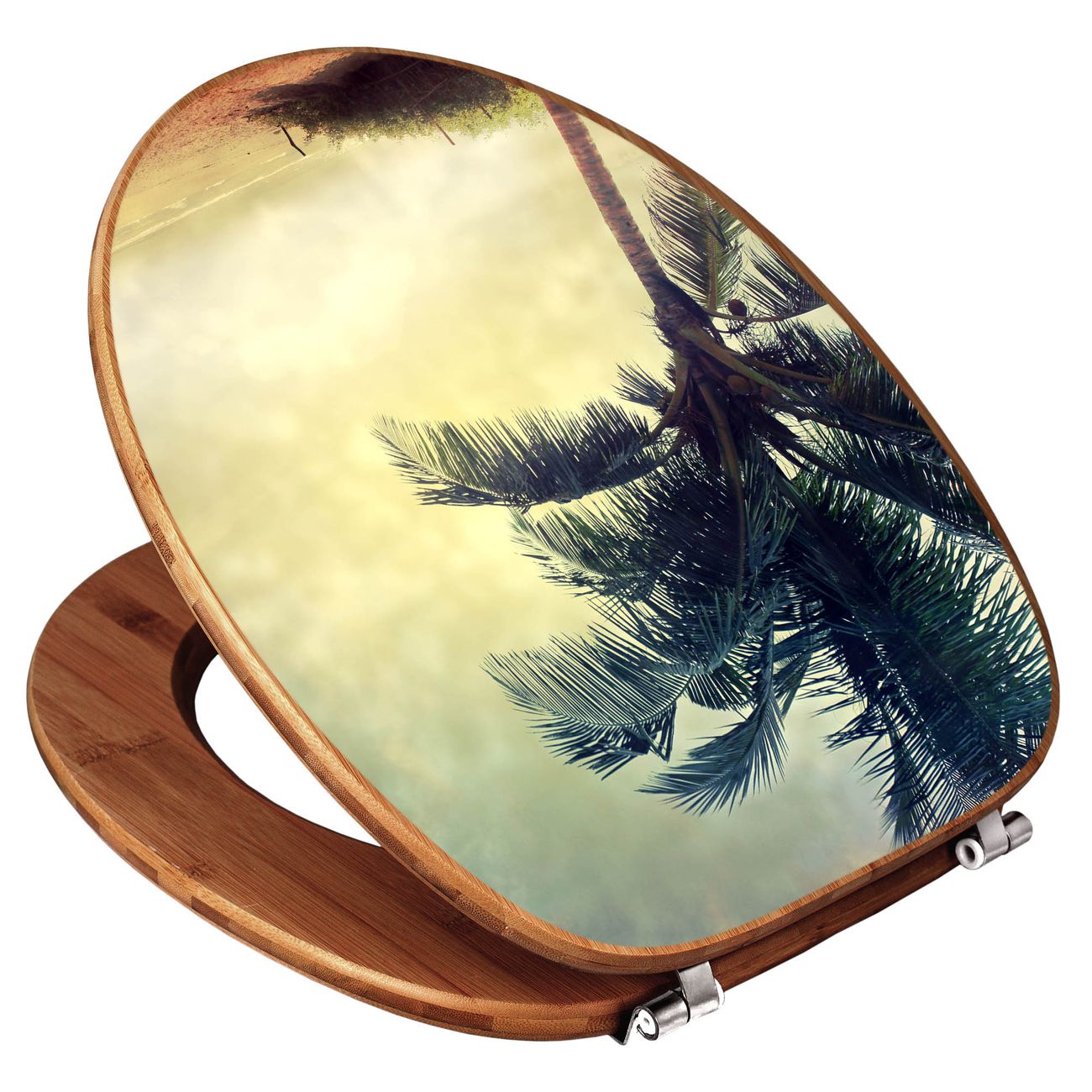 Mit dem banjado Toilettensitz in Bambus verbinden Sie Design und Funktionalität. Sie erhalten den WC-Sitz mit bewährt schwerer Holz Qualität und Universal Scharnieren. Das Motiv Motiv Palme am Strand besteht aus einer schutzlaminierten Motivfolie, die durch das Schutzlaminat zusätzlich vor Kratzern schützt. Durch diesen Motivdruck wird der WC-Sitz zu einem Blickfang in Ihrem Bad.