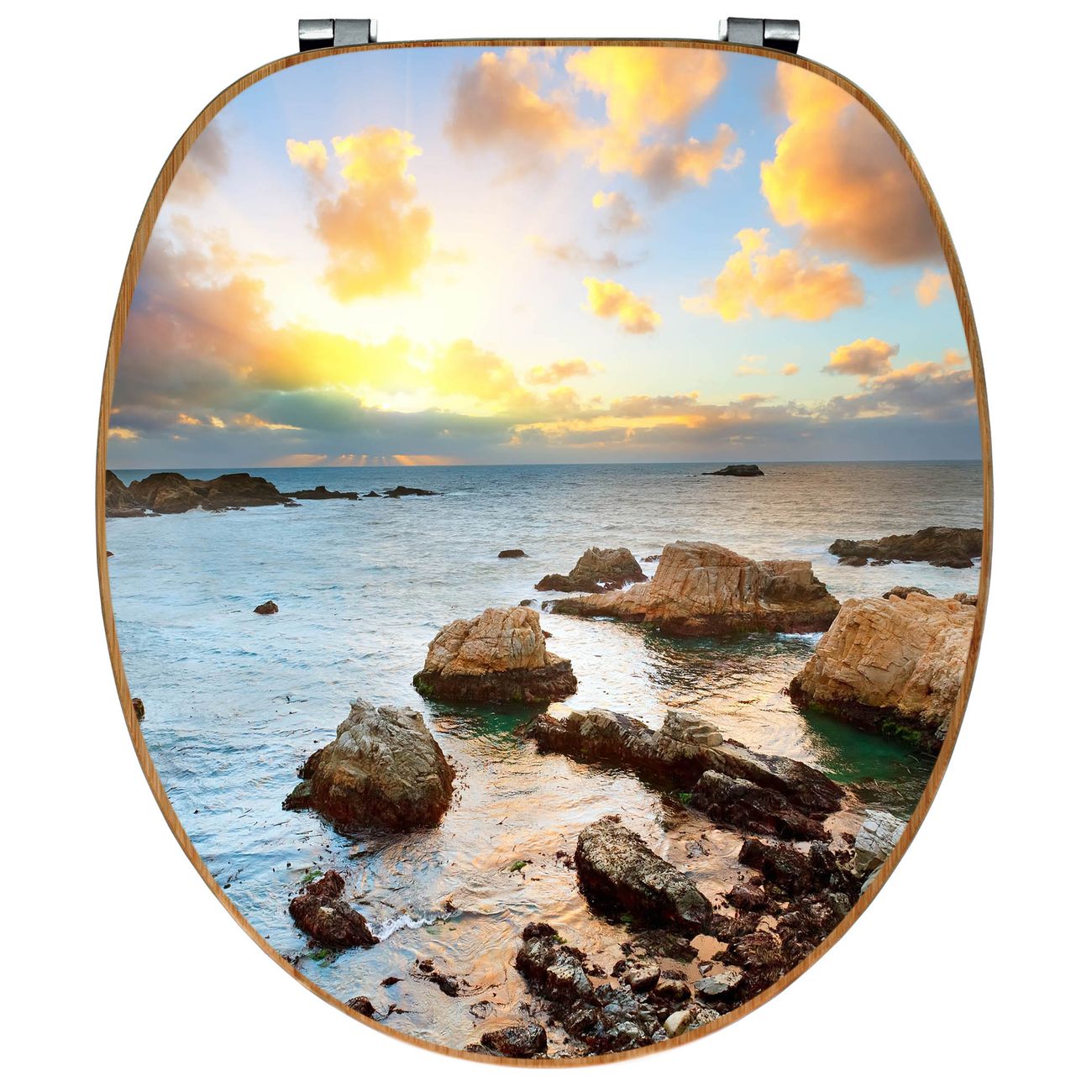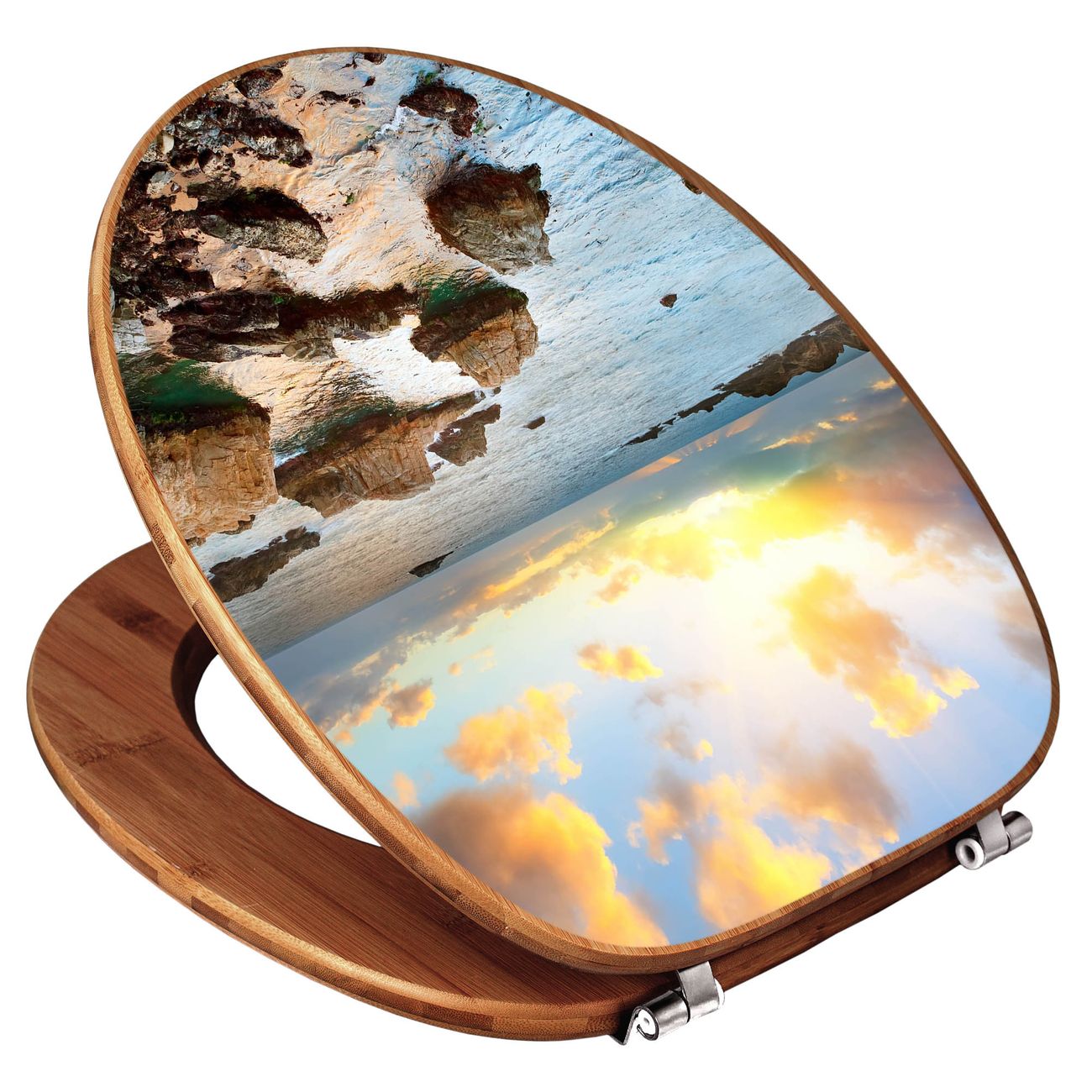 Mit dem banjado Toilettensitz in Bambus verbinden Sie Design und Funktionalität. Sie erhalten den WC-Sitz mit bewährt schwerer Holz Qualität und Universal Scharnieren. Das Motiv Motiv Sonnenaufgang am Meer besteht aus einer schutzlaminierten Motivfolie, die durch das Schutzlaminat zusätzlich vor Kratzern schützt. Durch diesen Motivdruck wird der WC-Sitz zu einem Blickfang in Ihrem Bad.
