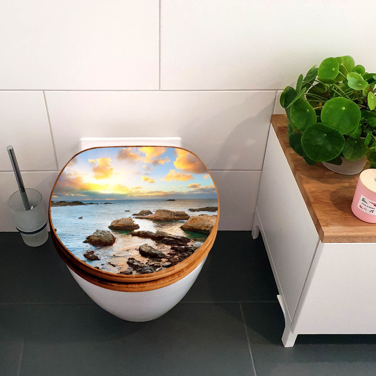 Design WC-Sitz Bambus Holz Motiv Sonnenaufgang am Meer