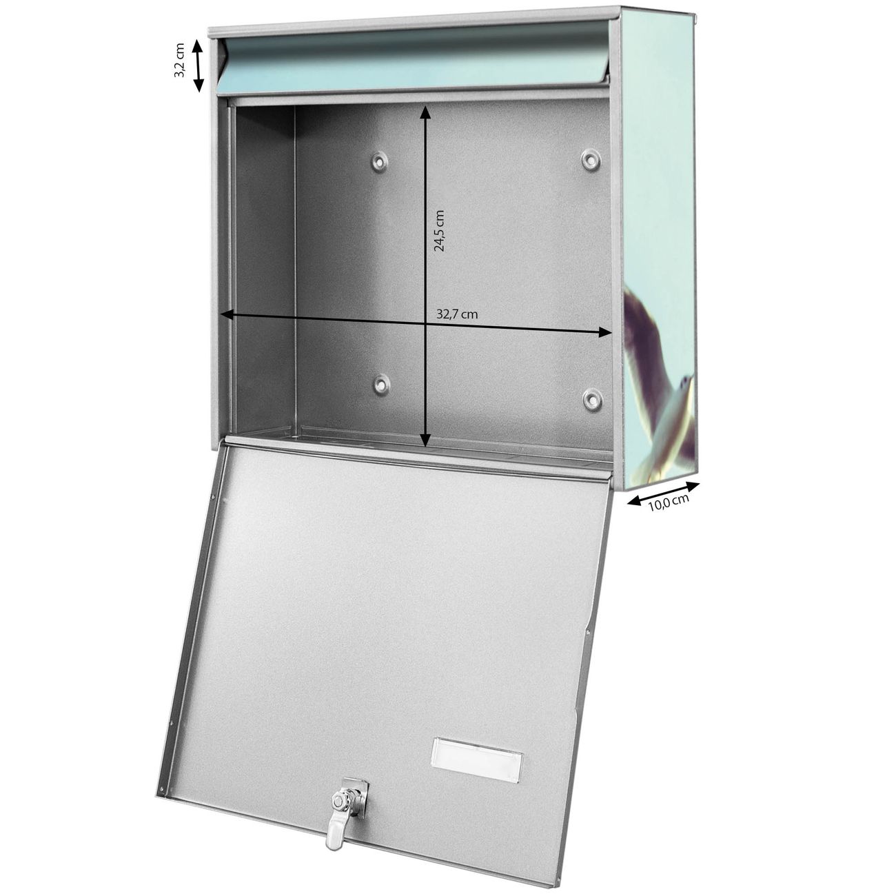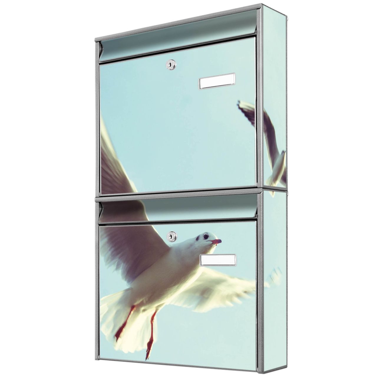 FUNKTION: Die Burg-Wächter Briefkastenanlage mit Motiv 2 Möwen bietet Ihnen ausreichend Fassungsvermögen um auch A4 und C4 Sendungen zu empfangen. Das integrierte Namensschild lässt sich individuell beschriften. Wählen Sie aus den Grundfarben weiß, silber und schwarz. DESIGN: Die 2 Briefkästen haben ein ansprechendes und zeitloses Design, ohne dabei auf Funktionalität zu verzichten. Das Material ist sehr stabil, wetterfest und rostfrei. Durch das Motiv 2 Möwen werden die Postkästen zu einem Blickfang. DETAILS: Die Postkästen bestehen aus verzinktem Stahl der zusätzlich mit Klarlack versiegelt wurde. Die Kästen sind gesamt 64,5cm hoch, 36,2cm breit und 10cm tief. Das Motiv besteht aus einer wetter- und UV-festen Folie, die Ihren Briefkasten zusätzlich vor Kratzern schützt. Die Postkästen werden mit Montagematerial, je einem Namensschild und je zwei Schlüsseln geliefert. NUTZEN: Das Briefkastenset eignet sich für die Wandmontage, die Größe bietet genügend Platz für Sendungen aller Art. Das zeitlose Design sowie die stabile Bauart bieten Ihnen einen treuen Begleiter für Ihre Post. BANJADO: