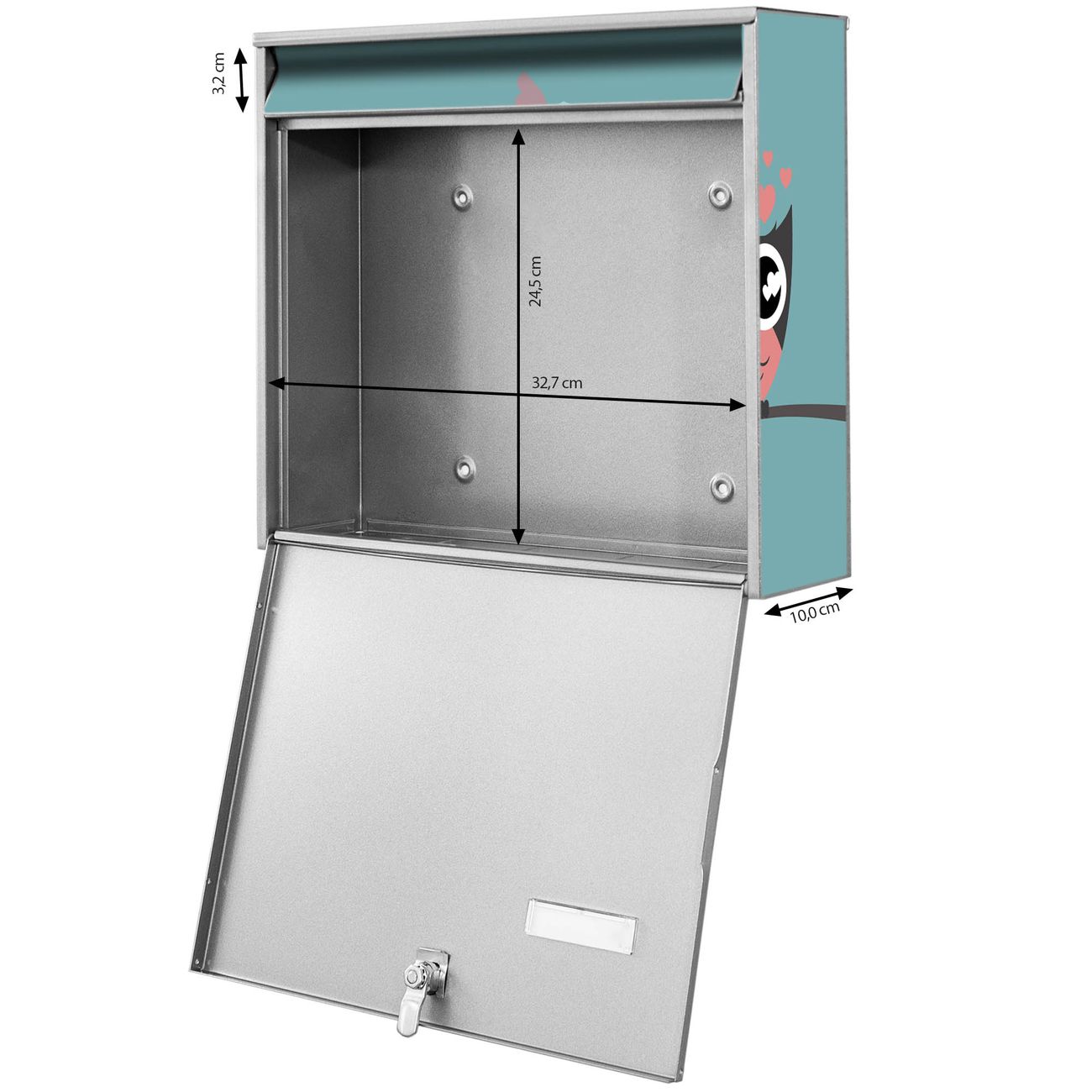 FUNKTION: Die Burg-Wächter Briefkastenanlage mit Motiv Acht Eulen bietet Ihnen ausreichend Fassungsvermögen um auch A4 und C4 Sendungen zu empfangen. Das integrierte Namensschild lässt sich individuell beschriften. Wählen Sie aus den Grundfarben weiß, silber und schwarz. DESIGN: Die 2 Briefkästen haben ein ansprechendes und zeitloses Design, ohne dabei auf Funktionalität zu verzichten. Das Material ist sehr stabil, wetterfest und rostfrei. Durch das Motiv Acht Eulen werden die Postkästen zu einem Blickfang. DETAILS: Die Postkästen bestehen aus verzinktem Stahl der zusätzlich mit Klarlack versiegelt wurde. Die Kästen sind gesamt 64,5cm hoch, 36,2cm breit und 10cm tief. Das Motiv besteht aus einer wetter- und UV-festen Folie, die Ihren Briefkasten zusätzlich vor Kratzern schützt. Die Postkästen werden mit Montagematerial, je einem Namensschild und je zwei Schlüsseln geliefert. NUTZEN: Das Briefkastenset eignet sich für die Wandmontage, die Größe bietet genügend Platz für Sendungen aller Art. Das zeitlose Design sowie die stabile Bauart bieten Ihnen einen treuen Begleiter für Ihre Post. BANJADO: