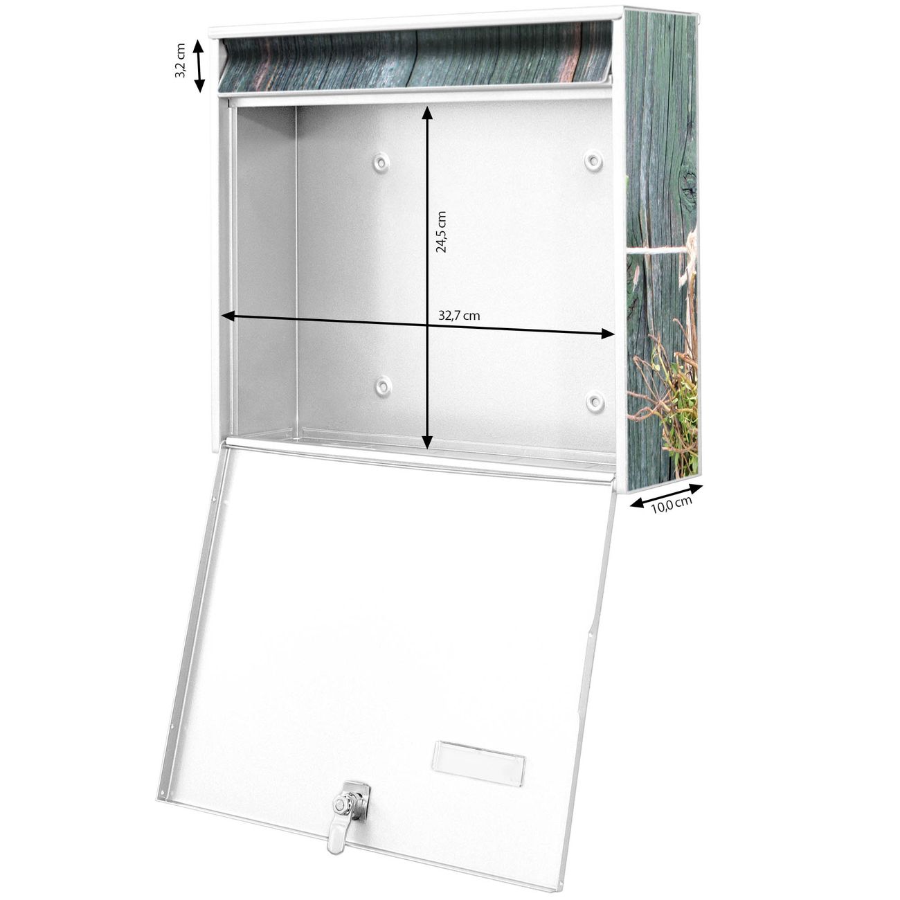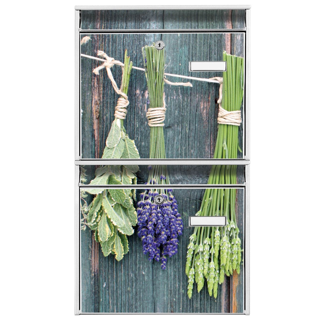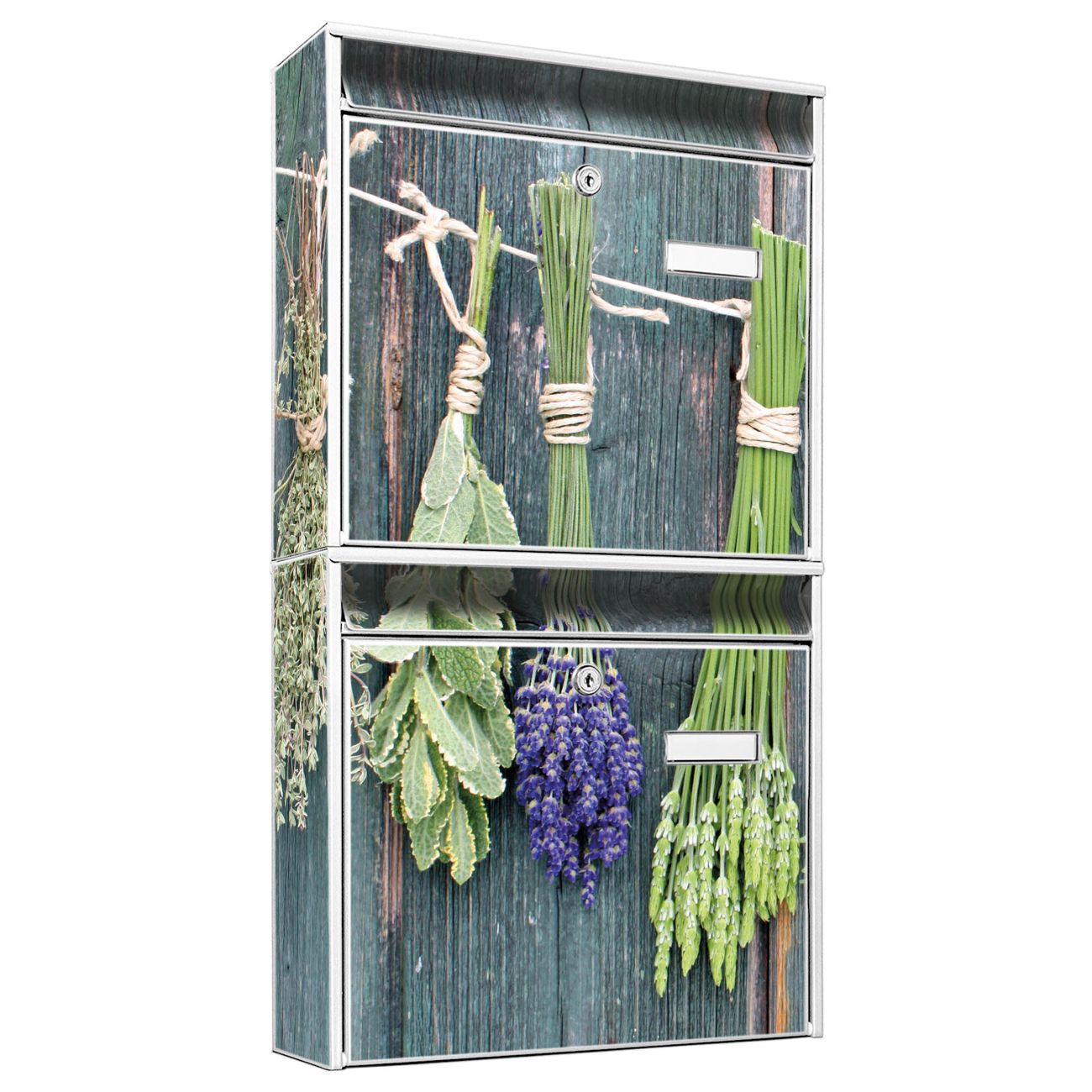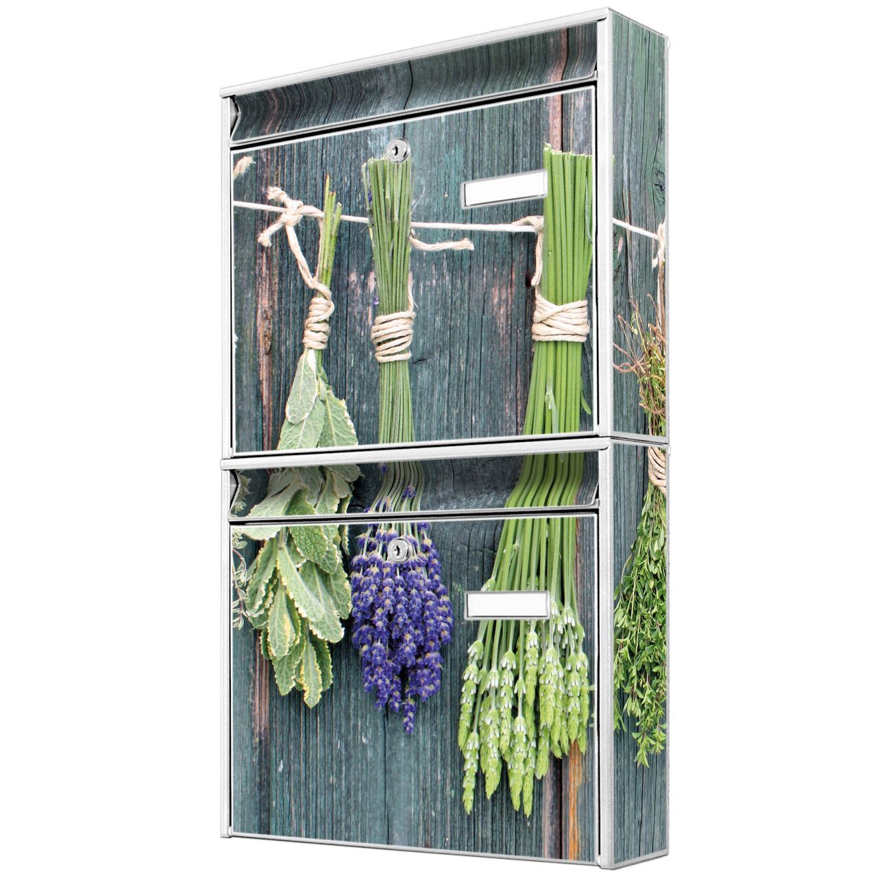 FUNKTION: Die Burg-Wächter Briefkastenanlage mit Motiv Acht Kräuter bietet Ihnen ausreichend Fassungsvermögen um auch A4 und C4 Sendungen zu empfangen. Das integrierte Namensschild lässt sich individuell beschriften. Wählen Sie aus den Grundfarben weiß, silber und schwarz. DESIGN: Die 2 Briefkästen haben ein ansprechendes und zeitloses Design, ohne dabei auf Funktionalität zu verzichten. Das Material ist sehr stabil, wetterfest und rostfrei. Durch das Motiv Acht Kräuter werden die Postkästen zu einem Blickfang. DETAILS: Die Postkästen bestehen aus verzinktem Stahl der zusätzlich mit Klarlack versiegelt wurde. Die Kästen sind gesamt 64,5cm hoch, 36,2cm breit und 10cm tief. Das Motiv besteht aus einer wetter- und UV-festen Folie, die Ihren Briefkasten zusätzlich vor Kratzern schützt. Die Postkästen werden mit Montagematerial, je einem Namensschild und je zwei Schlüsseln geliefert. NUTZEN: Das Briefkastenset eignet sich für die Wandmontage, die Größe bietet genügend Platz für Sendungen aller Art. Das zeitlose Design sowie die stabile Bauart bieten Ihnen einen treuen Begleiter für Ihre Post. BANJADO: