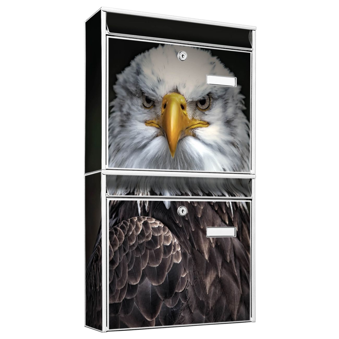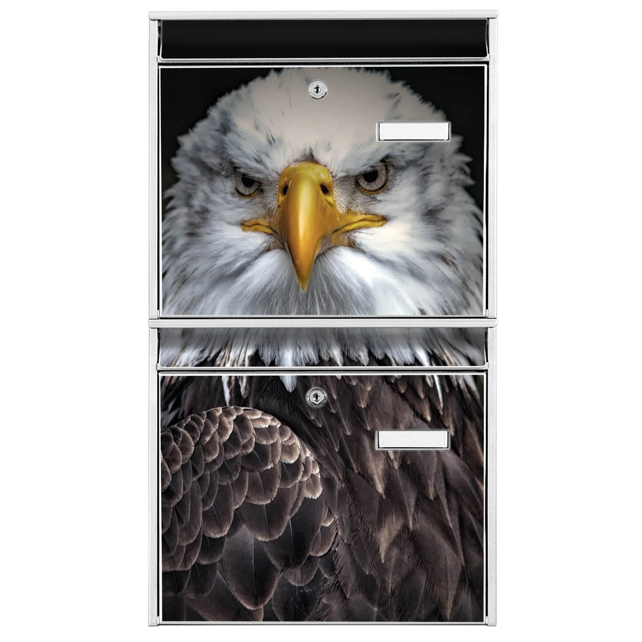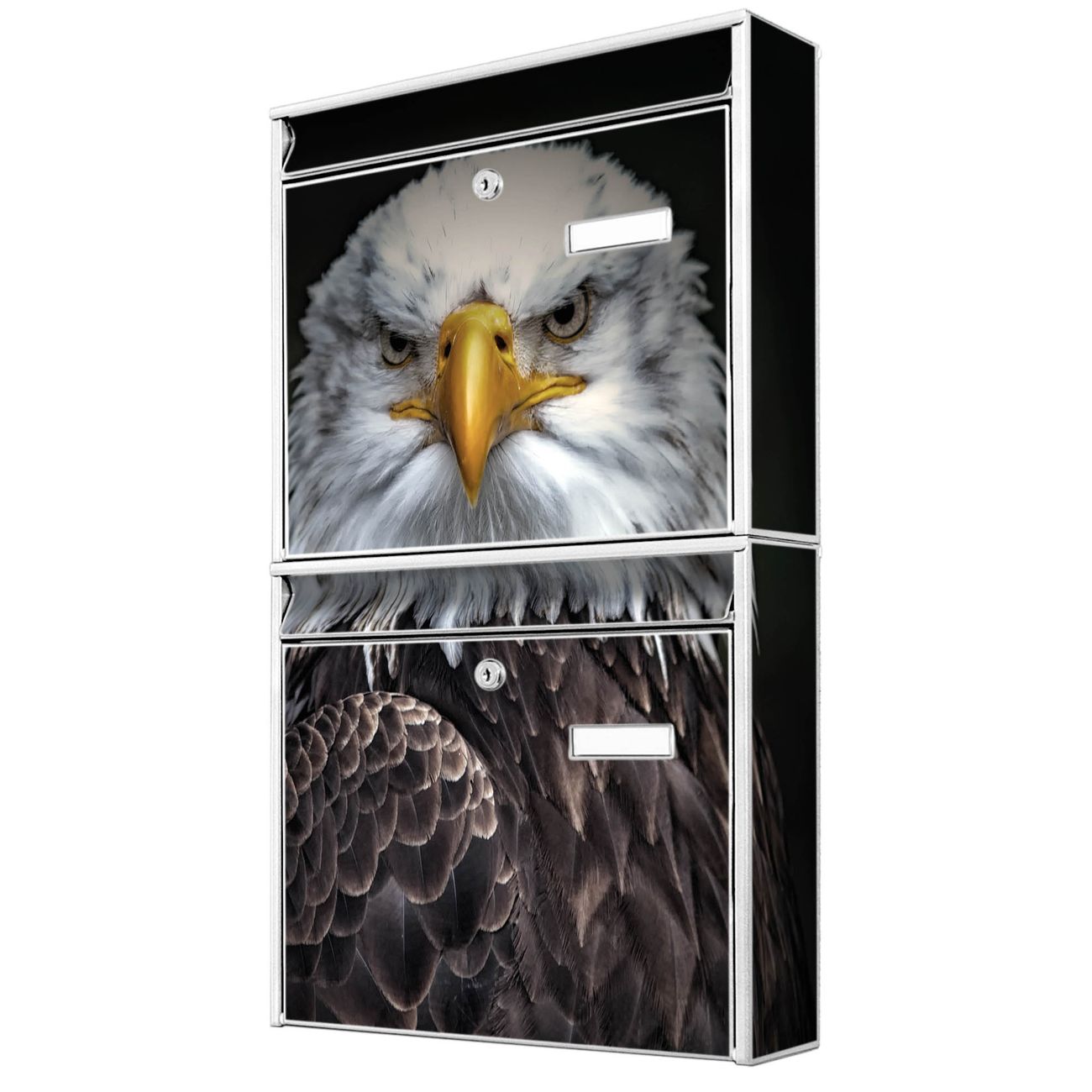 FUNKTION: Die Burg-Wächter Briefkastenanlage mit Motiv Adler bietet Ihnen ausreichend Fassungsvermögen um auch A4 und C4 Sendungen zu empfangen. Das integrierte Namensschild lässt sich individuell beschriften. Wählen Sie aus den Grundfarben weiß, silber und schwarz. DESIGN: Die 2 Briefkästen haben ein ansprechendes und zeitloses Design, ohne dabei auf Funktionalität zu verzichten. Das Material ist sehr stabil, wetterfest und rostfrei. Durch das Motiv Adler werden die Postkästen zu einem Blickfang. DETAILS: Die Postkästen bestehen aus verzinktem Stahl der zusätzlich mit Klarlack versiegelt wurde. Die Kästen sind gesamt 64,5cm hoch, 36,2cm breit und 10cm tief. Das Motiv besteht aus einer wetter- und UV-festen Folie, die Ihren Briefkasten zusätzlich vor Kratzern schützt. Die Postkästen werden mit Montagematerial, je einem Namensschild und je zwei Schlüsseln geliefert. NUTZEN: Das Briefkastenset eignet sich für die Wandmontage, die Größe bietet genügend Platz für Sendungen aller Art. Das zeitlose Design sowie die stabile Bauart bieten Ihnen einen treuen Begleiter für Ihre Post. BANJADO: