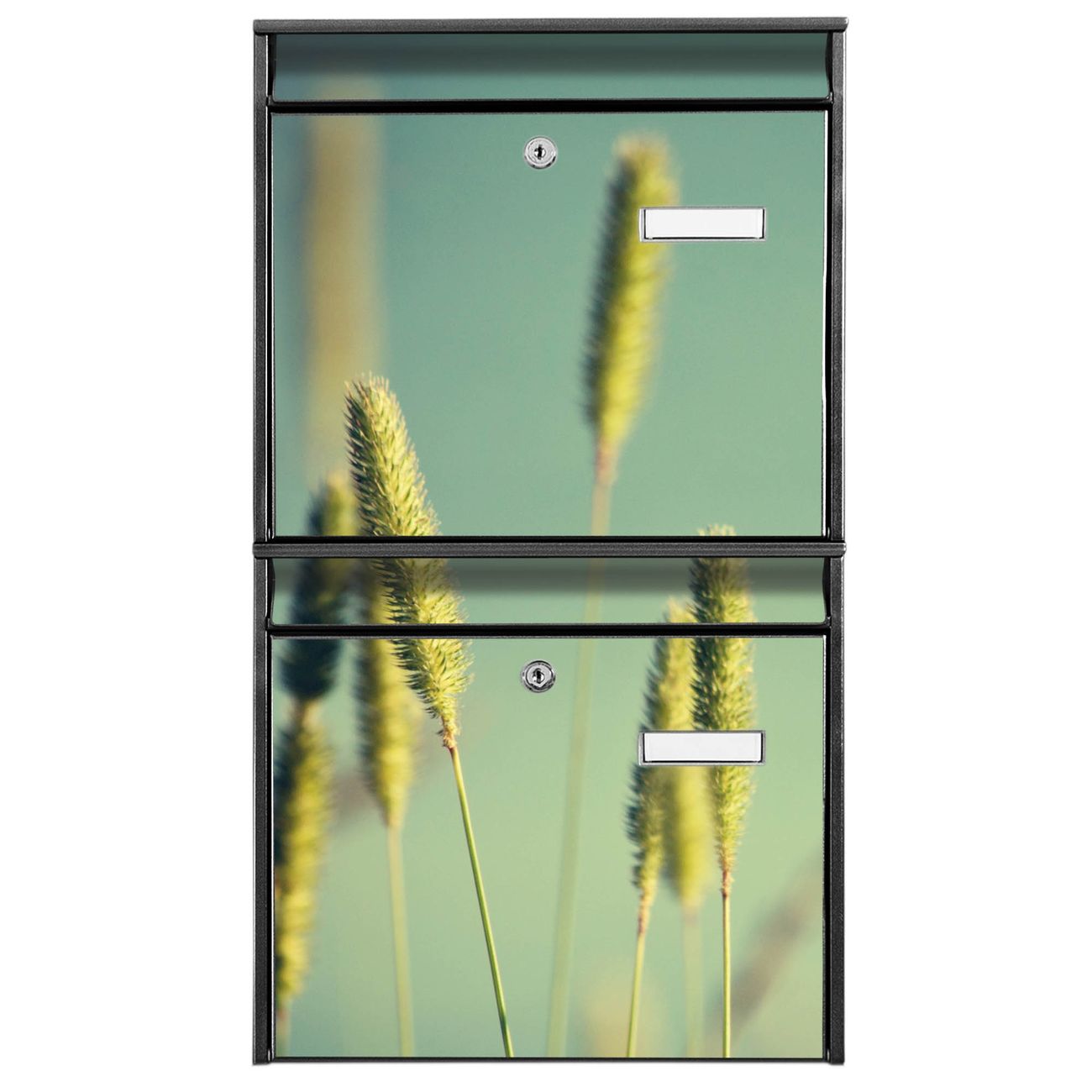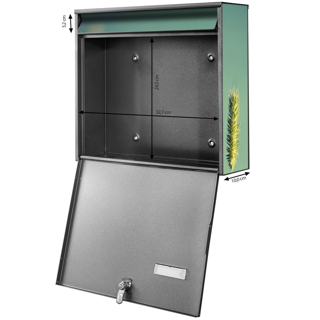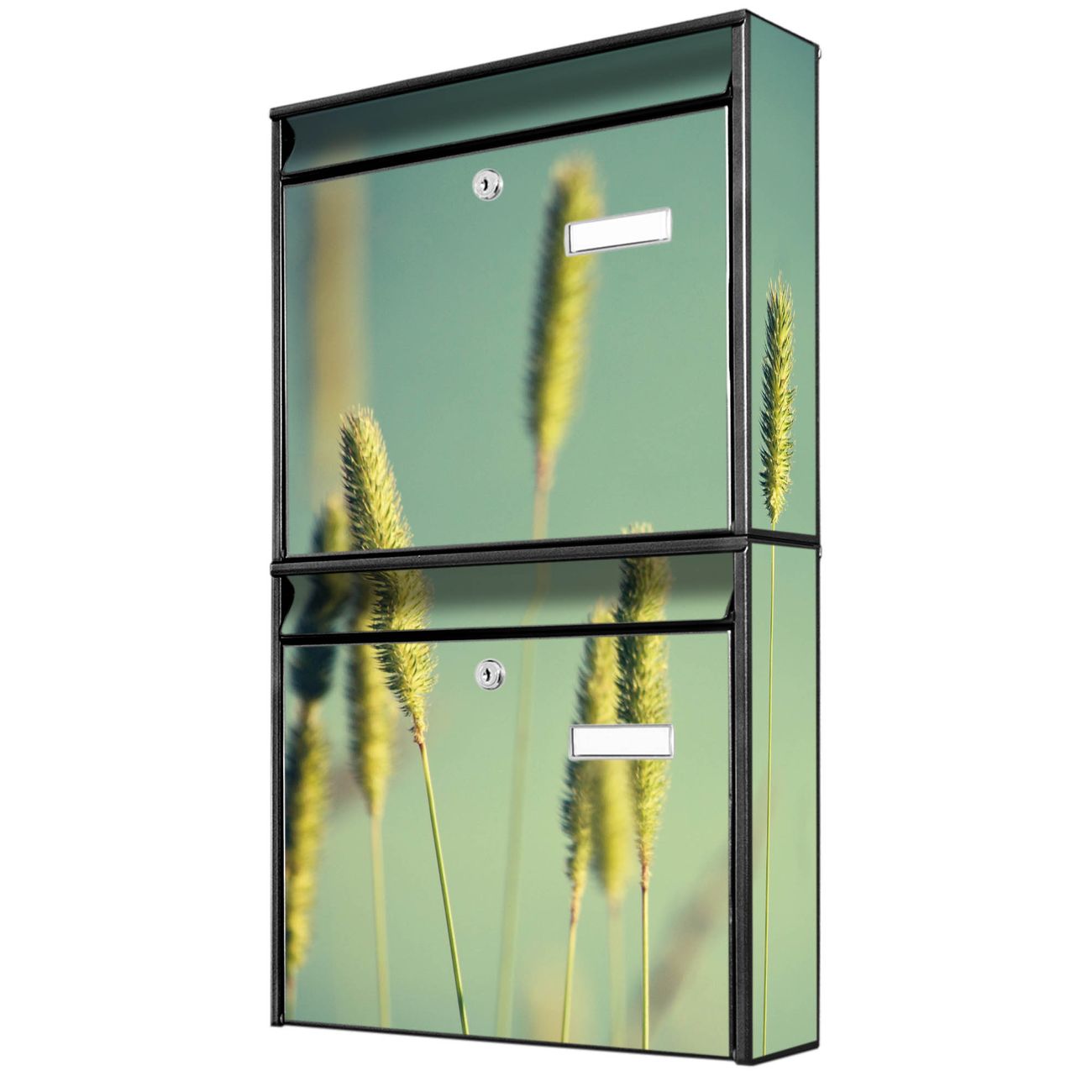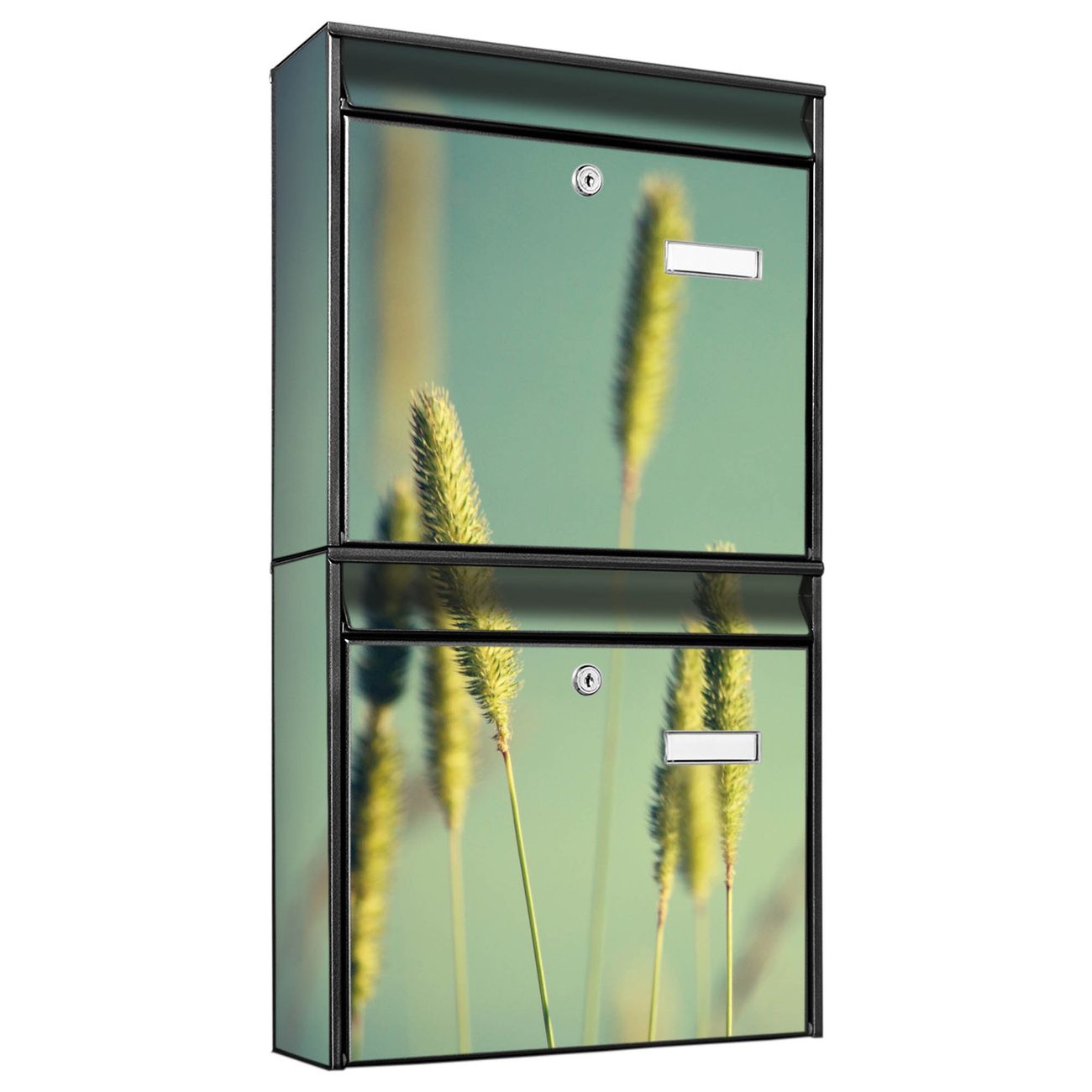 FUNKTION: Die Burg-Wächter Briefkastenanlage mit Motiv Ähren bietet Ihnen ausreichend Fassungsvermögen um auch A4 und C4 Sendungen zu empfangen. Das integrierte Namensschild lässt sich individuell beschriften. Wählen Sie aus den Grundfarben weiß, silber und schwarz. DESIGN: Die 2 Briefkästen haben ein ansprechendes und zeitloses Design, ohne dabei auf Funktionalität zu verzichten. Das Material ist sehr stabil, wetterfest und rostfrei. Durch das Motiv Ähren werden die Postkästen zu einem Blickfang. DETAILS: Die Postkästen bestehen aus verzinktem Stahl der zusätzlich mit Klarlack versiegelt wurde. Die Kästen sind gesamt 64,5cm hoch, 36,2cm breit und 10cm tief. Das Motiv besteht aus einer wetter- und UV-festen Folie, die Ihren Briefkasten zusätzlich vor Kratzern schützt. Die Postkästen werden mit Montagematerial, je einem Namensschild und je zwei Schlüsseln geliefert. NUTZEN: Das Briefkastenset eignet sich für die Wandmontage, die Größe bietet genügend Platz für Sendungen aller Art. Das zeitlose Design sowie die stabile Bauart bieten Ihnen einen treuen Begleiter für Ihre Post. BANJADO: