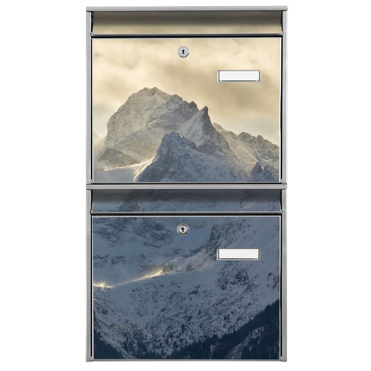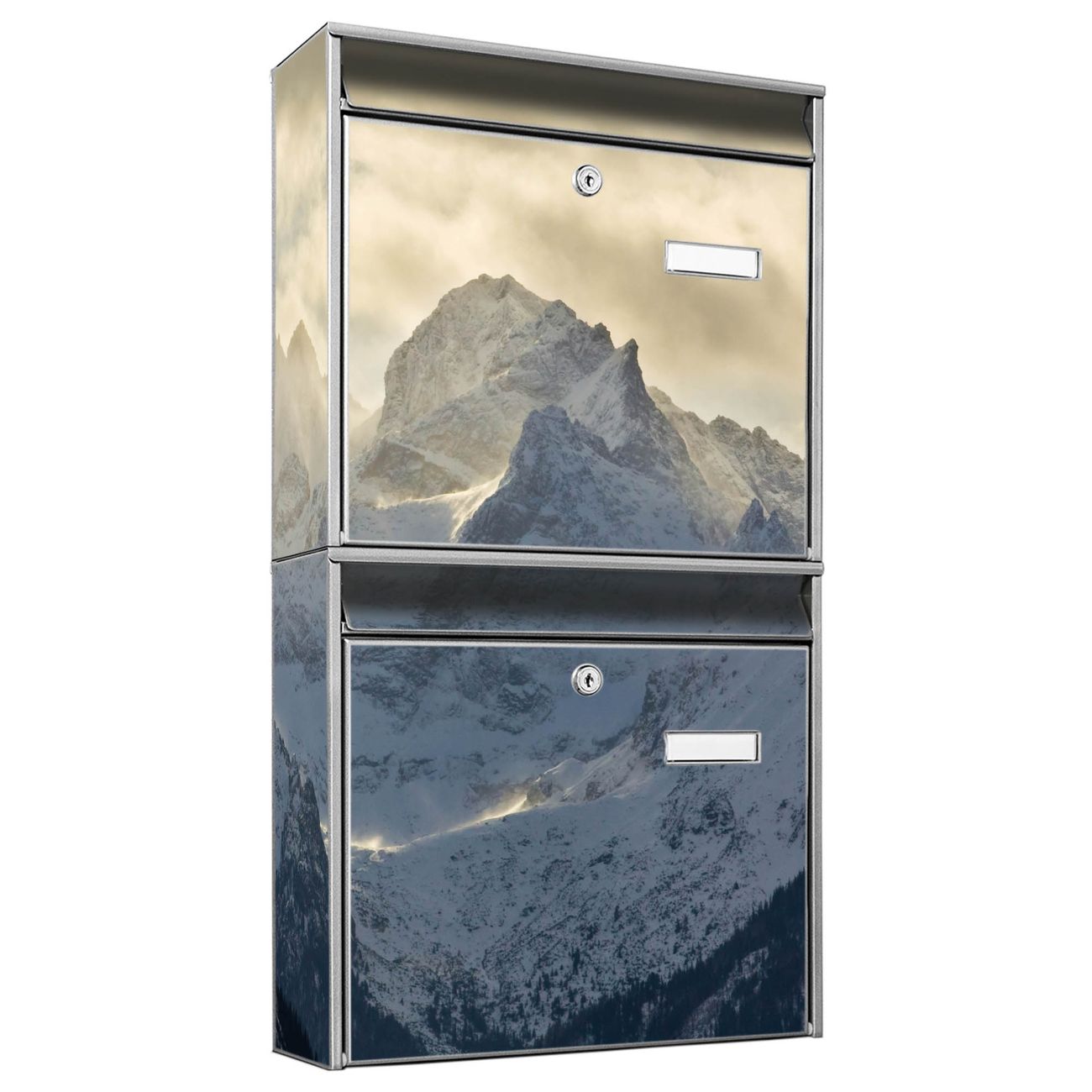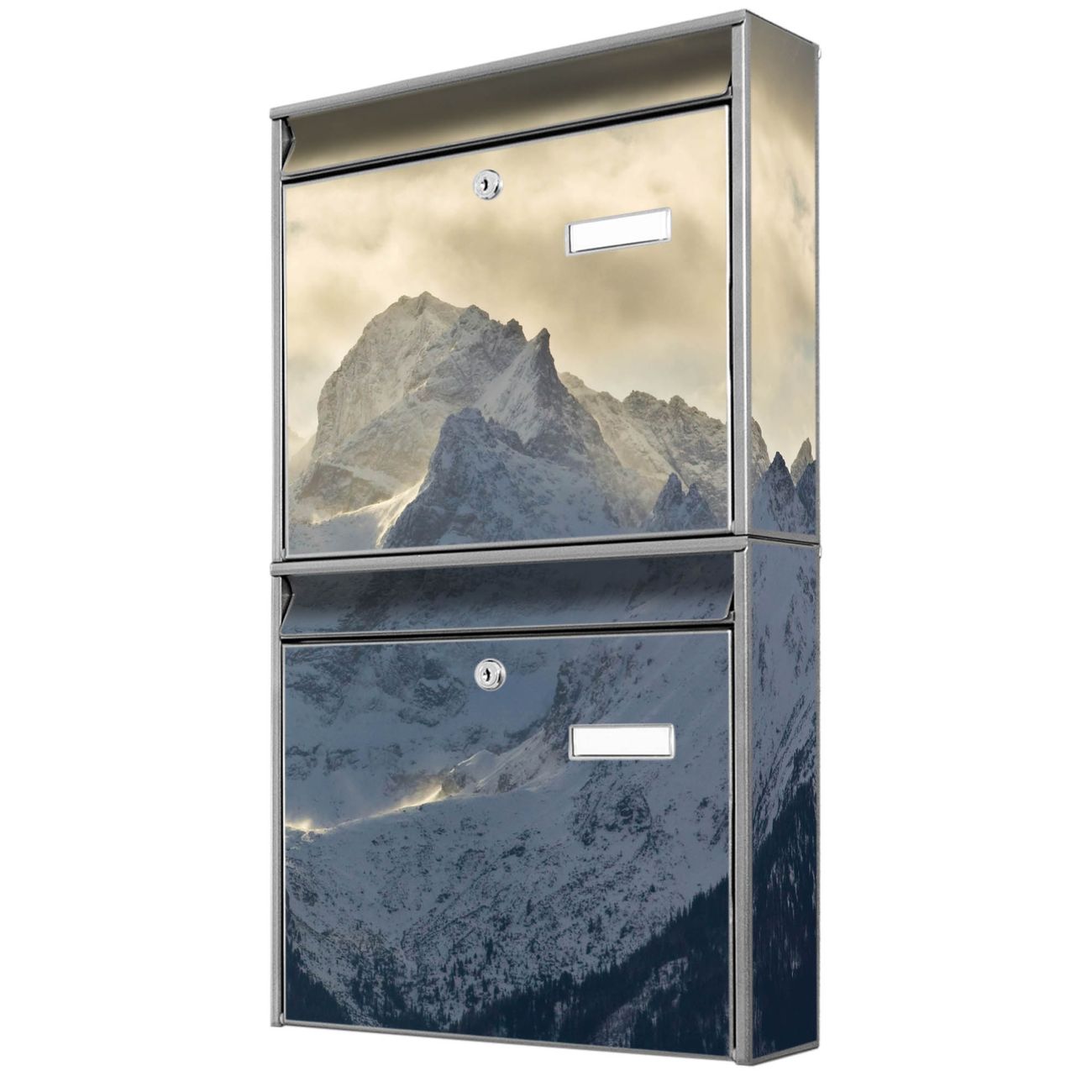 FUNKTION: Die Burg-Wächter Briefkastenanlage mit Motiv Alpen im Sonnenschein bietet Ihnen ausreichend Fassungsvermögen um auch A4 und C4 Sendungen zu empfangen. Das integrierte Namensschild lässt sich individuell beschriften. Wählen Sie aus den Grundfarben weiß, silber und schwarz. DESIGN: Die 2 Briefkästen haben ein ansprechendes und zeitloses Design, ohne dabei auf Funktionalität zu verzichten. Das Material ist sehr stabil, wetterfest und rostfrei. Durch das Motiv Alpen im Sonnenschein werden die Postkästen zu einem Blickfang. DETAILS: Die Postkästen bestehen aus verzinktem Stahl der zusätzlich mit Klarlack versiegelt wurde. Die Kästen sind gesamt 64,5cm hoch, 36,2cm breit und 10cm tief. Das Motiv besteht aus einer wetter- und UV-festen Folie, die Ihren Briefkasten zusätzlich vor Kratzern schützt. Die Postkästen werden mit Montagematerial, je einem Namensschild und je zwei Schlüsseln geliefert. NUTZEN: Das Briefkastenset eignet sich für die Wandmontage, die Größe bietet genügend Platz für Sendungen aller Art. Das zeitlose Design sowie die stabile Bauart bieten Ihnen einen treuen Begleiter für Ihre Post. BANJADO: