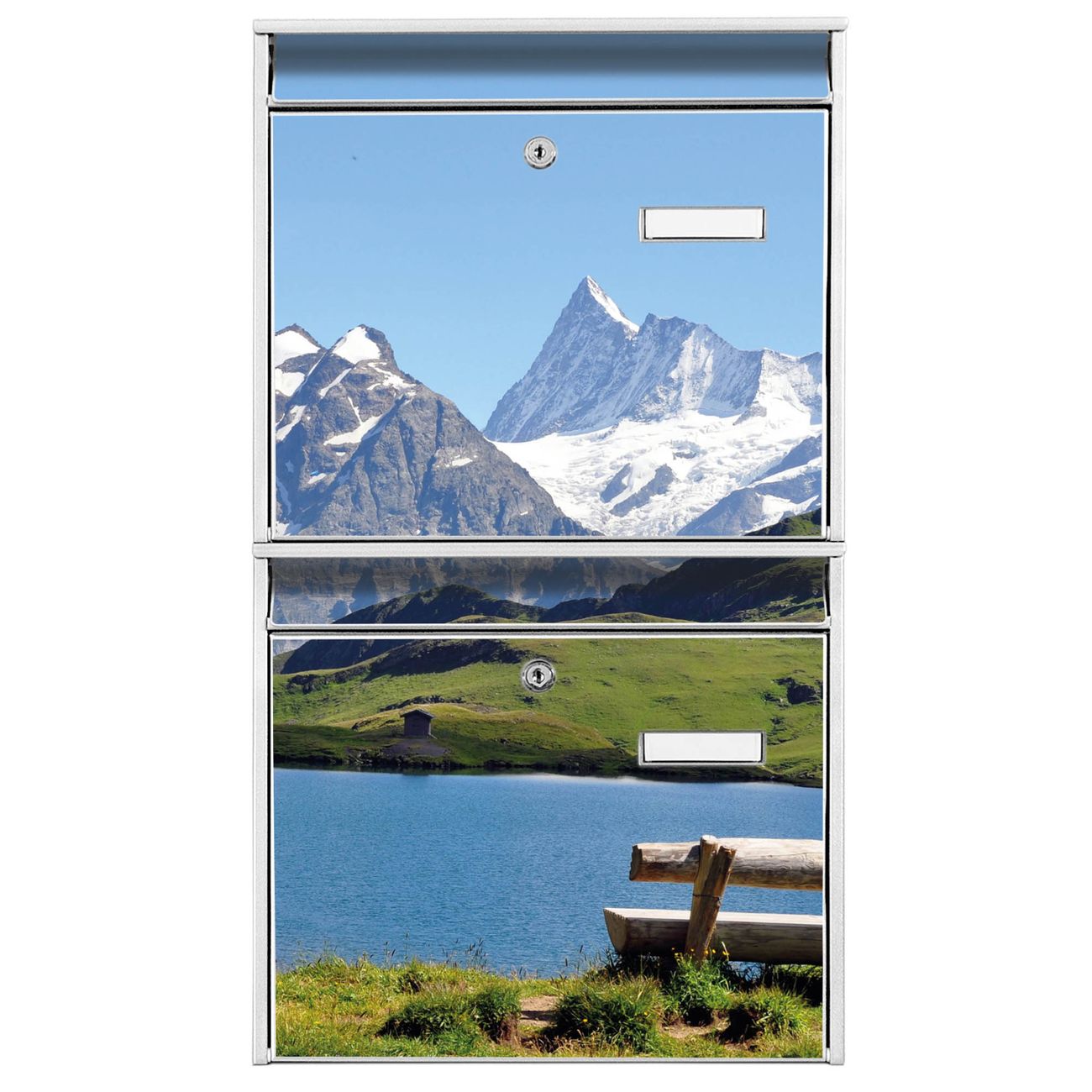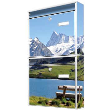FUNKTION: Die Burg-Wächter Briefkastenanlage mit Motiv Alpen bietet Ihnen ausreichend Fassungsvermögen um auch A4 und C4 Sendungen zu empfangen. Das integrierte Namensschild lässt sich individuell beschriften. Wählen Sie aus den Grundfarben weiß, silber und schwarz. DESIGN: Die 2 Briefkästen haben ein ansprechendes und zeitloses Design, ohne dabei auf Funktionalität zu verzichten. Das Material ist sehr stabil, wetterfest und rostfrei. Durch das Motiv Alpen werden die Postkästen zu einem Blickfang. DETAILS: Die Postkästen bestehen aus verzinktem Stahl der zusätzlich mit Klarlack versiegelt wurde. Die Kästen sind gesamt 64,5cm hoch, 36,2cm breit und 10cm tief. Das Motiv besteht aus einer wetter- und UV-festen Folie, die Ihren Briefkasten zusätzlich vor Kratzern schützt. Die Postkästen werden mit Montagematerial, je einem Namensschild und je zwei Schlüsseln geliefert. NUTZEN: Das Briefkastenset eignet sich für die Wandmontage, die Größe bietet genügend Platz für Sendungen aller Art. Das zeitlose Design sowie die stabile Bauart bieten Ihnen einen treuen Begleiter für Ihre Post. BANJADO: