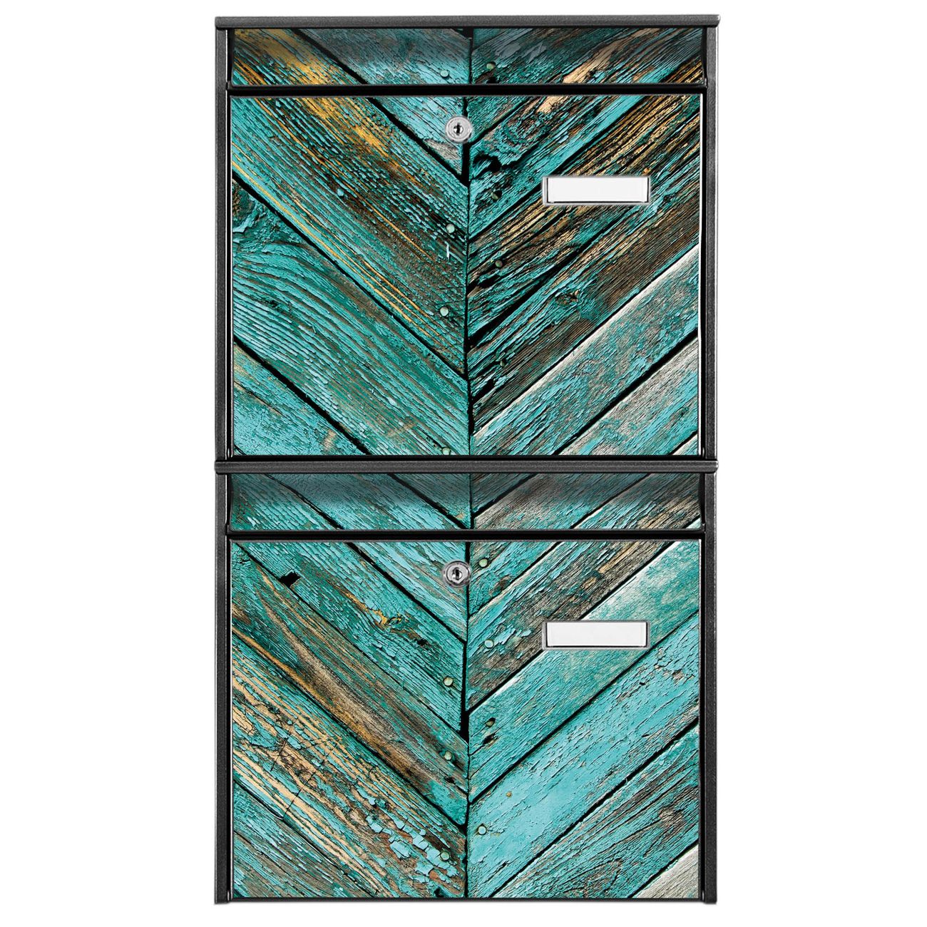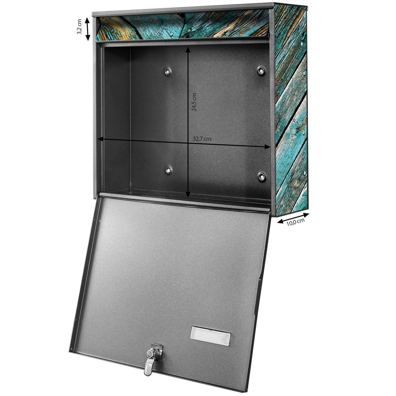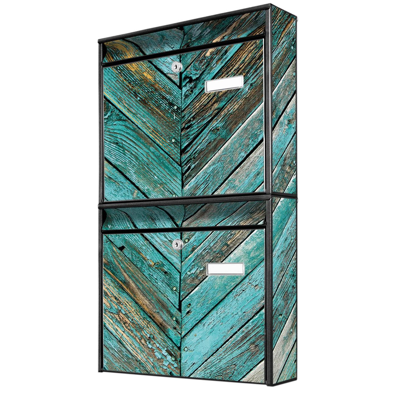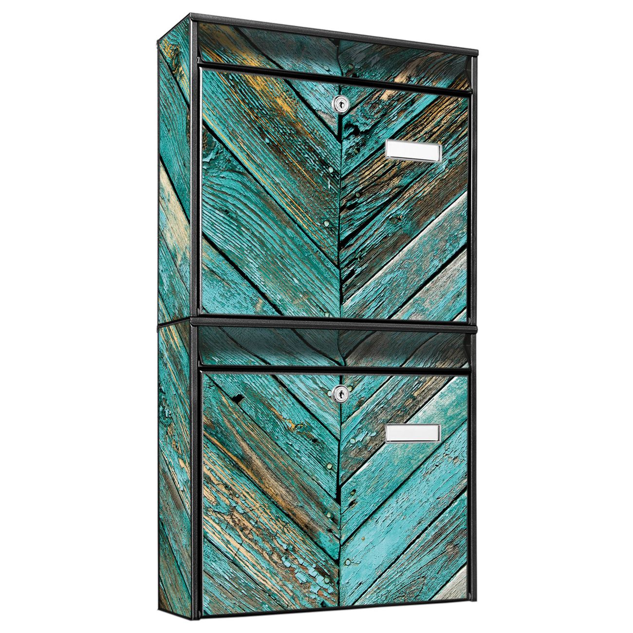 FUNKTION: Die Burg-Wächter Briefkastenanlage mit Motiv Altes Holz Blau bietet Ihnen ausreichend Fassungsvermögen um auch A4 und C4 Sendungen zu empfangen. Das integrierte Namensschild lässt sich individuell beschriften. Wählen Sie aus den Grundfarben weiß, silber und schwarz. DESIGN: Die 2 Briefkästen haben ein ansprechendes und zeitloses Design, ohne dabei auf Funktionalität zu verzichten. Das Material ist sehr stabil, wetterfest und rostfrei. Durch das Motiv Altes Holz Blau werden die Postkästen zu einem Blickfang. DETAILS: Die Postkästen bestehen aus verzinktem Stahl der zusätzlich mit Klarlack versiegelt wurde. Die Kästen sind gesamt 64,5cm hoch, 36,2cm breit und 10cm tief. Das Motiv besteht aus einer wetter- und UV-festen Folie, die Ihren Briefkasten zusätzlich vor Kratzern schützt. Die Postkästen werden mit Montagematerial, je einem Namensschild und je zwei Schlüsseln geliefert. NUTZEN: Das Briefkastenset eignet sich für die Wandmontage, die Größe bietet genügend Platz für Sendungen aller Art. Das zeitlose Design sowie die stabile Bauart bieten Ihnen einen treuen Begleiter für Ihre Post. BANJADO: