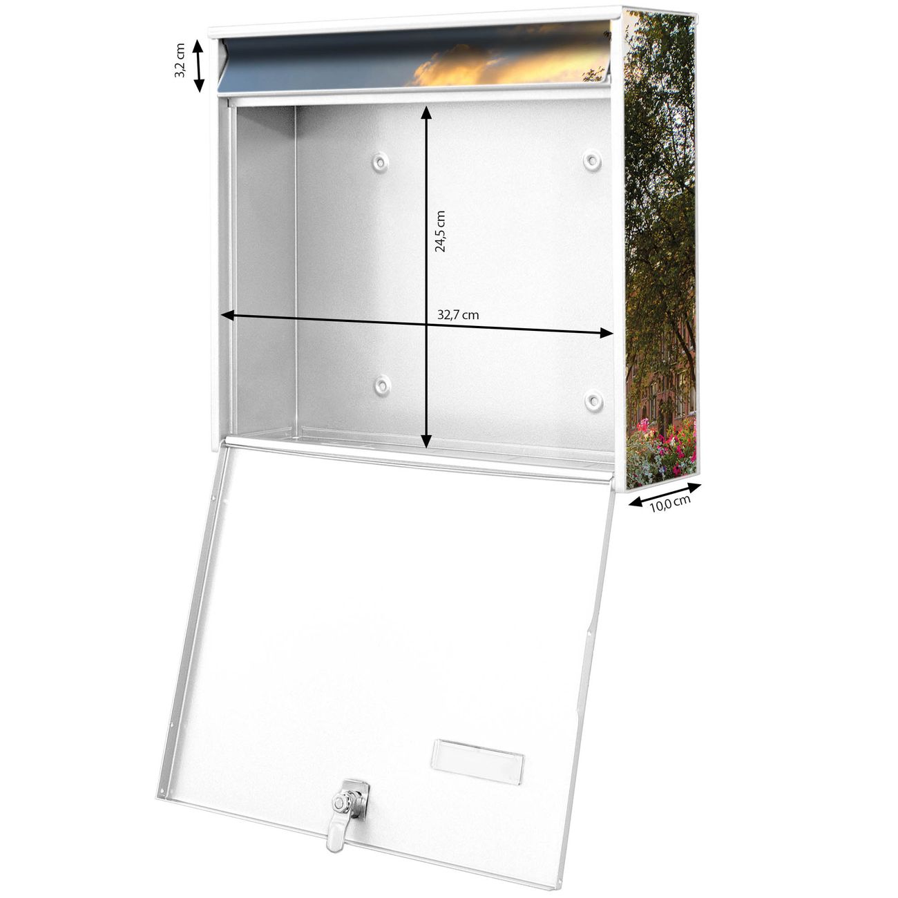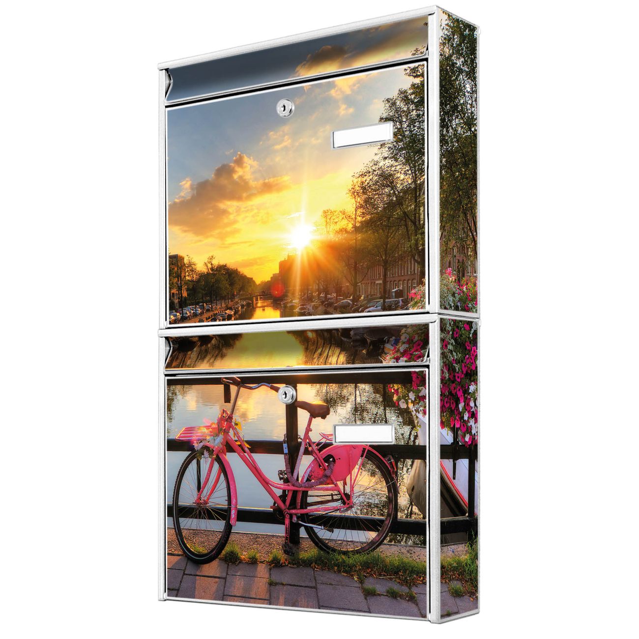 FUNKTION: Die Burg-Wächter Briefkastenanlage mit Motiv Amsterdam Mit Rad bietet Ihnen ausreichend Fassungsvermögen um auch A4 und C4 Sendungen zu empfangen. Das integrierte Namensschild lässt sich individuell beschriften. Wählen Sie aus den Grundfarben weiß, silber und schwarz. DESIGN: Die 2 Briefkästen haben ein ansprechendes und zeitloses Design, ohne dabei auf Funktionalität zu verzichten. Das Material ist sehr stabil, wetterfest und rostfrei. Durch das Motiv Amsterdam Mit Rad werden die Postkästen zu einem Blickfang. DETAILS: Die Postkästen bestehen aus verzinktem Stahl der zusätzlich mit Klarlack versiegelt wurde. Die Kästen sind gesamt 64,5cm hoch, 36,2cm breit und 10cm tief. Das Motiv besteht aus einer wetter- und UV-festen Folie, die Ihren Briefkasten zusätzlich vor Kratzern schützt. Die Postkästen werden mit Montagematerial, je einem Namensschild und je zwei Schlüsseln geliefert. NUTZEN: Das Briefkastenset eignet sich für die Wandmontage, die Größe bietet genügend Platz für Sendungen aller Art. Das zeitlose Design sowie die stabile Bauart bieten Ihnen einen treuen Begleiter für Ihre Post. BANJADO: