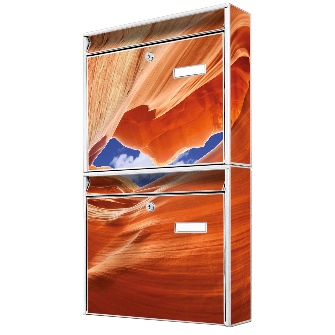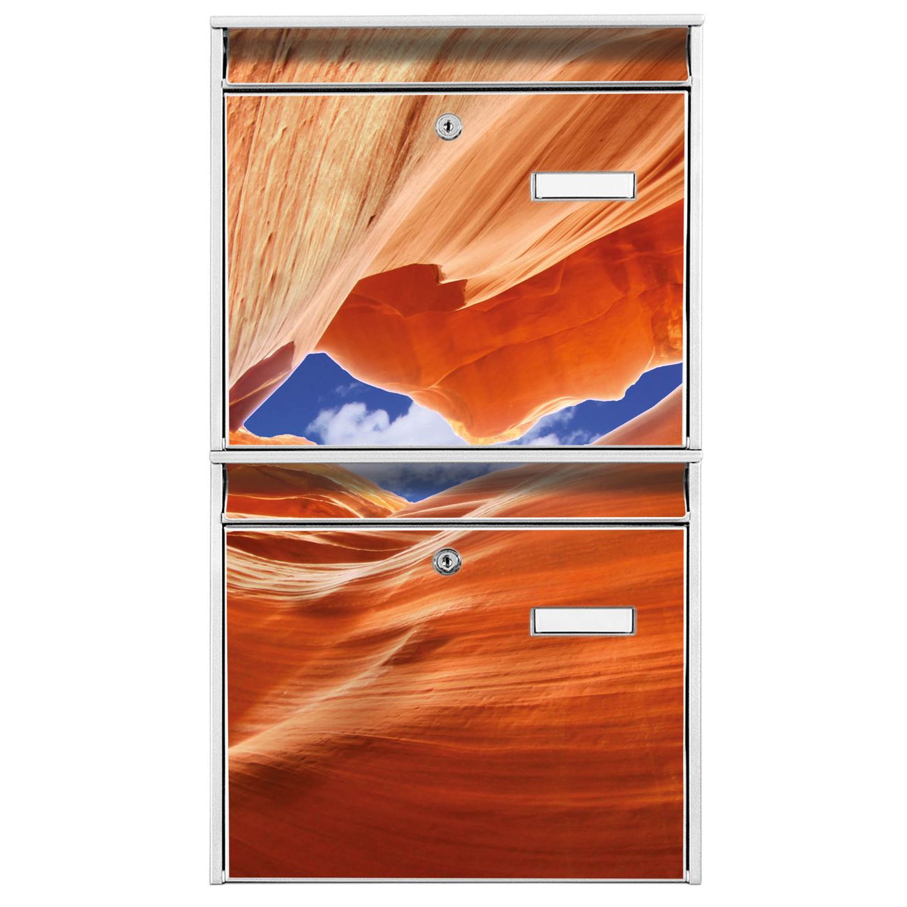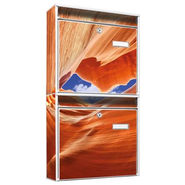 FUNKTION: Die Burg-Wächter Briefkastenanlage mit Motiv Antelope Canyon 3 bietet Ihnen ausreichend Fassungsvermögen um auch A4 und C4 Sendungen zu empfangen. Das integrierte Namensschild lässt sich individuell beschriften. Wählen Sie aus den Grundfarben weiß, silber und schwarz. DESIGN: Die 2 Briefkästen haben ein ansprechendes und zeitloses Design, ohne dabei auf Funktionalität zu verzichten. Das Material ist sehr stabil, wetterfest und rostfrei. Durch das Motiv Antelope Canyon 3 werden die Postkästen zu einem Blickfang. DETAILS: Die Postkästen bestehen aus verzinktem Stahl der zusätzlich mit Klarlack versiegelt wurde. Die Kästen sind gesamt 64,5cm hoch, 36,2cm breit und 10cm tief. Das Motiv besteht aus einer wetter- und UV-festen Folie, die Ihren Briefkasten zusätzlich vor Kratzern schützt. Die Postkästen werden mit Montagematerial, je einem Namensschild und je zwei Schlüsseln geliefert. NUTZEN: Das Briefkastenset eignet sich für die Wandmontage, die Größe bietet genügend Platz für Sendungen aller Art. Das zeitlose Design sowie die stabile Bauart bieten Ihnen einen treuen Begleiter für Ihre Post. BANJADO: