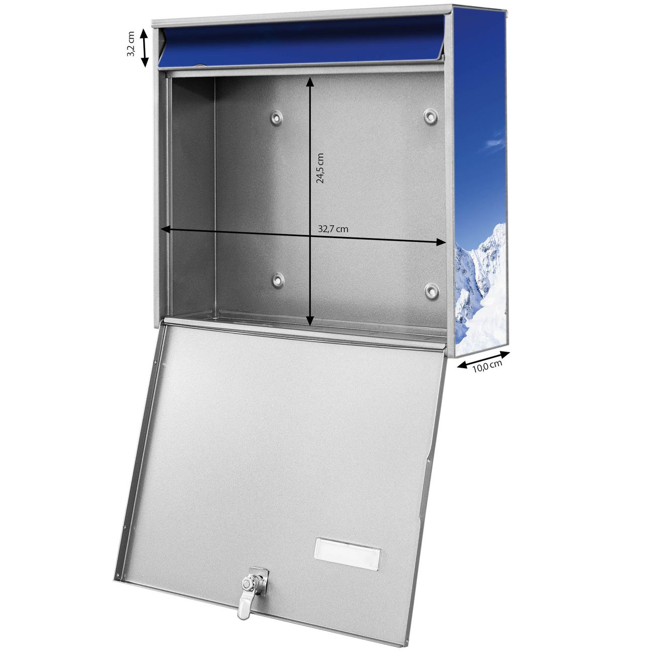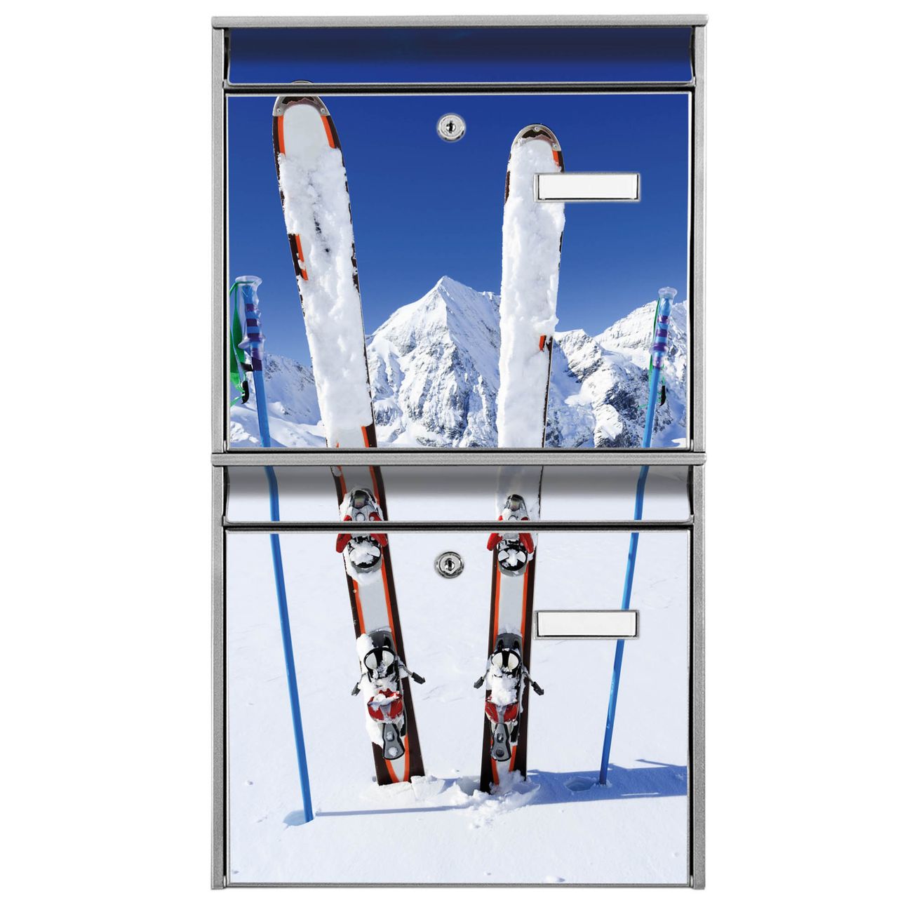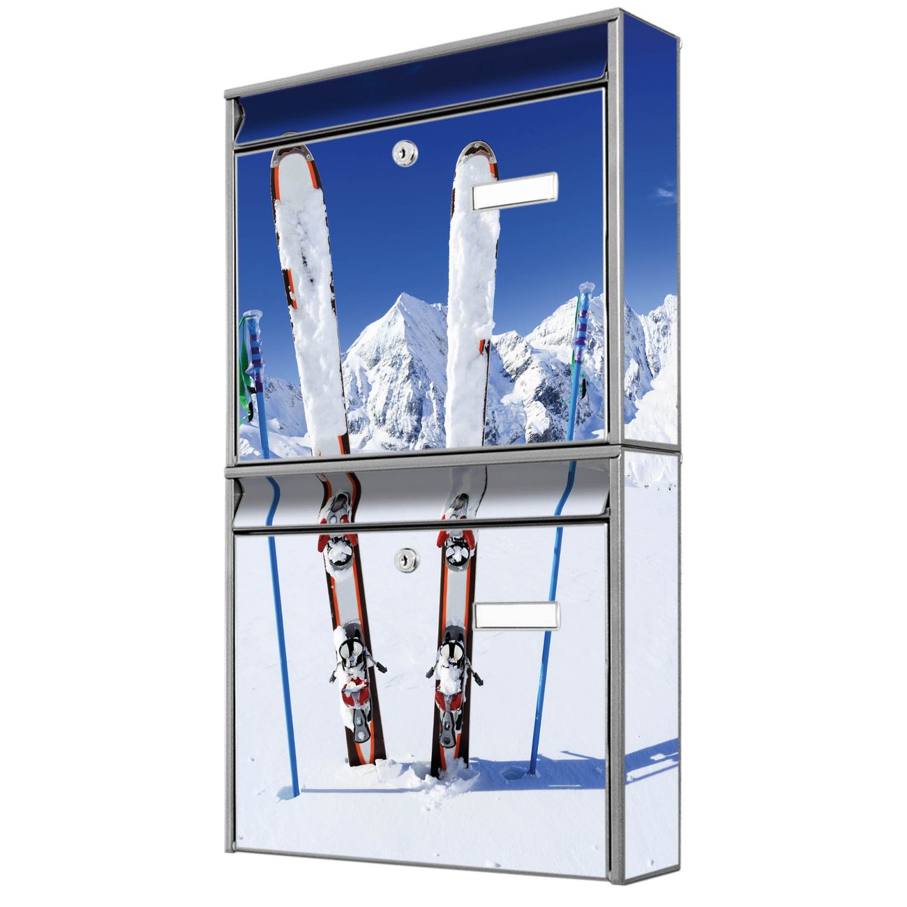 FUNKTION: Die Burg-Wächter Briefkastenanlage mit Motiv Apres Ski bietet Ihnen ausreichend Fassungsvermögen um auch A4 und C4 Sendungen zu empfangen. Das integrierte Namensschild lässt sich individuell beschriften. Wählen Sie aus den Grundfarben weiß, silber und schwarz. DESIGN: Die 2 Briefkästen haben ein ansprechendes und zeitloses Design, ohne dabei auf Funktionalität zu verzichten. Das Material ist sehr stabil, wetterfest und rostfrei. Durch das Motiv Apres Ski werden die Postkästen zu einem Blickfang. DETAILS: Die Postkästen bestehen aus verzinktem Stahl der zusätzlich mit Klarlack versiegelt wurde. Die Kästen sind gesamt 64,5cm hoch, 36,2cm breit und 10cm tief. Das Motiv besteht aus einer wetter- und UV-festen Folie, die Ihren Briefkasten zusätzlich vor Kratzern schützt. Die Postkästen werden mit Montagematerial, je einem Namensschild und je zwei Schlüsseln geliefert. NUTZEN: Das Briefkastenset eignet sich für die Wandmontage, die Größe bietet genügend Platz für Sendungen aller Art. Das zeitlose Design sowie die stabile Bauart bieten Ihnen einen treuen Begleiter für Ihre Post. BANJADO: