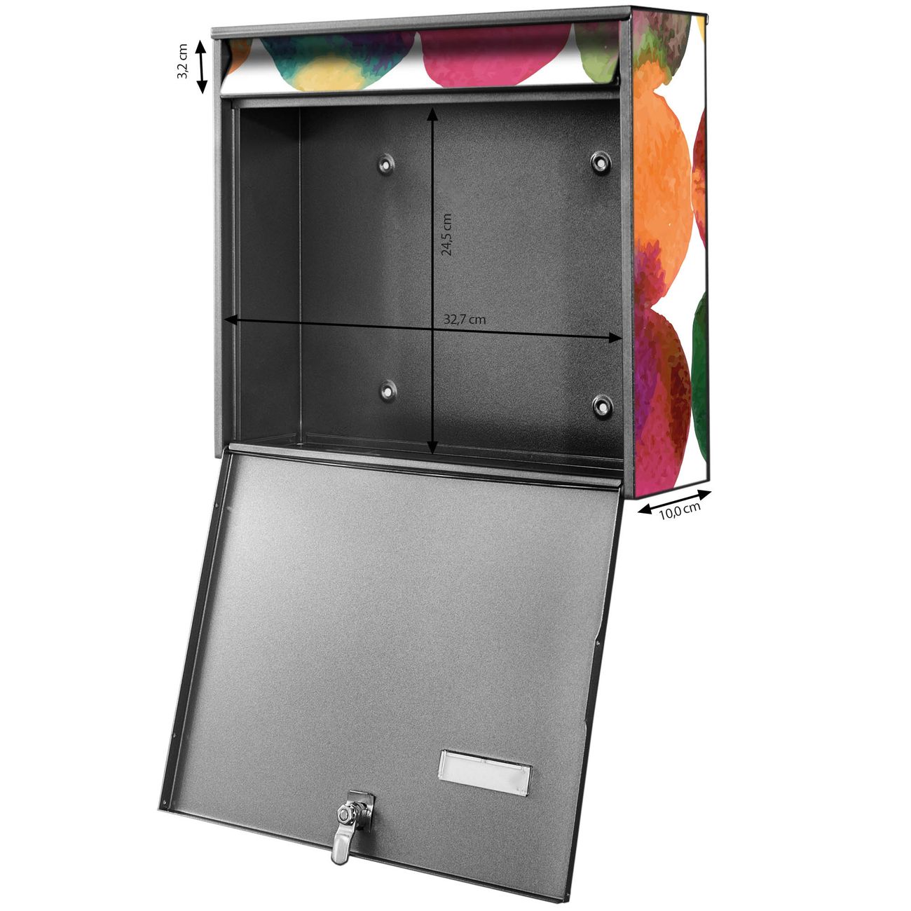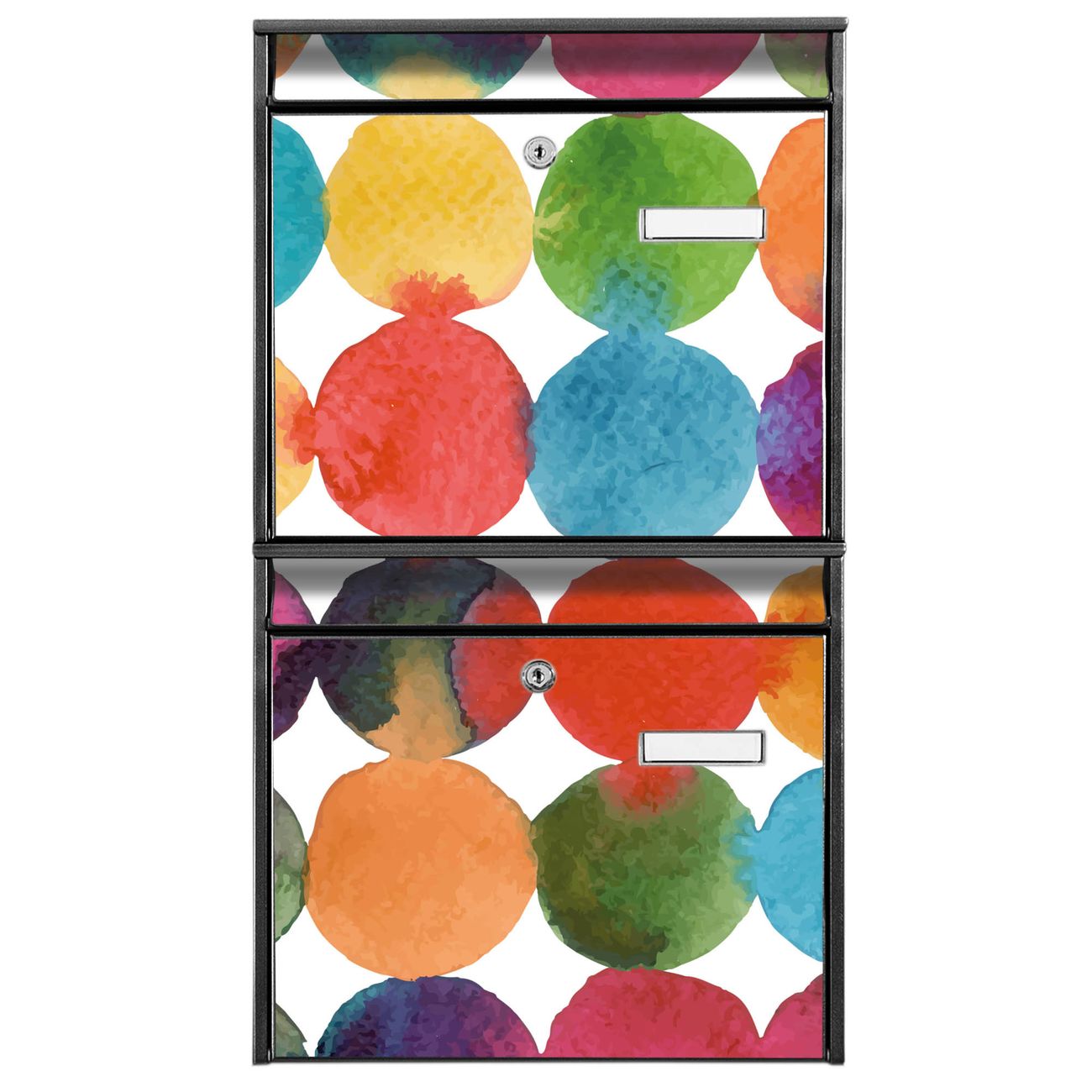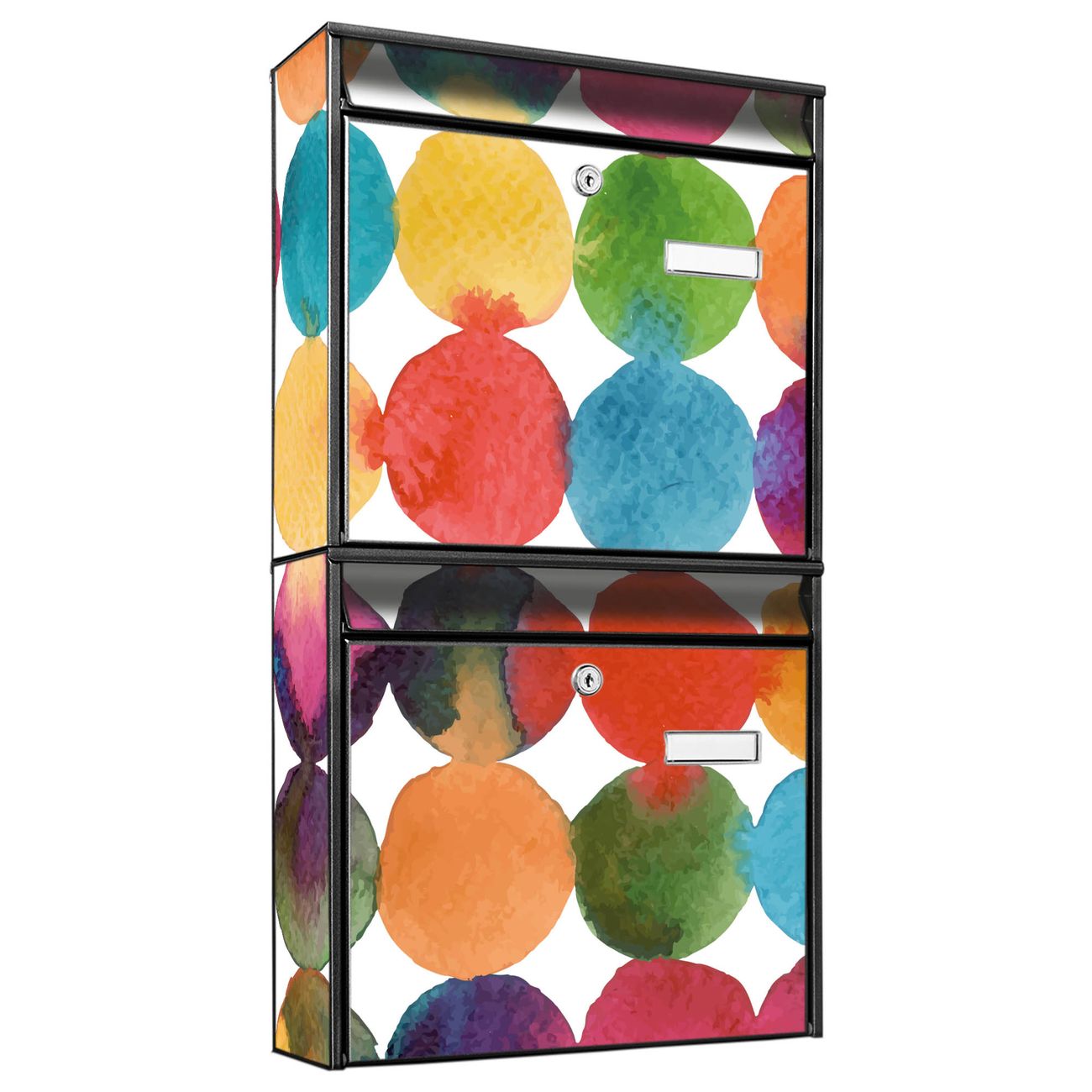 FUNKTION: Die Burg-Wächter Briefkastenanlage mit Motiv Aquarell Kreise bietet Ihnen ausreichend Fassungsvermögen um auch A4 und C4 Sendungen zu empfangen. Das integrierte Namensschild lässt sich individuell beschriften. Wählen Sie aus den Grundfarben weiß, silber und schwarz. DESIGN: Die 2 Briefkästen haben ein ansprechendes und zeitloses Design, ohne dabei auf Funktionalität zu verzichten. Das Material ist sehr stabil, wetterfest und rostfrei. Durch das Motiv Aquarell Kreise werden die Postkästen zu einem Blickfang. DETAILS: Die Postkästen bestehen aus verzinktem Stahl der zusätzlich mit Klarlack versiegelt wurde. Die Kästen sind gesamt 64,5cm hoch, 36,2cm breit und 10cm tief. Das Motiv besteht aus einer wetter- und UV-festen Folie, die Ihren Briefkasten zusätzlich vor Kratzern schützt. Die Postkästen werden mit Montagematerial, je einem Namensschild und je zwei Schlüsseln geliefert. NUTZEN: Das Briefkastenset eignet sich für die Wandmontage, die Größe bietet genügend Platz für Sendungen aller Art. Das zeitlose Design sowie die stabile Bauart bieten Ihnen einen treuen Begleiter für Ihre Post. BANJADO: