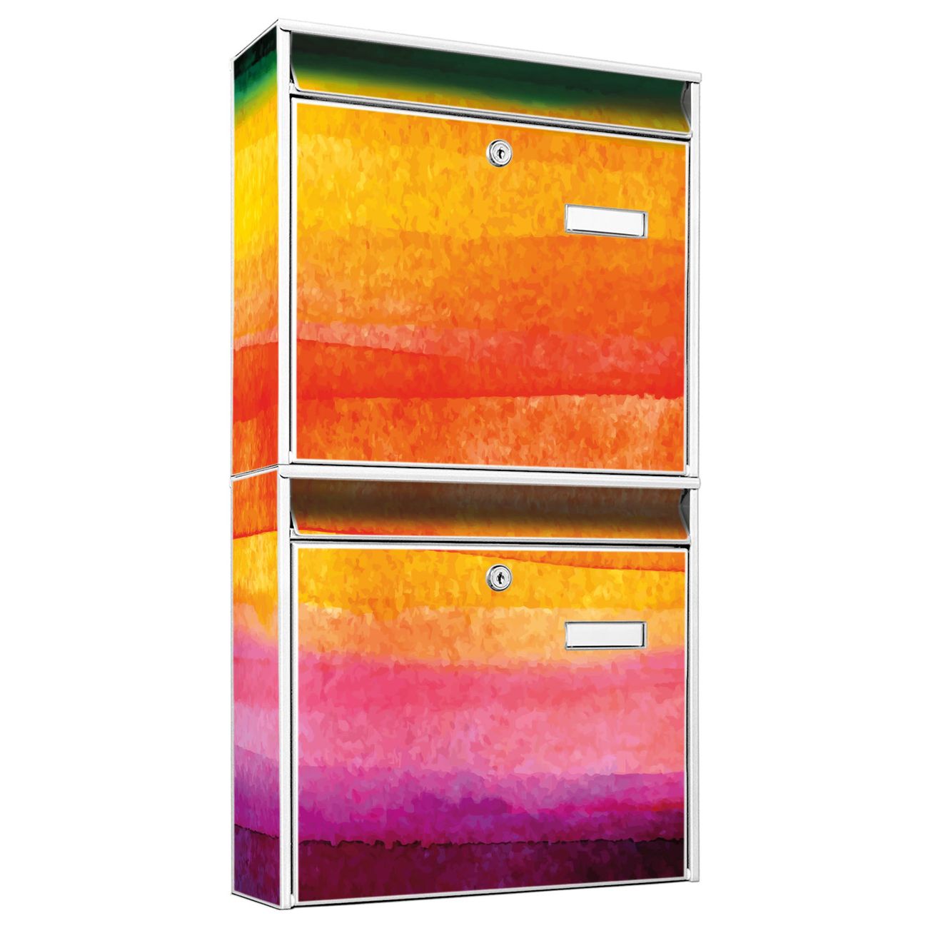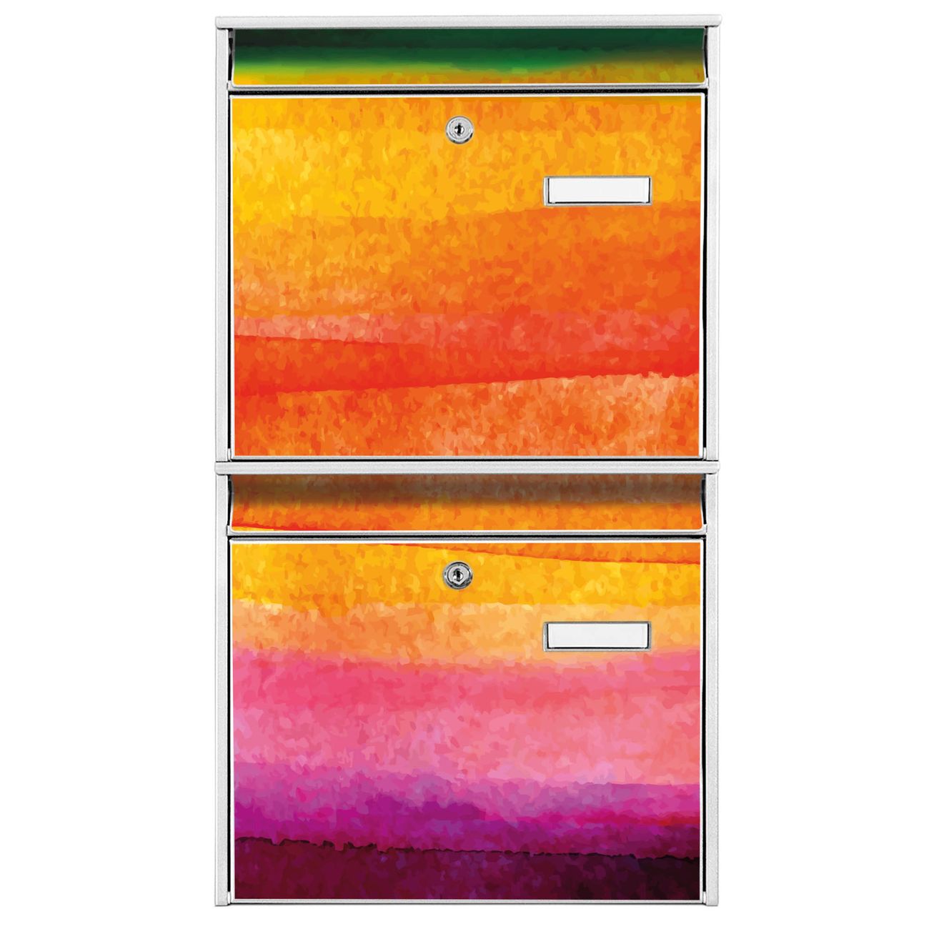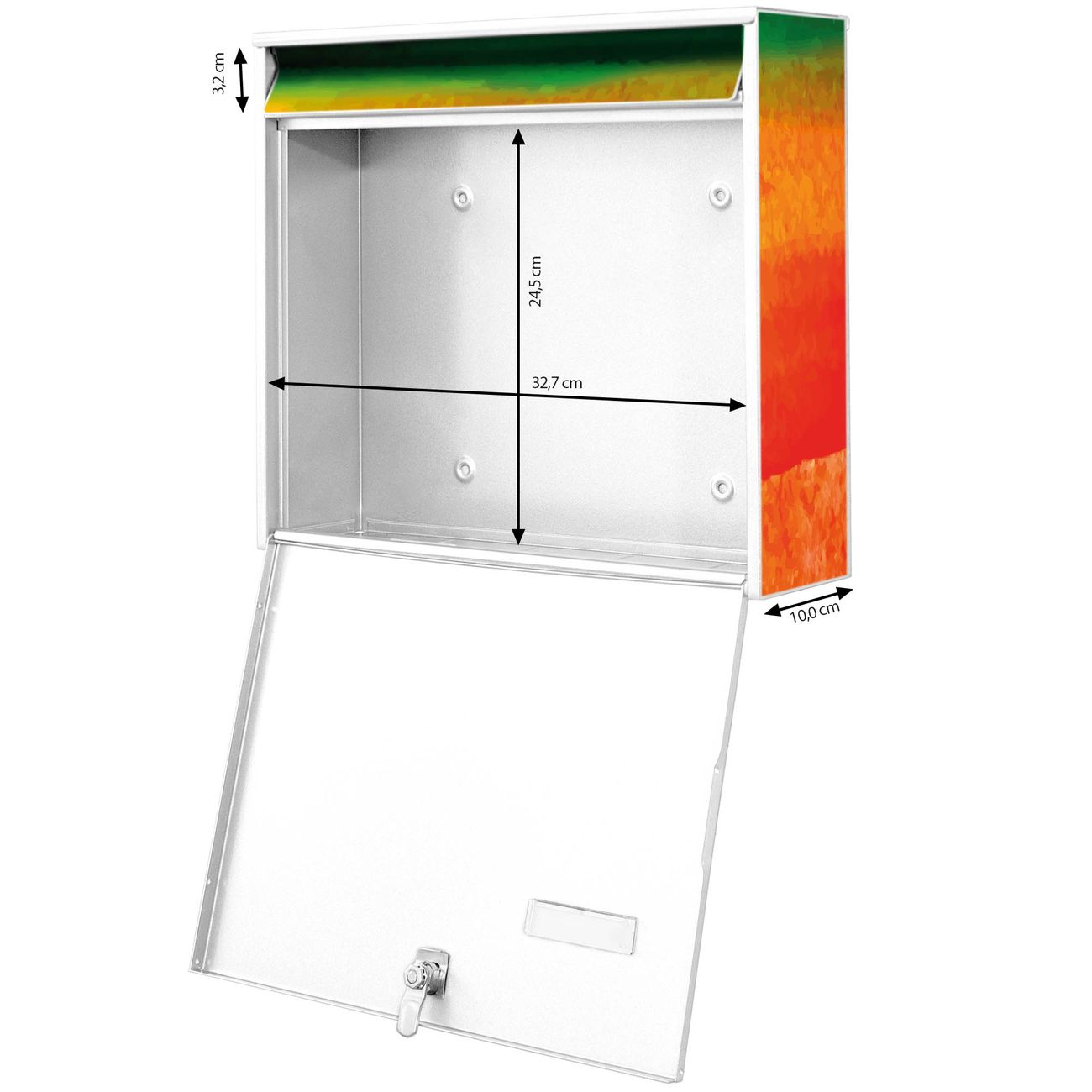 FUNKTION: Die Burg-Wächter Briefkastenanlage mit Motiv Aquarell bietet Ihnen ausreichend Fassungsvermögen um auch A4 und C4 Sendungen zu empfangen. Das integrierte Namensschild lässt sich individuell beschriften. Wählen Sie aus den Grundfarben weiß, silber und schwarz. DESIGN: Die 2 Briefkästen haben ein ansprechendes und zeitloses Design, ohne dabei auf Funktionalität zu verzichten. Das Material ist sehr stabil, wetterfest und rostfrei. Durch das Motiv Aquarell werden die Postkästen zu einem Blickfang. DETAILS: Die Postkästen bestehen aus verzinktem Stahl der zusätzlich mit Klarlack versiegelt wurde. Die Kästen sind gesamt 64,5cm hoch, 36,2cm breit und 10cm tief. Das Motiv besteht aus einer wetter- und UV-festen Folie, die Ihren Briefkasten zusätzlich vor Kratzern schützt. Die Postkästen werden mit Montagematerial, je einem Namensschild und je zwei Schlüsseln geliefert. NUTZEN: Das Briefkastenset eignet sich für die Wandmontage, die Größe bietet genügend Platz für Sendungen aller Art. Das zeitlose Design sowie die stabile Bauart bieten Ihnen einen treuen Begleiter für Ihre Post. BANJADO: